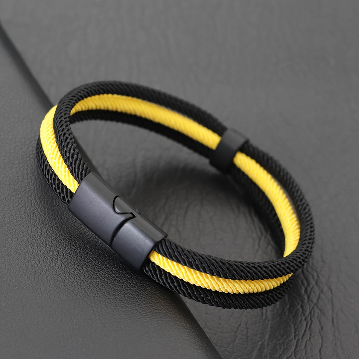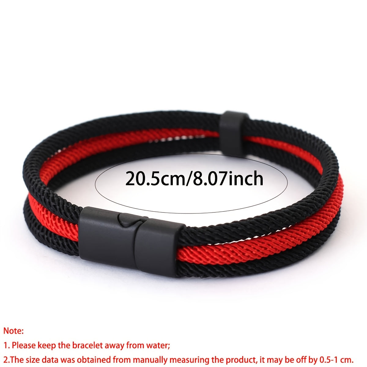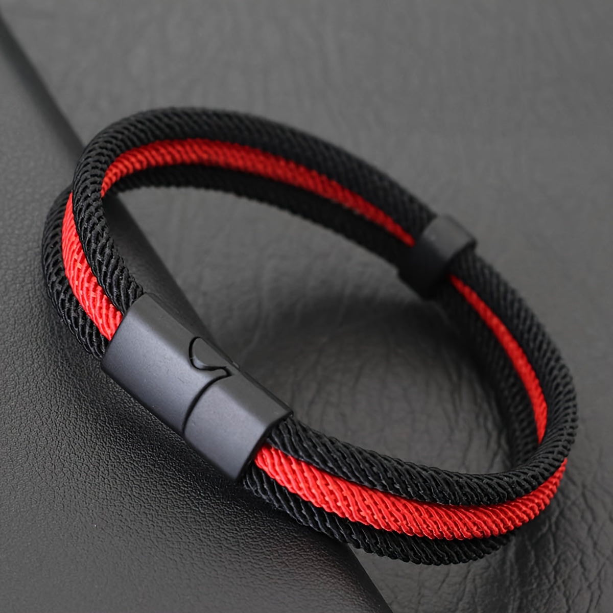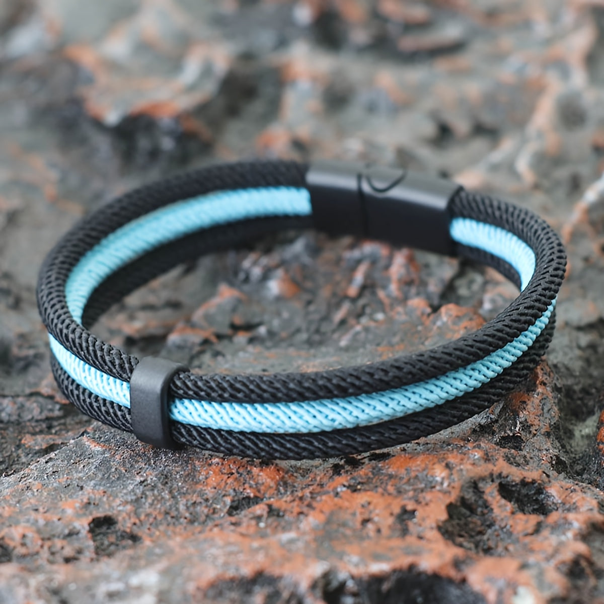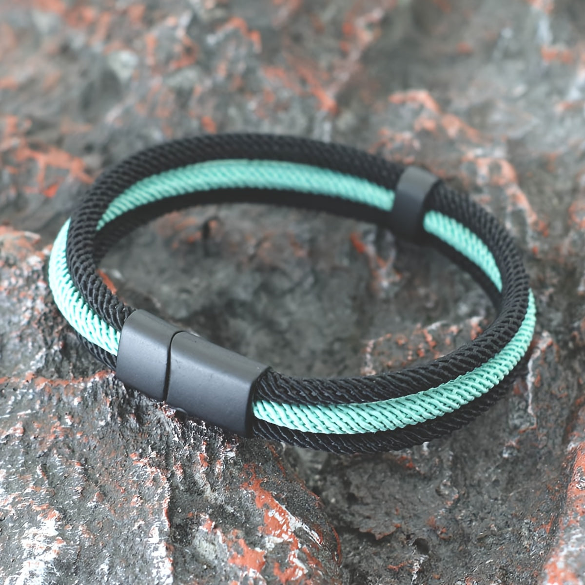 This casual nylon rope bracelet features a 4mm Milanese cord in navy and green colors. It is perfect for outdoor sports and has a detachable clasp.