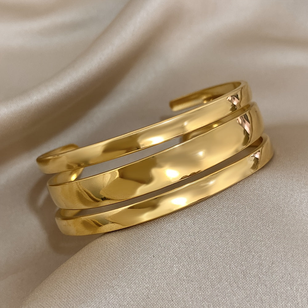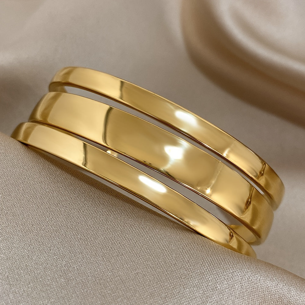 This open bangle bracelet is crafted from durable stainless steel with a polished golden finish. It offers a comfortable fit for both casual and formal wear, making it a stylish accessory for any occasion.