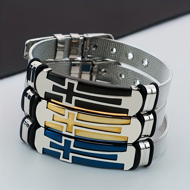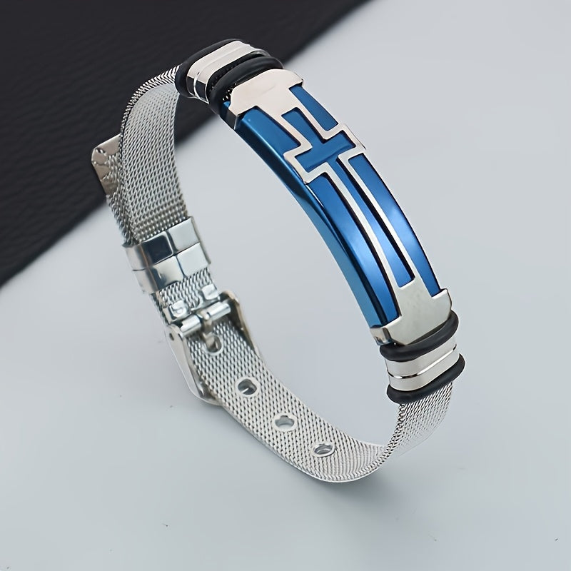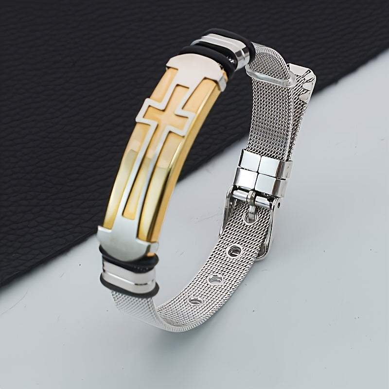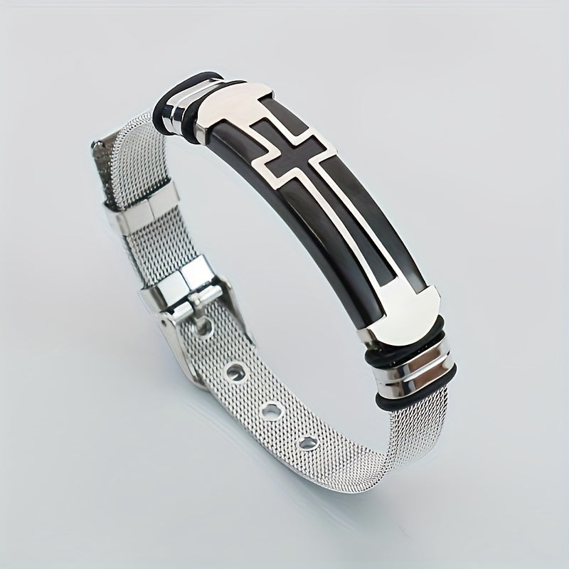 This men's bracelet features a 304 stainless steel cross pendant on an adjustable chain. Perfect for everyday wear or as a gift for someone special.