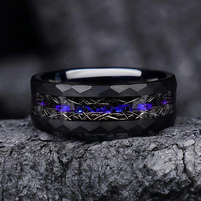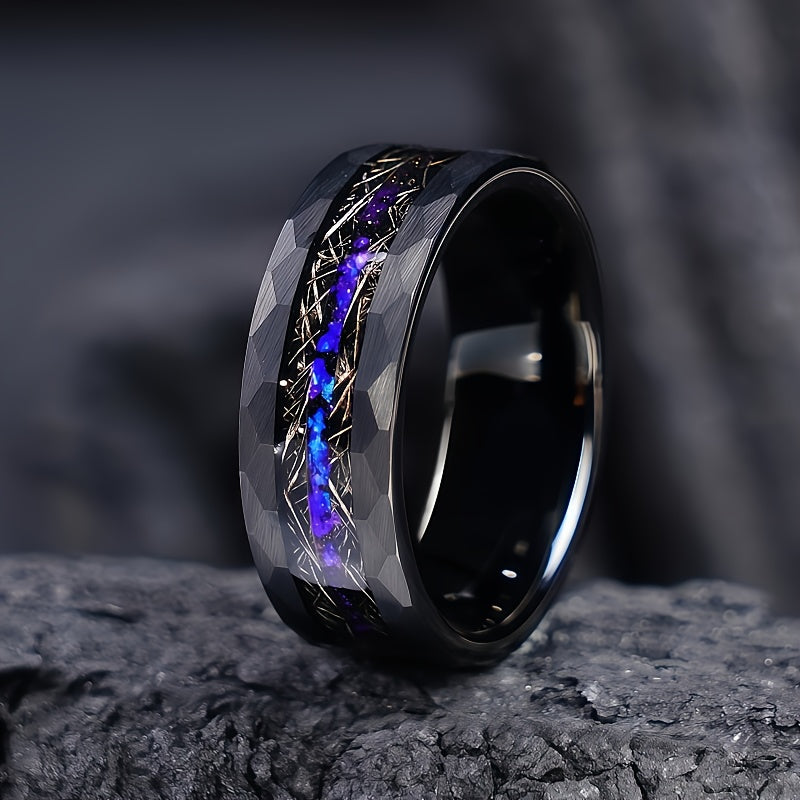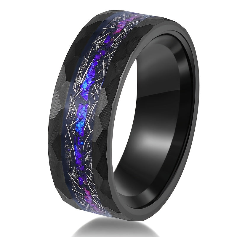 This 8mm stainless steel ring features a synthetic galaxy opal with hammered meteorite design, making it perfect for engagements, weddings, or as a gift for him.