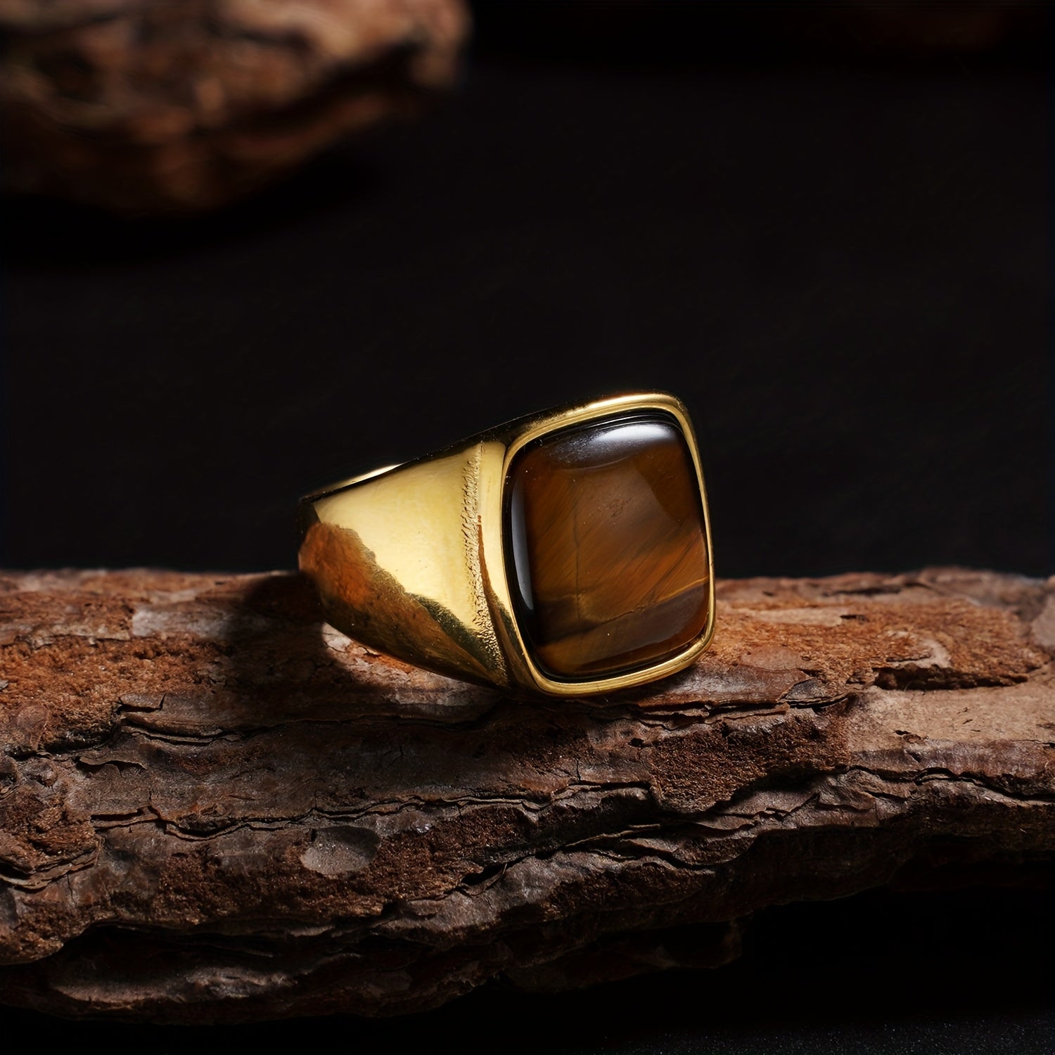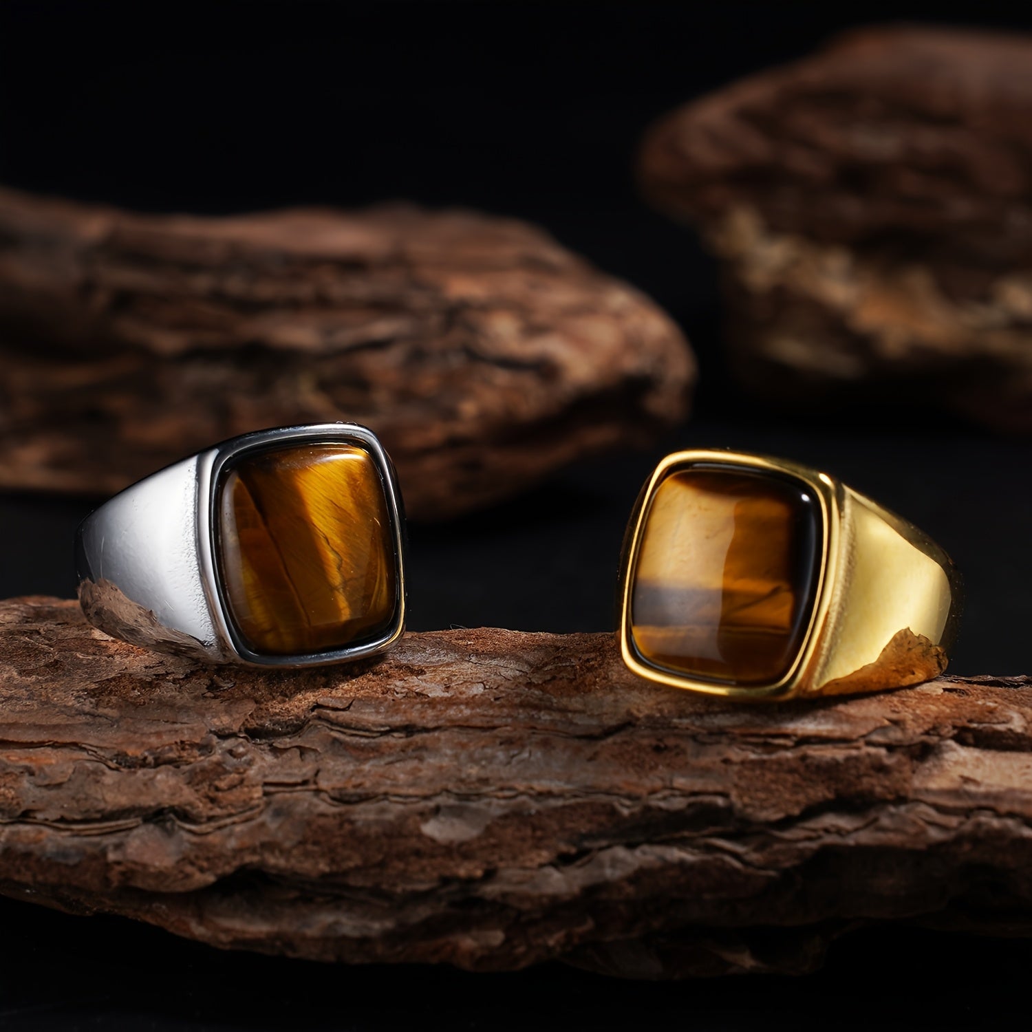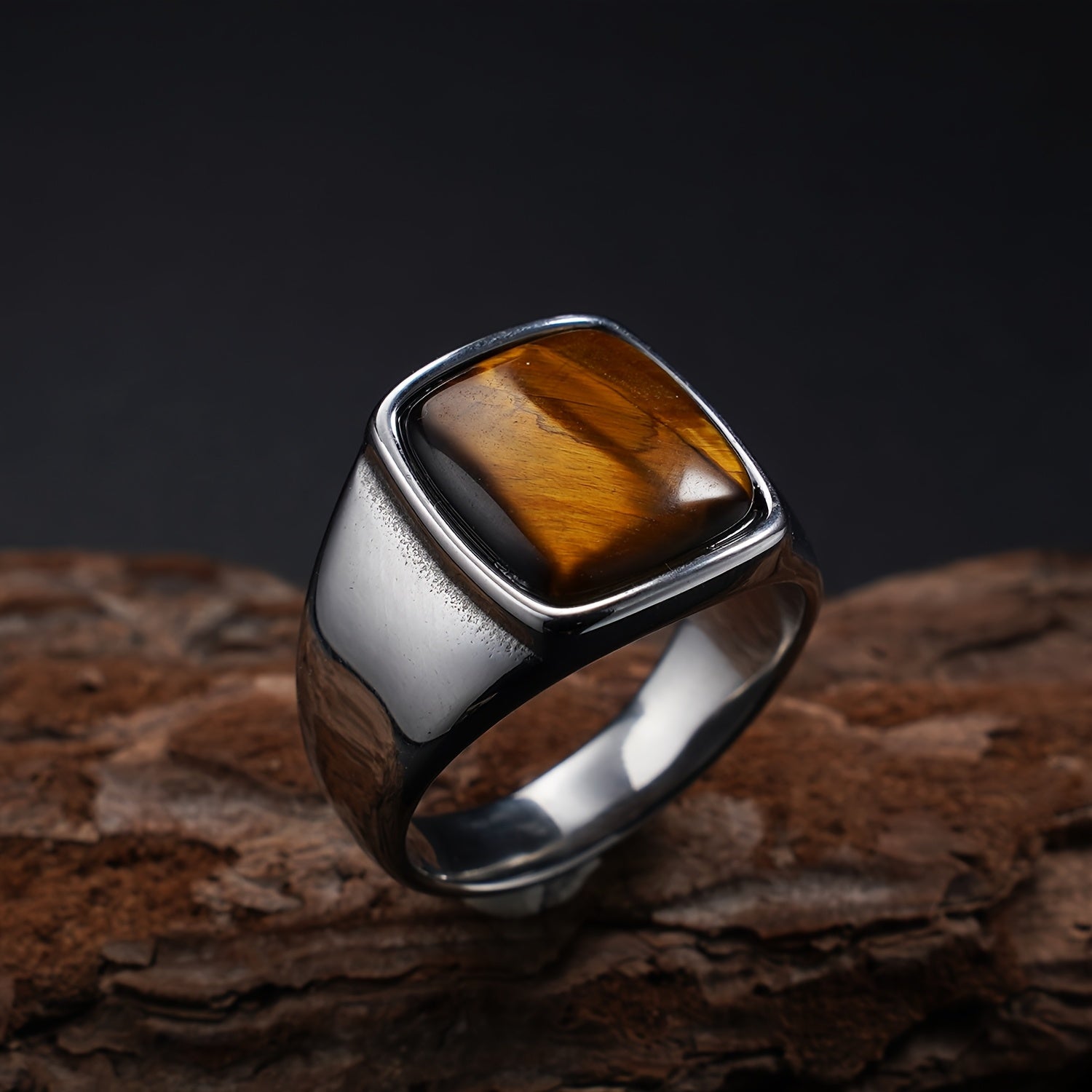 This vintage-styled ring is made of 316L stainless steel with a natural Tiger's Eye stone. It features intricate detailing and is durable, making it a perfect unisex jewelry gift for him on anniversaries, birthdays, or any special occasion.