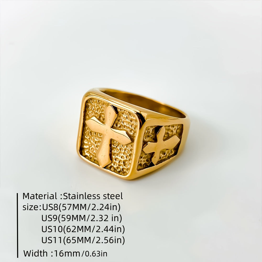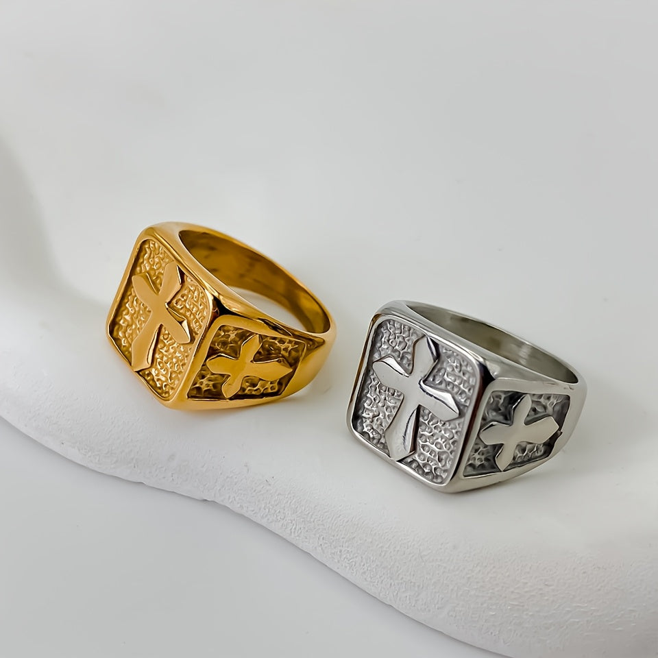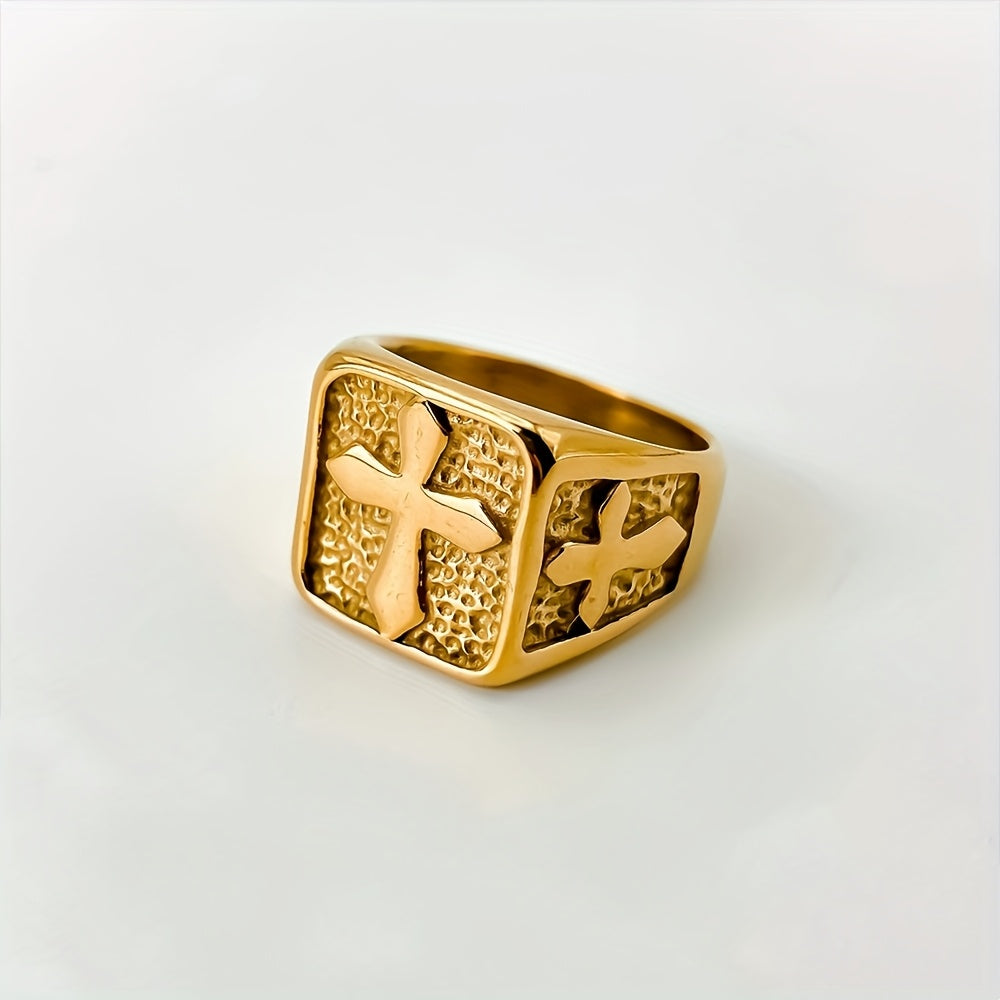 This minimalist square cross ring is perfect for men who appreciate a simple yet stylish statement piece. Made of high-quality stainless steel with a gold-plated finish, it exudes a sophisticated charm. The adjustable band ensures a comfortable fit for any finger size.