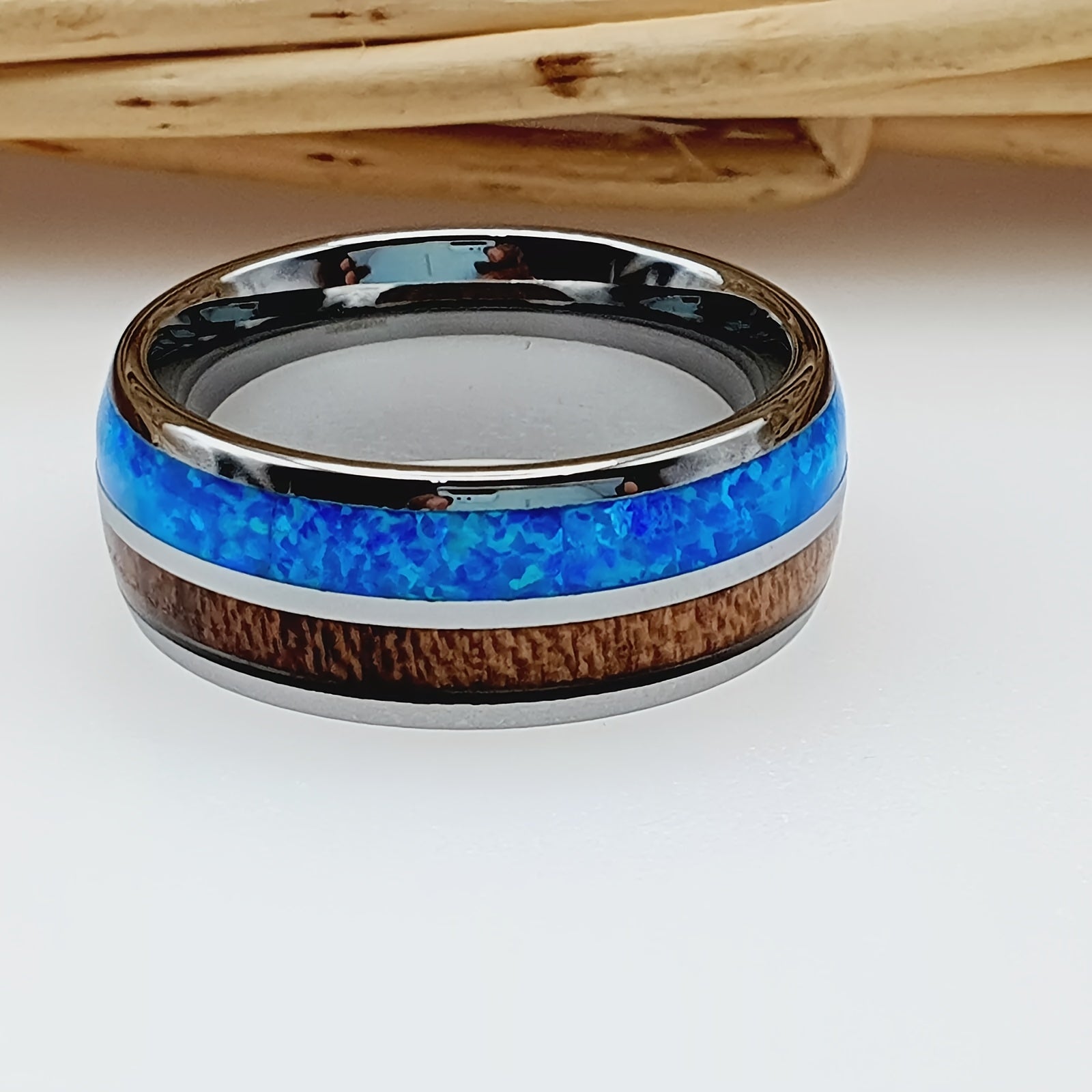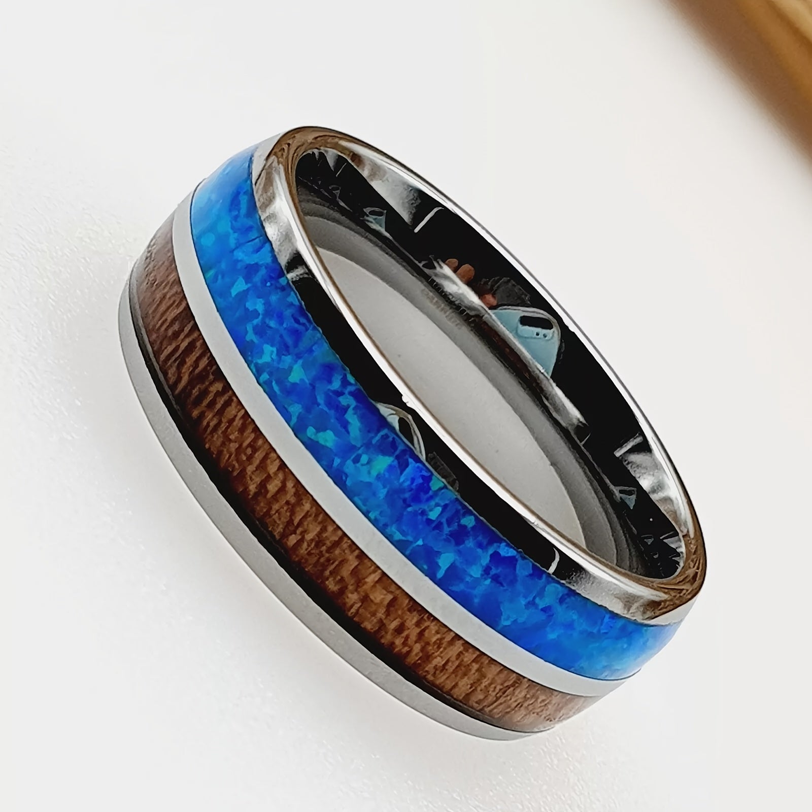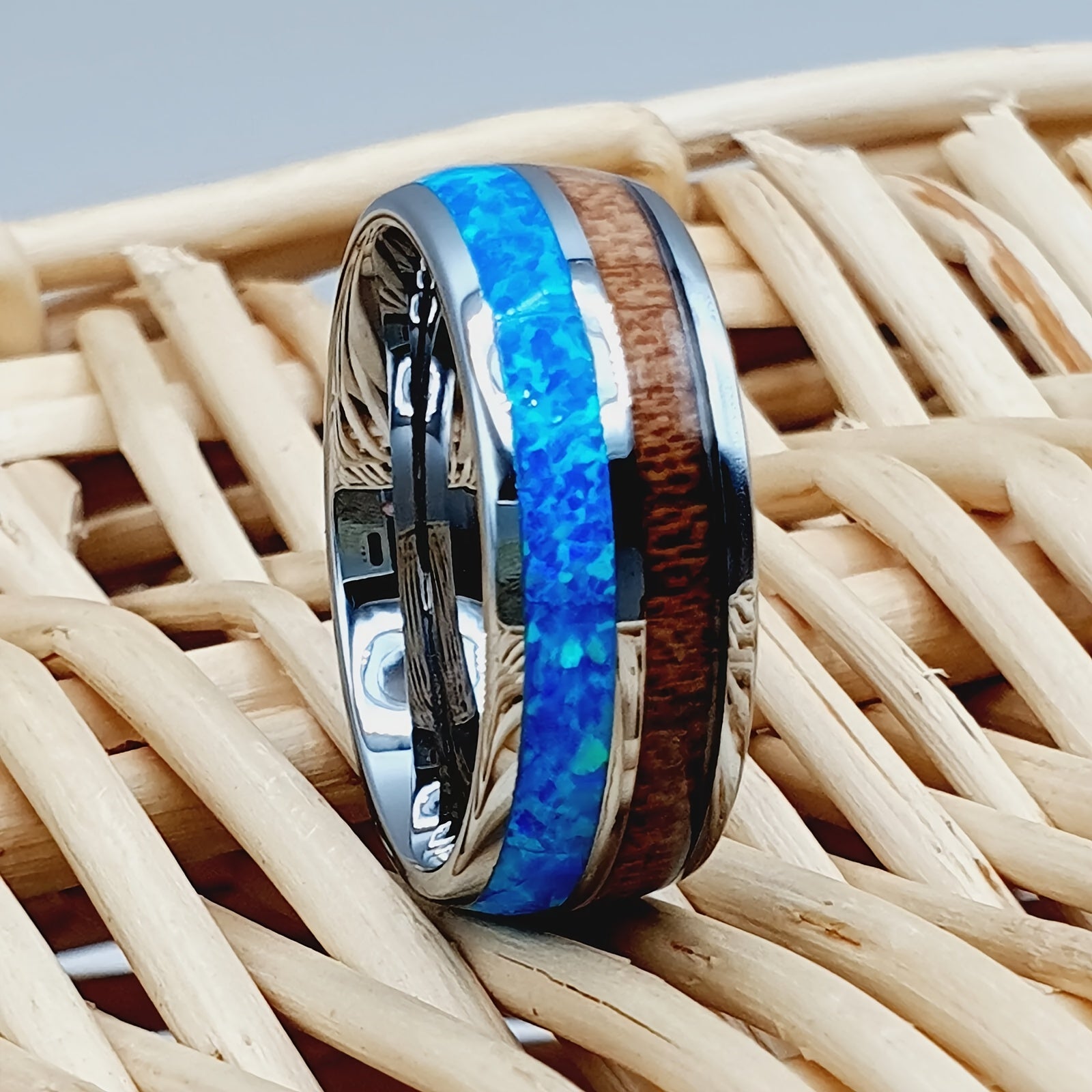 Stylish wedding band featuring opal and Koa wood inlay, perfect for engagement or Father's Day gift.