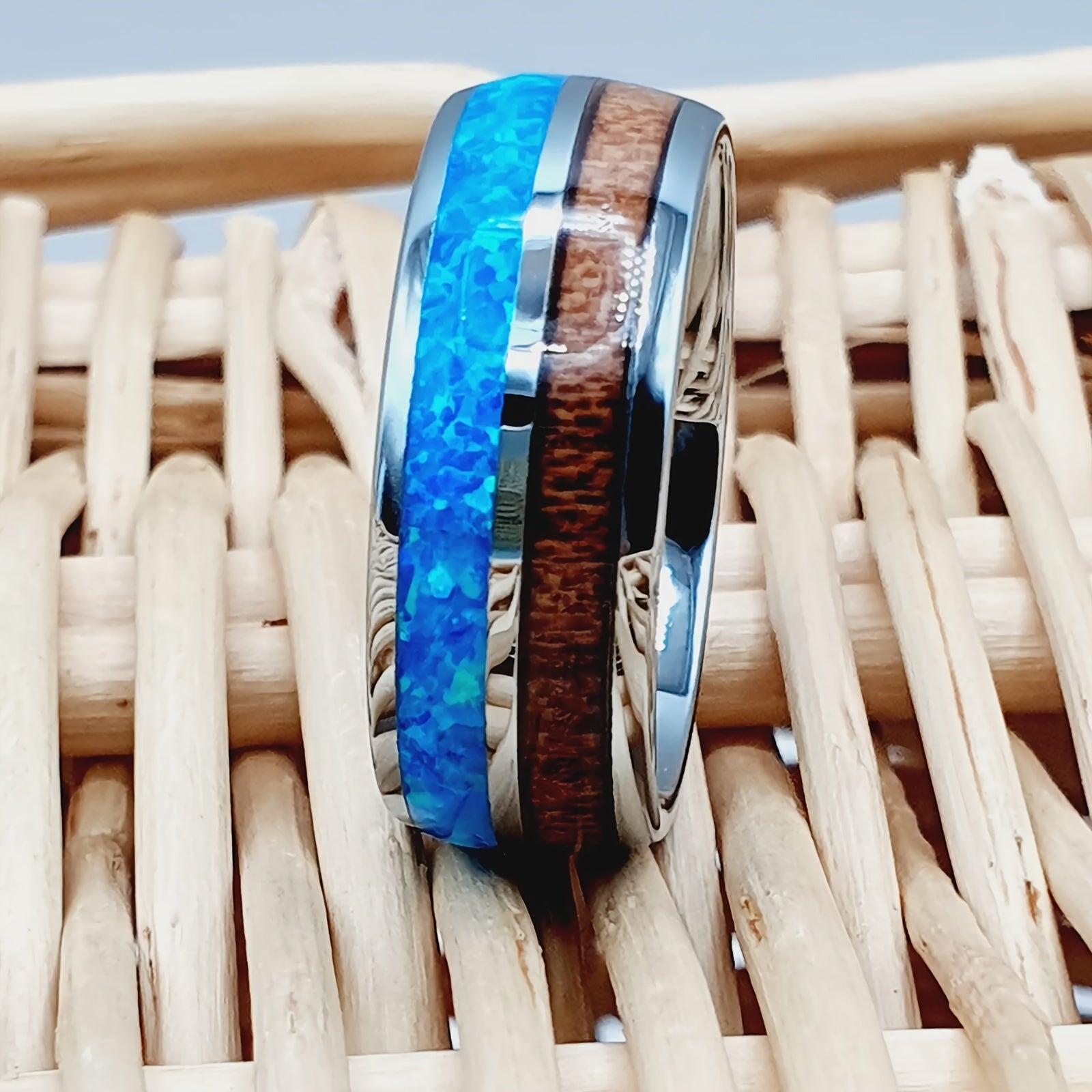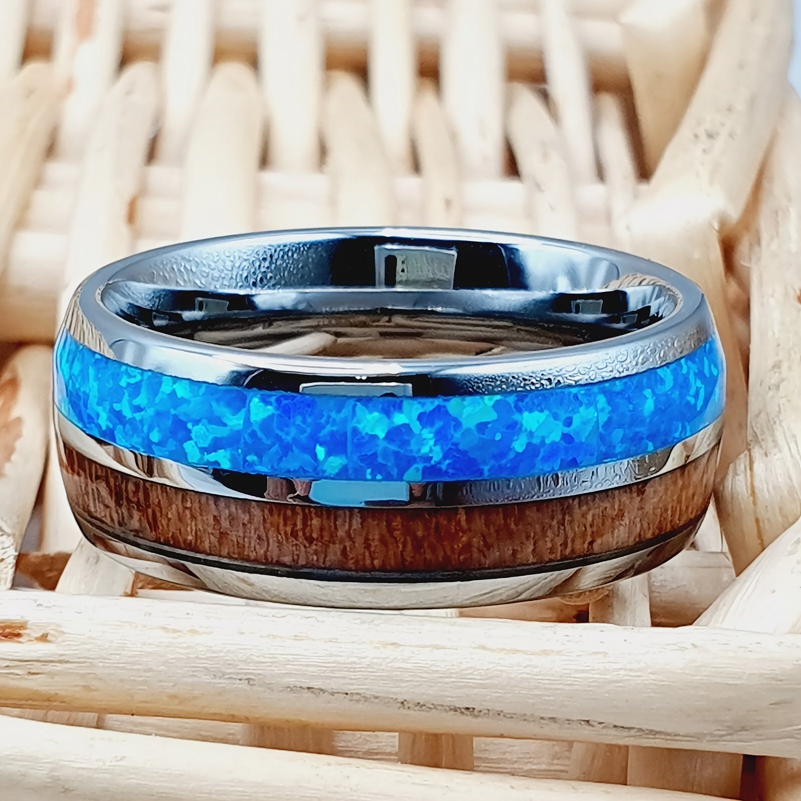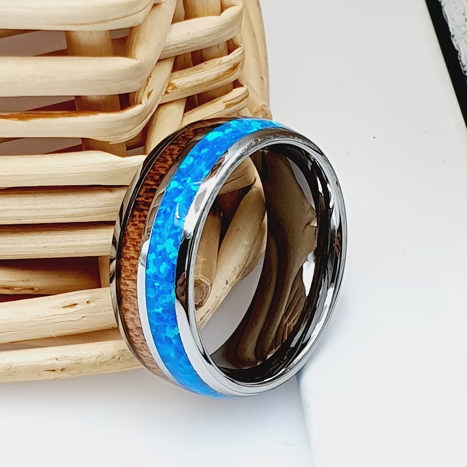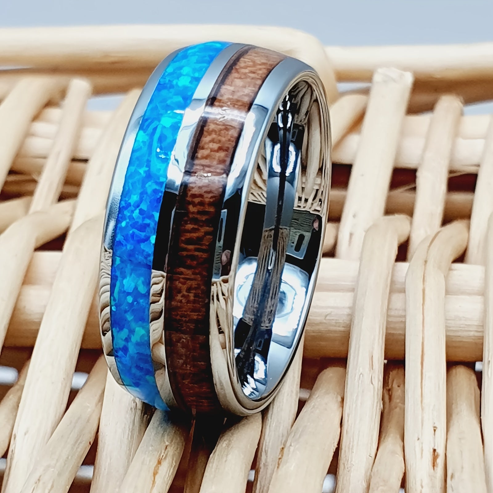 Stylish wedding band featuring opal and Koa wood inlay, perfect for engagement or Father's Day gift.