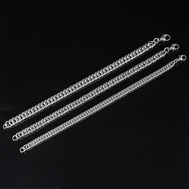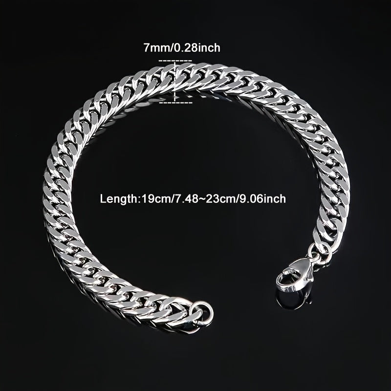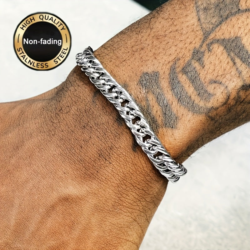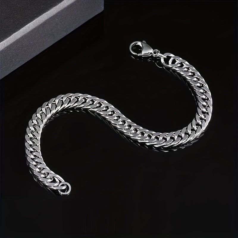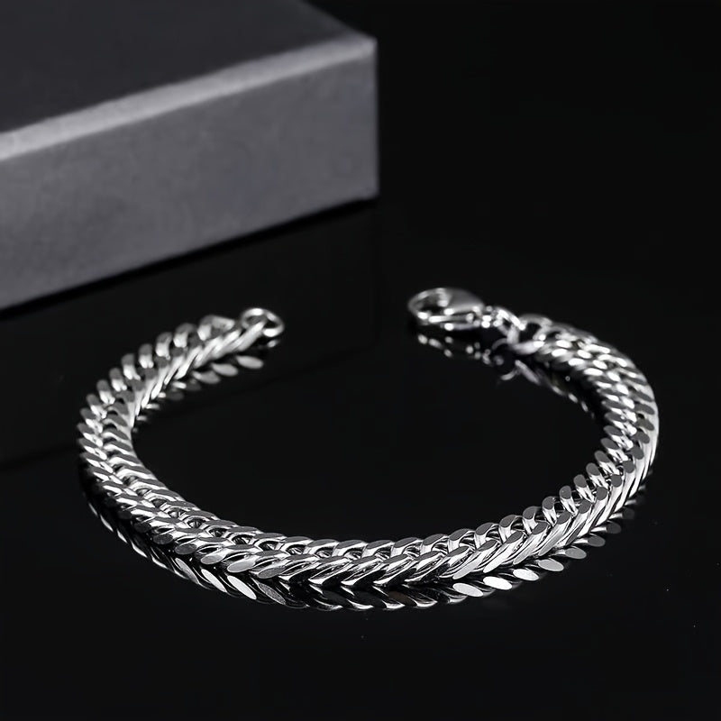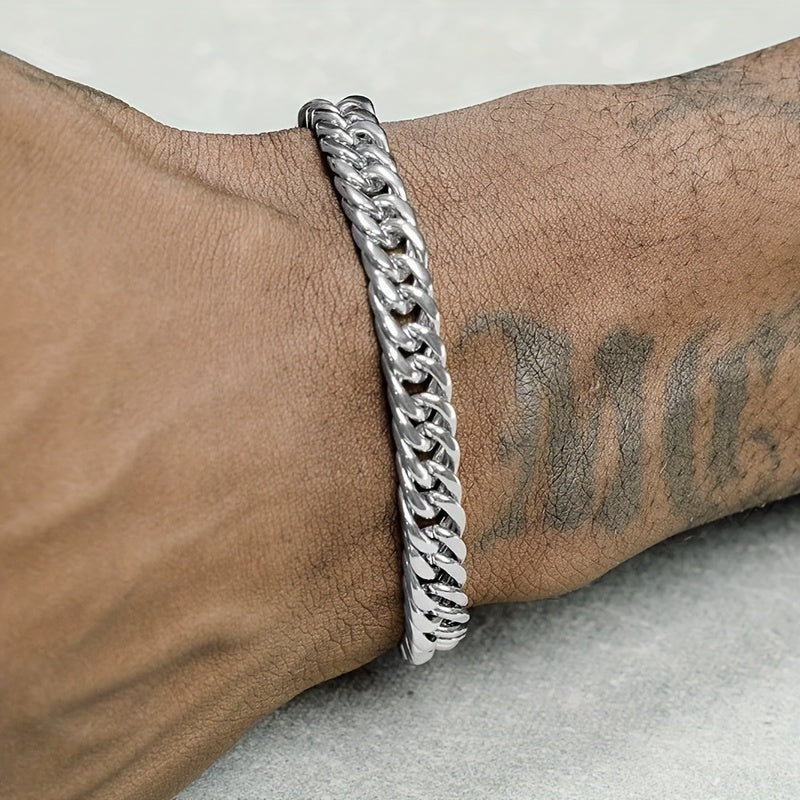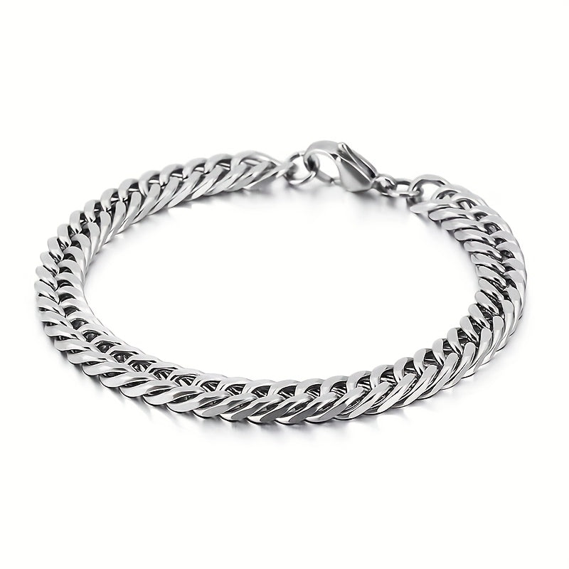 This double layered stainless steel bracelet is hypoallergenic, corrosion resistant, fade proof, and offers long-lasting durability, making it a stylish accessory for casual attire.