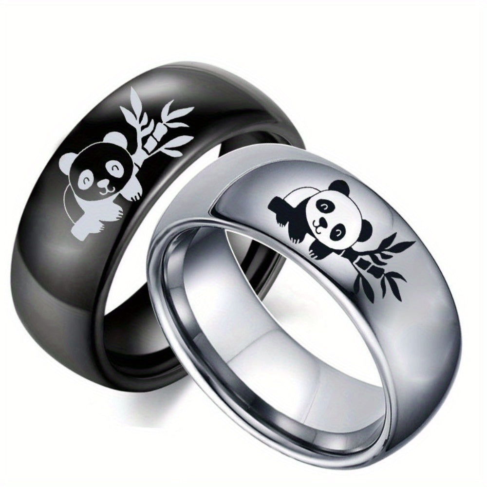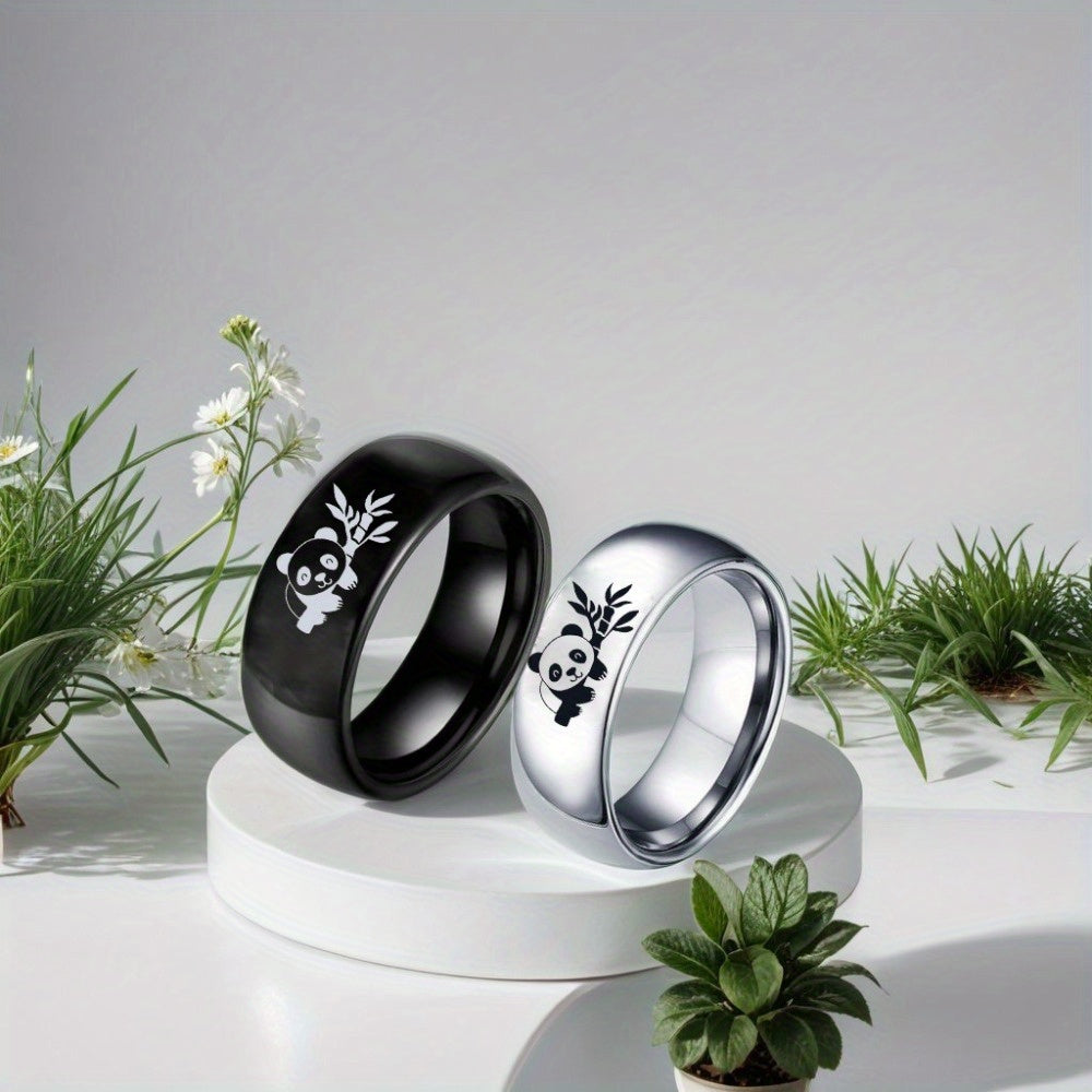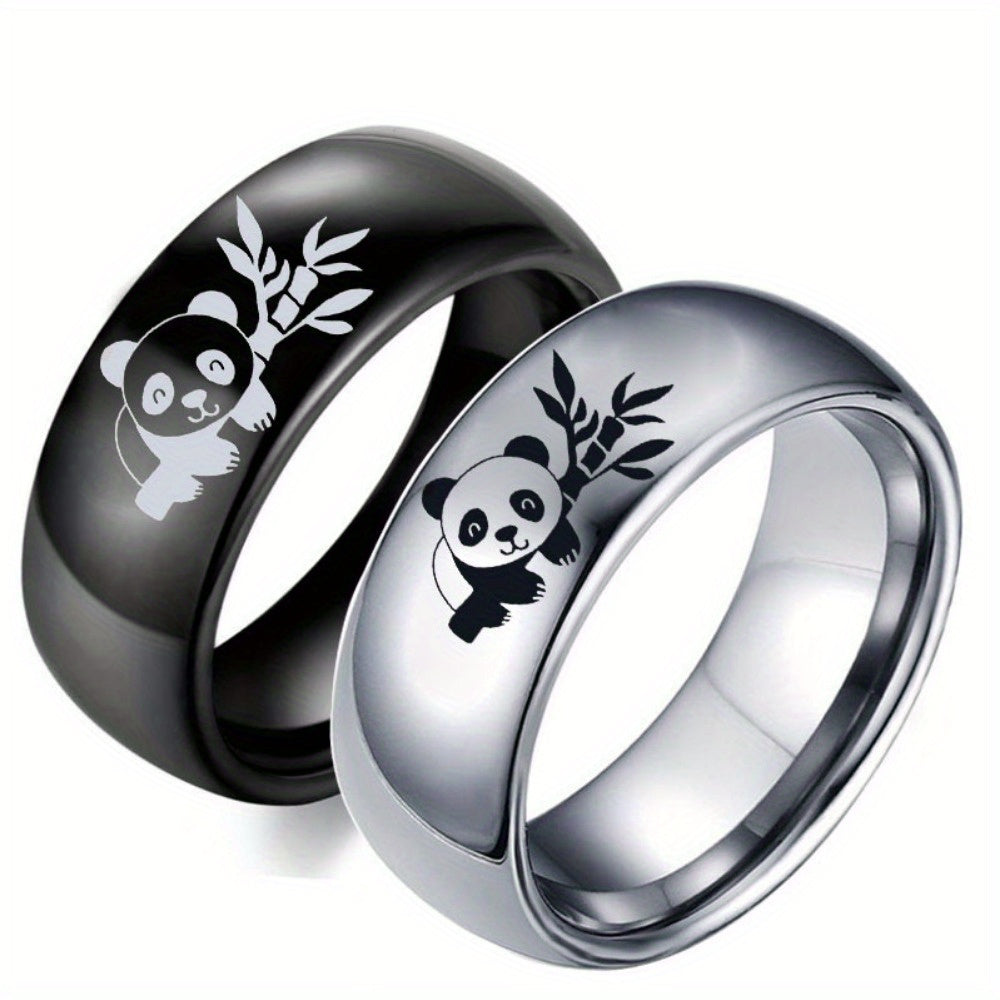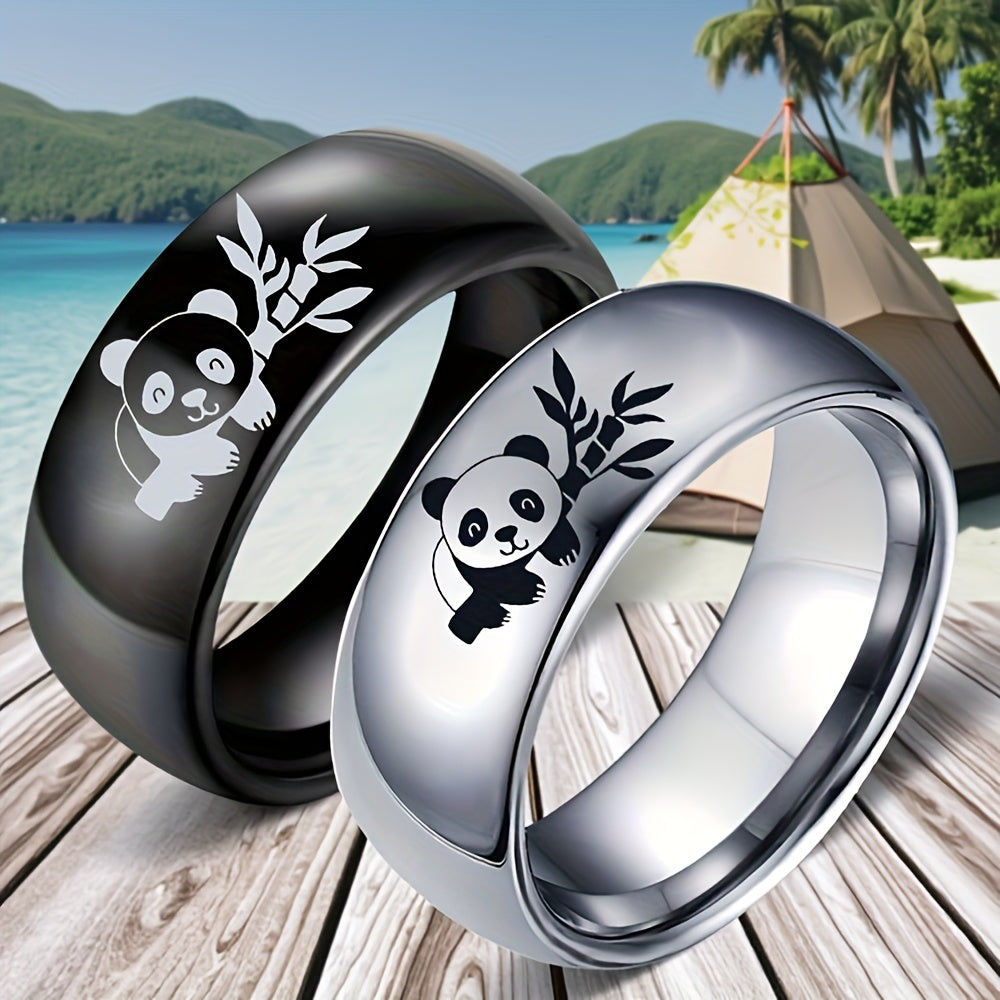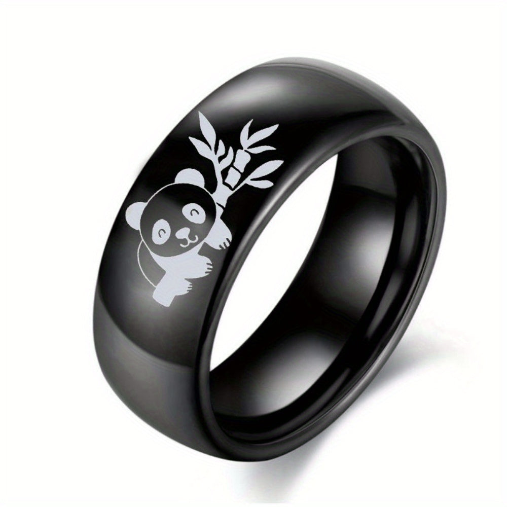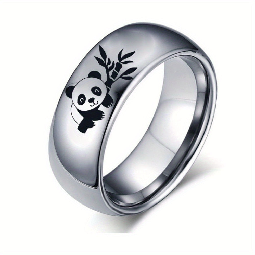 This stainless steel panda ring features a cute panda and bamboo pattern, making it a perfect gift for birthdays and anniversaries. The ring is 8mm wide and comes in a silvery color.