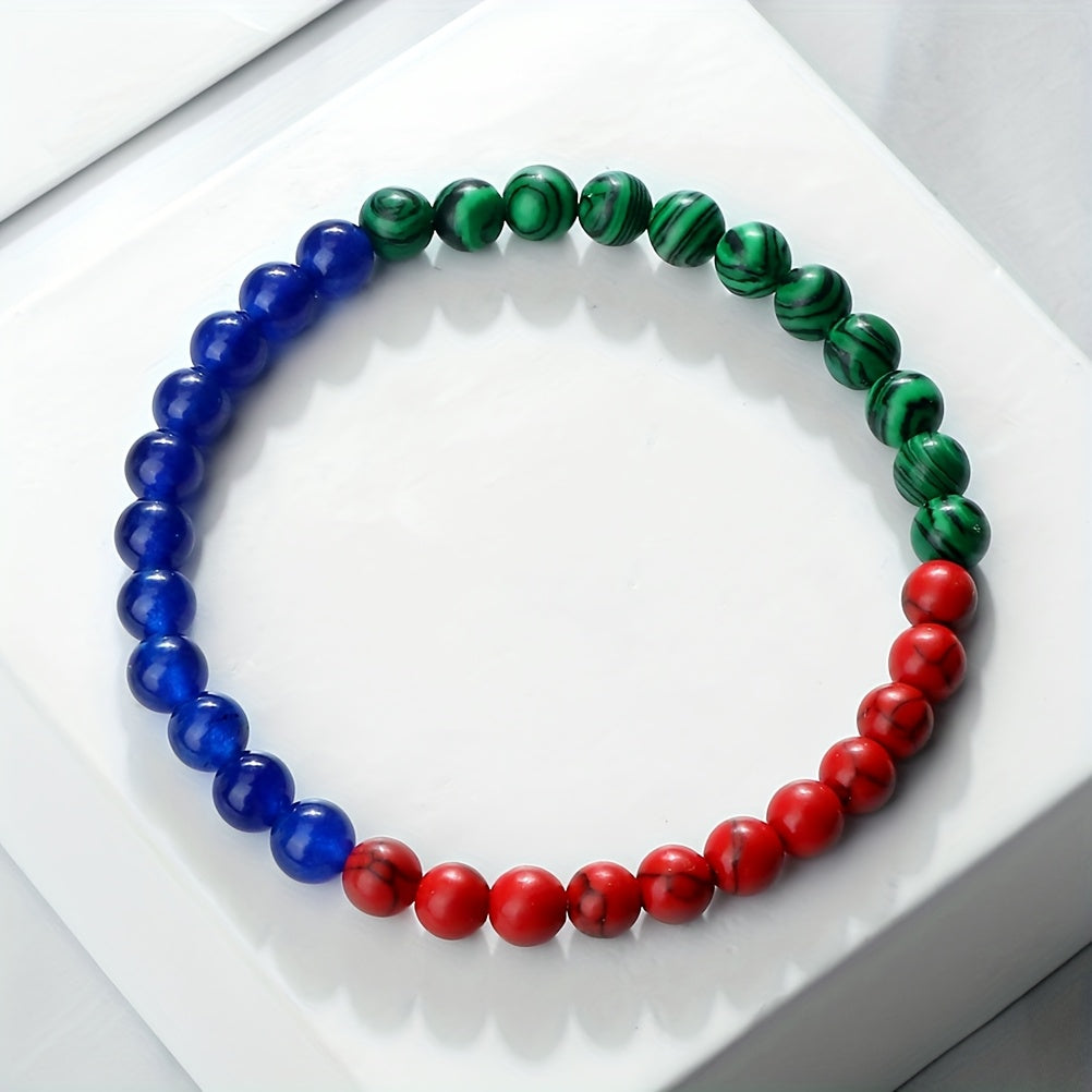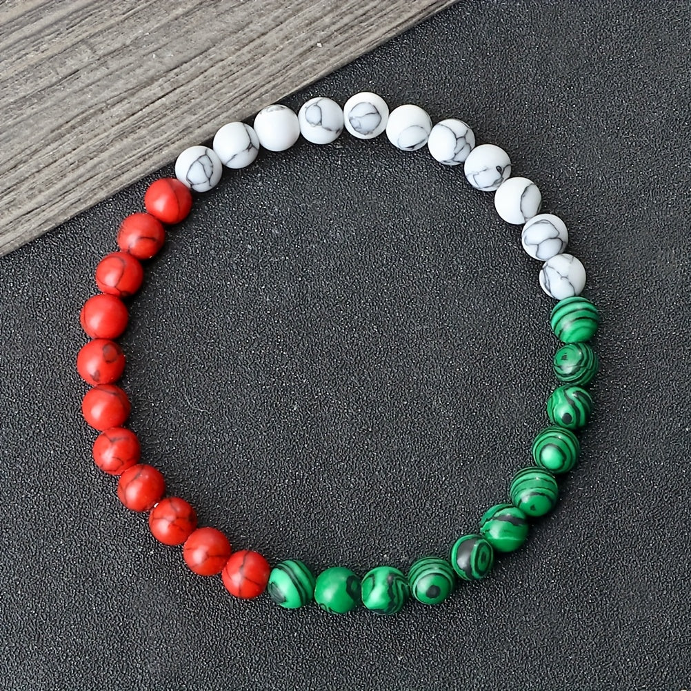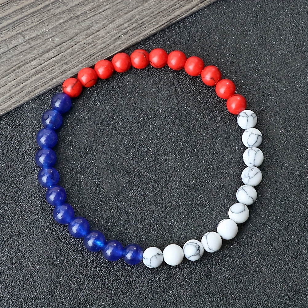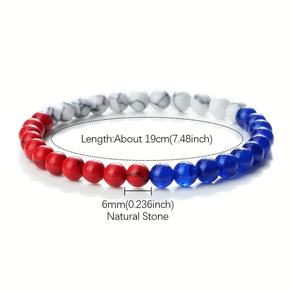 This patriotic bracelet features 6mm natural stone beads in red with flag design. It is an ideal everyday accessory and inspiring travel souvenir jewelry for both men and women.