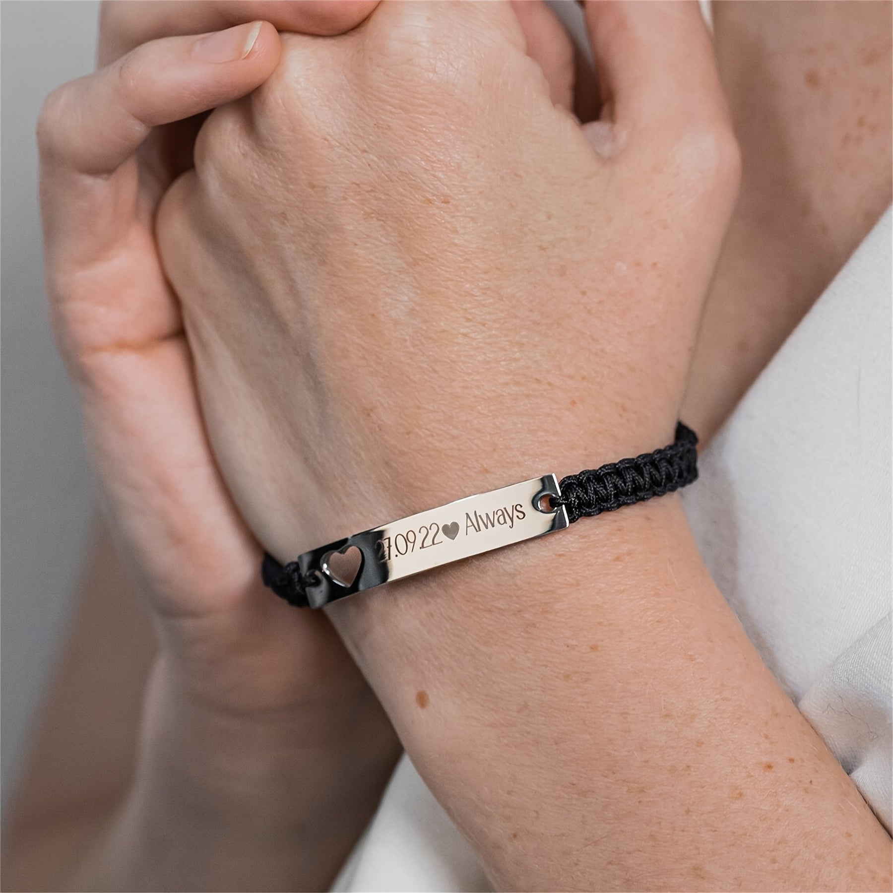 This stainless steel bracelet can be personalized with a name and date of your choice, making it a unique and meaningful piece of unisex jewelry.