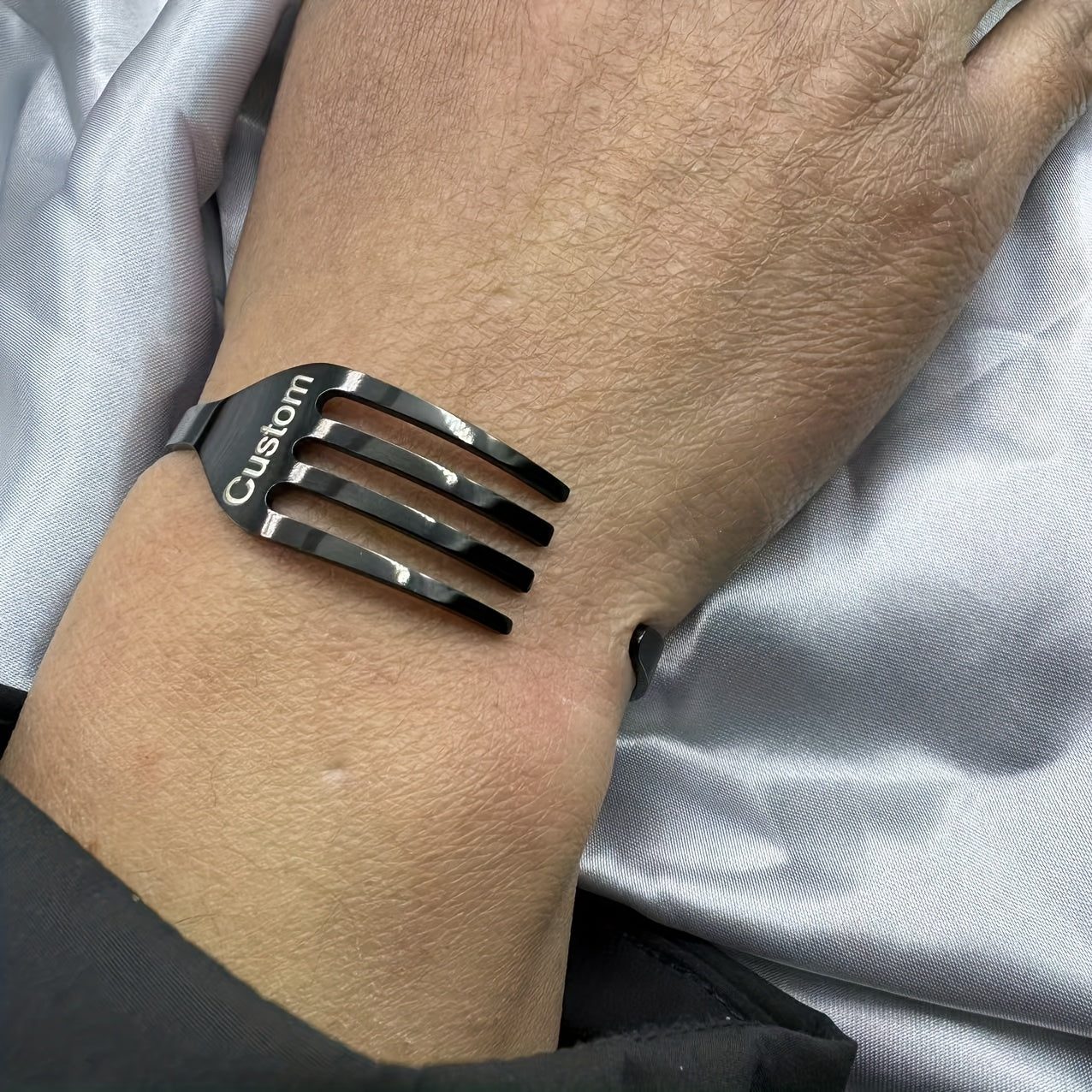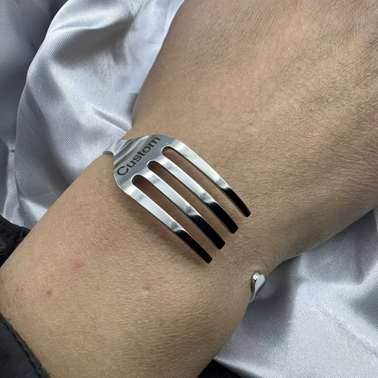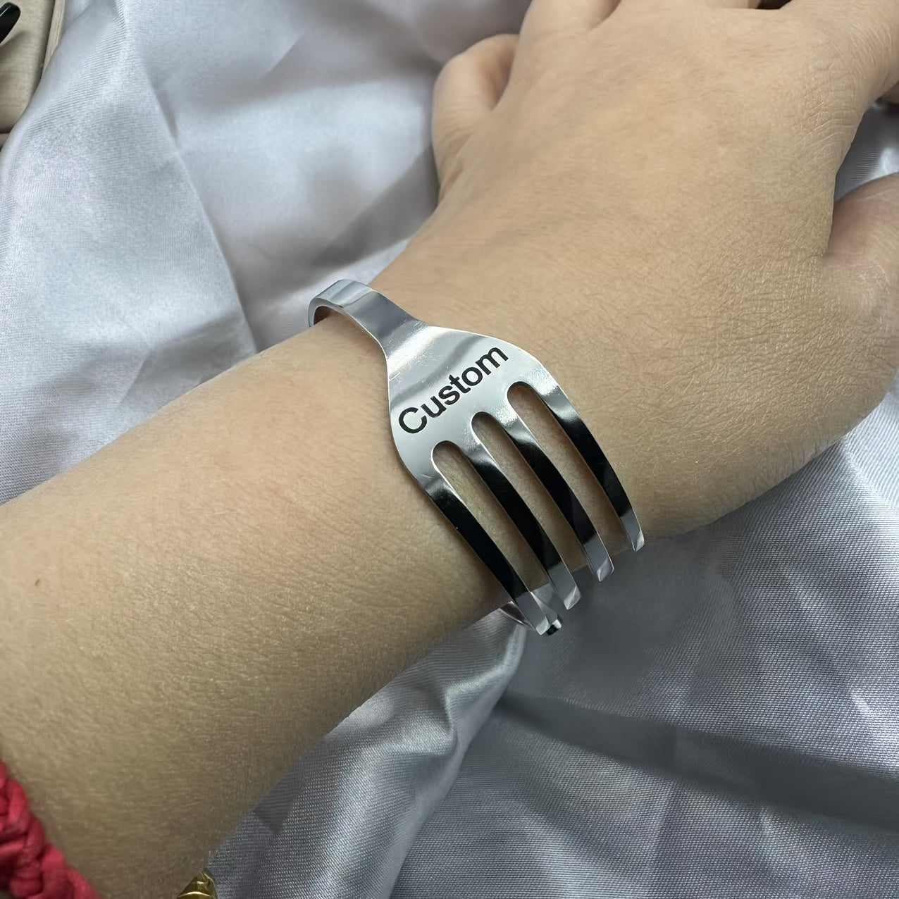 This sleek and modern fork bracelet is a stylish daily wear accessory for men and women. Customize it with your own engraving for a unique touch.