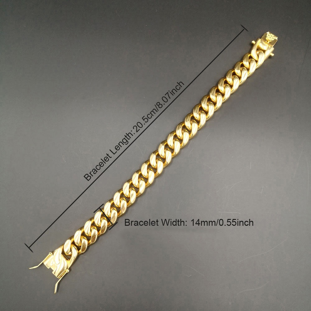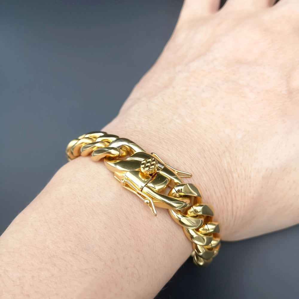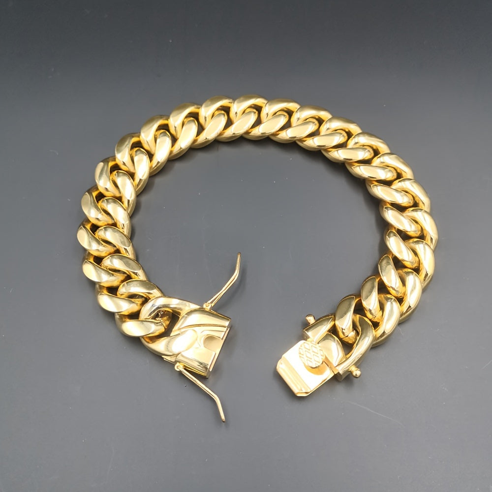 This men's wristband features a high polished finish and is made of durable stainless steel with a golden plated Miami Cuban link chain design.