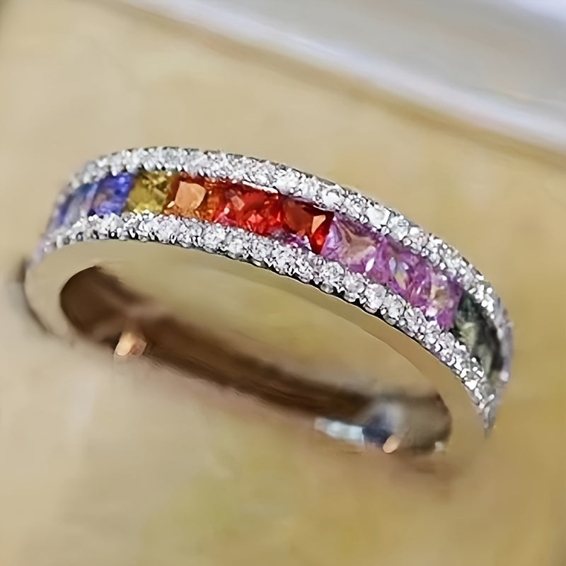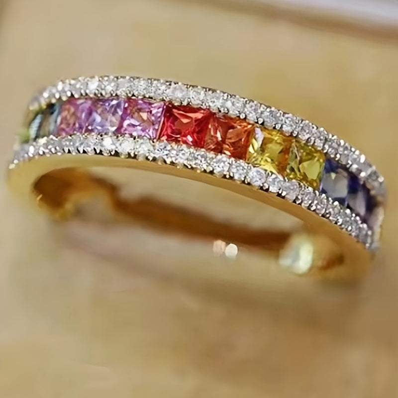 Add a pop of color to your look with this stylish rainbow zirconia ring. Featuring rectangular gemstones in a golden plated setting with clear crystals, this ring is the perfect accessory for casual attire.