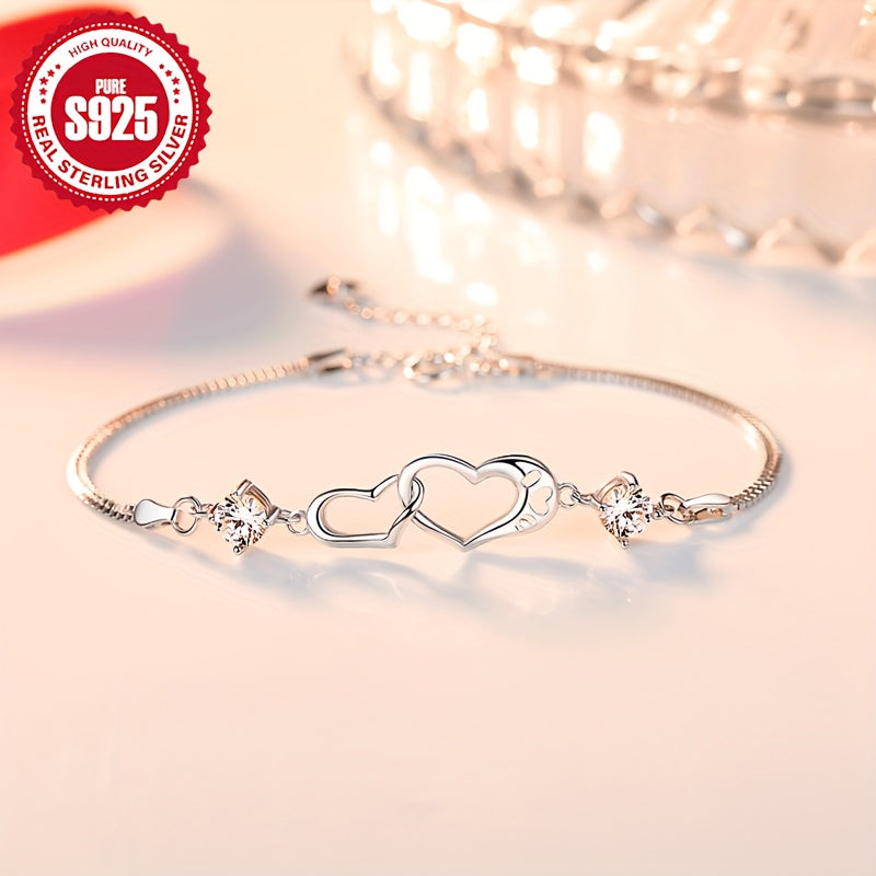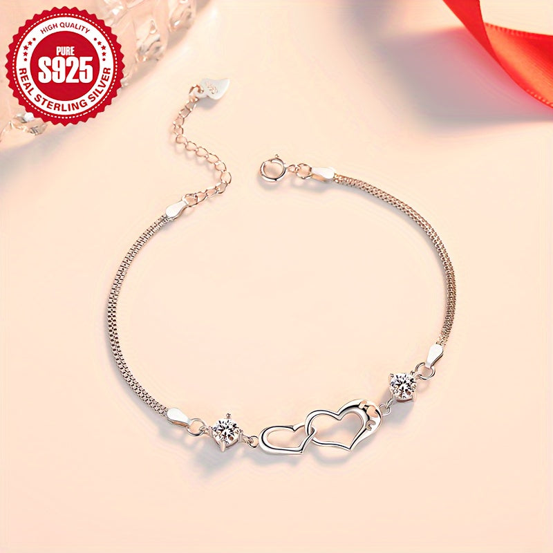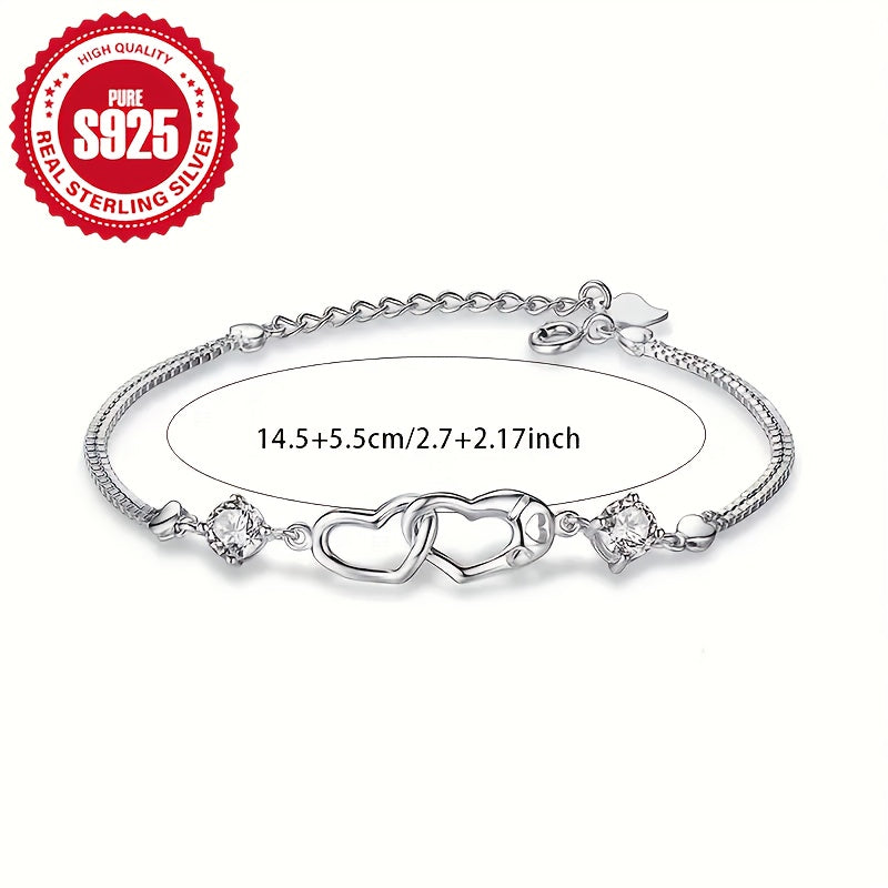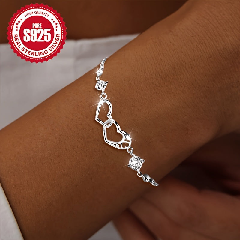 S925 Silver Double Heart Zirconia Bracelet Classic Style
