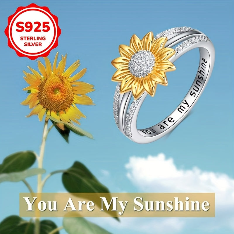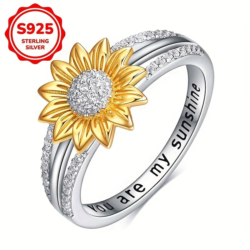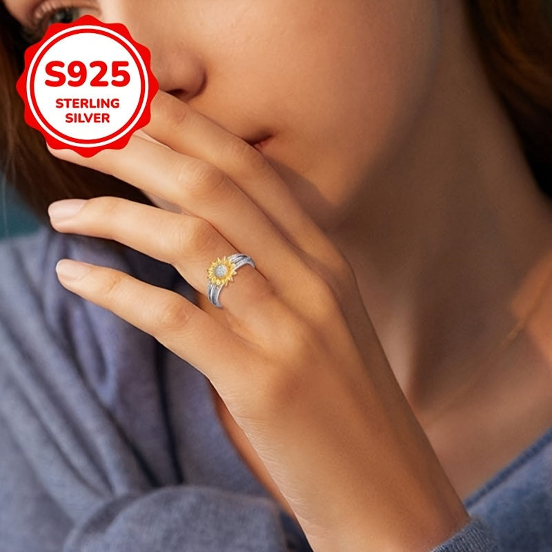 S925 Silver Sunflower Ring with Zirconia, Two Tone Flower Jewelry
