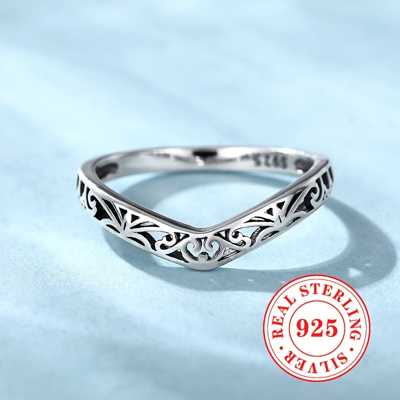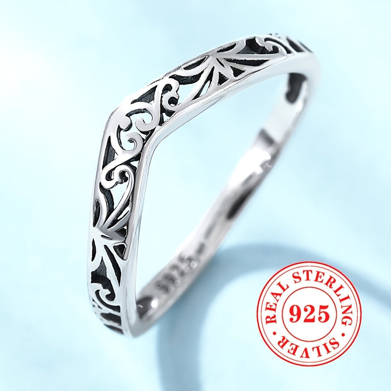 Add a stylish touch to your daily or vacation look with this S925 pure silvery ring featuring a retro hollow flower design and V shape.