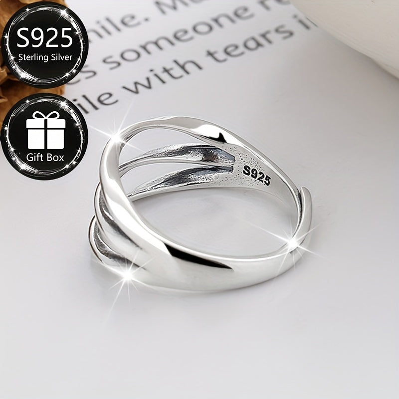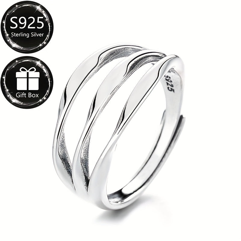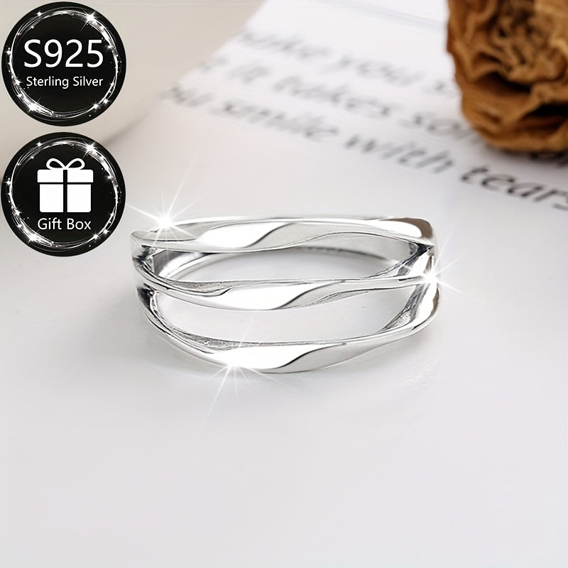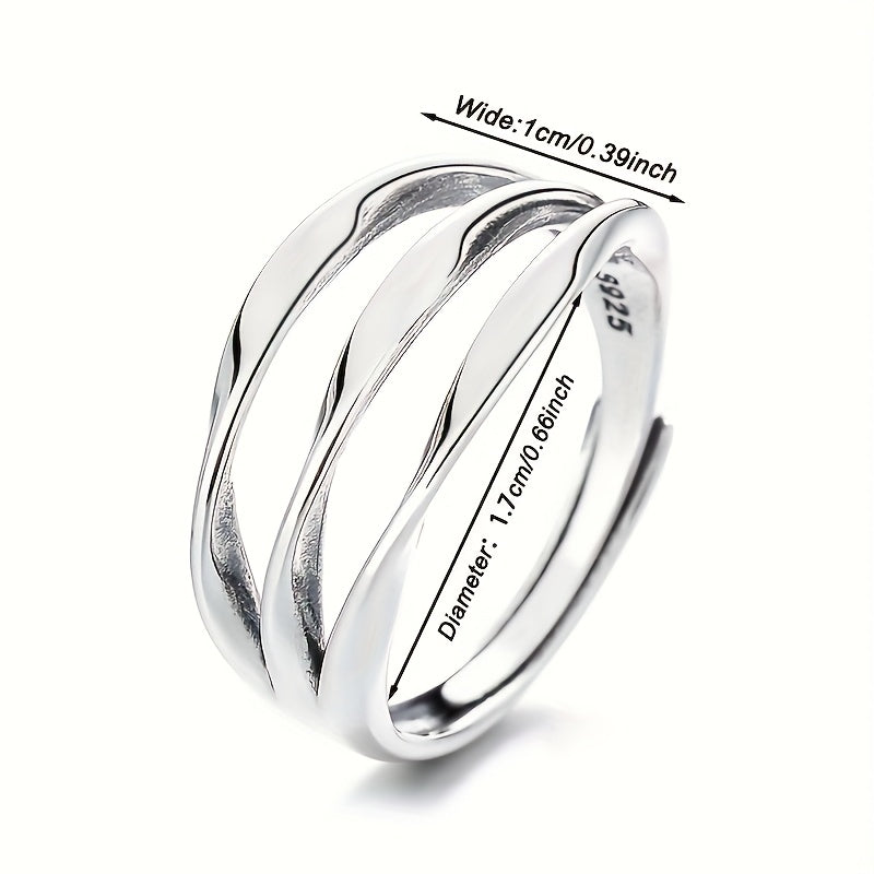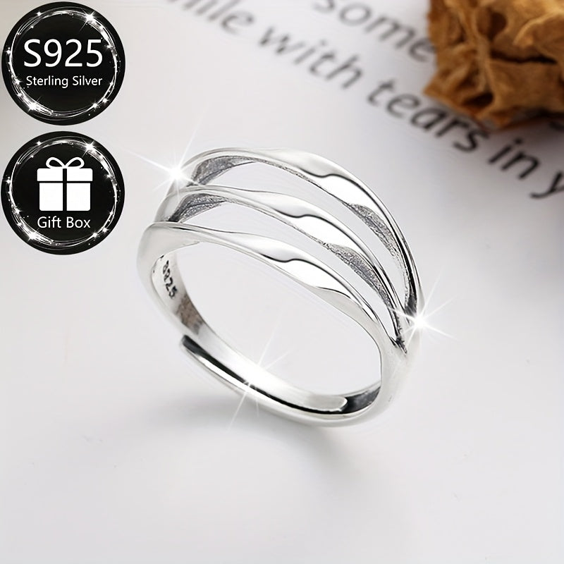 S925 Sterling Silvery Hollow Layered Wave Open Ring
