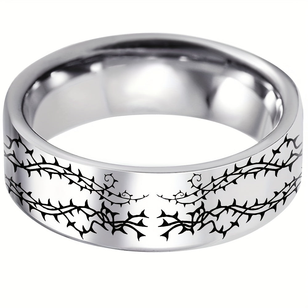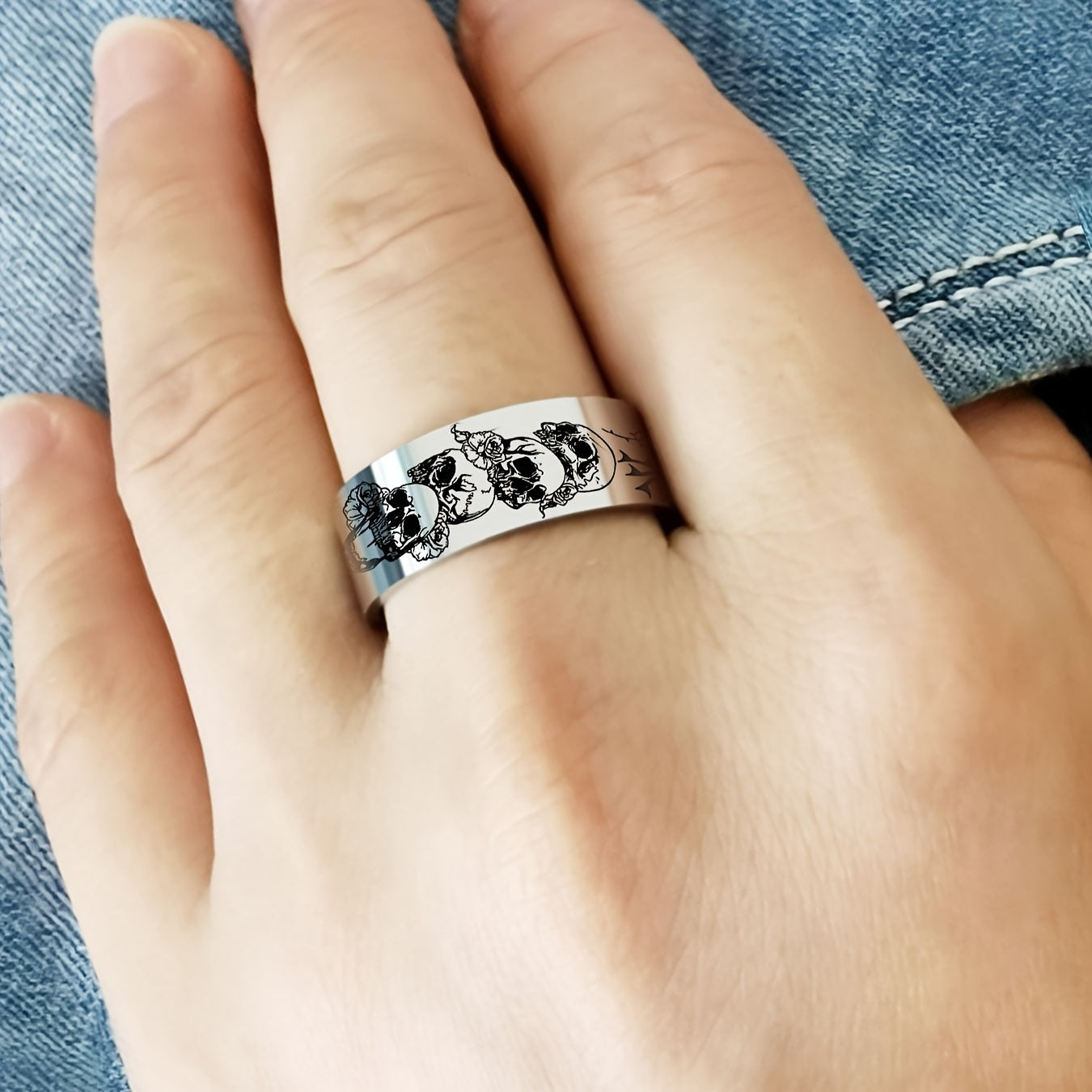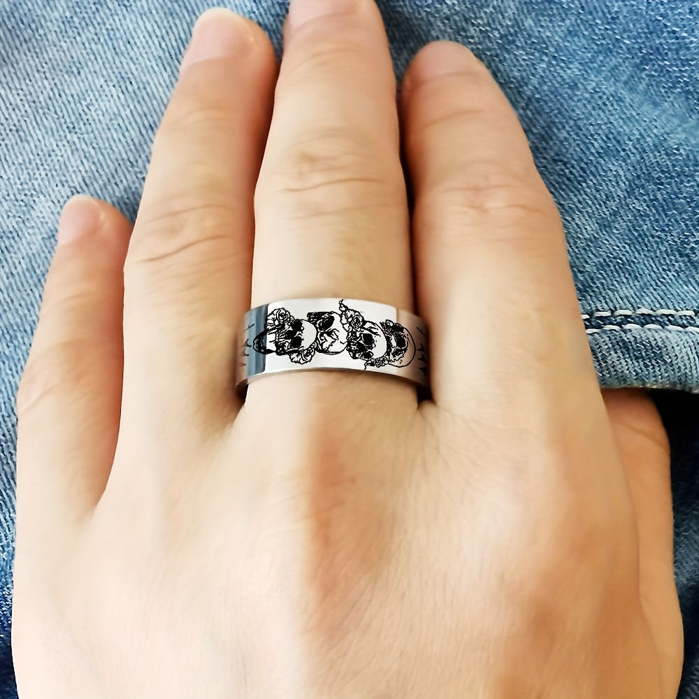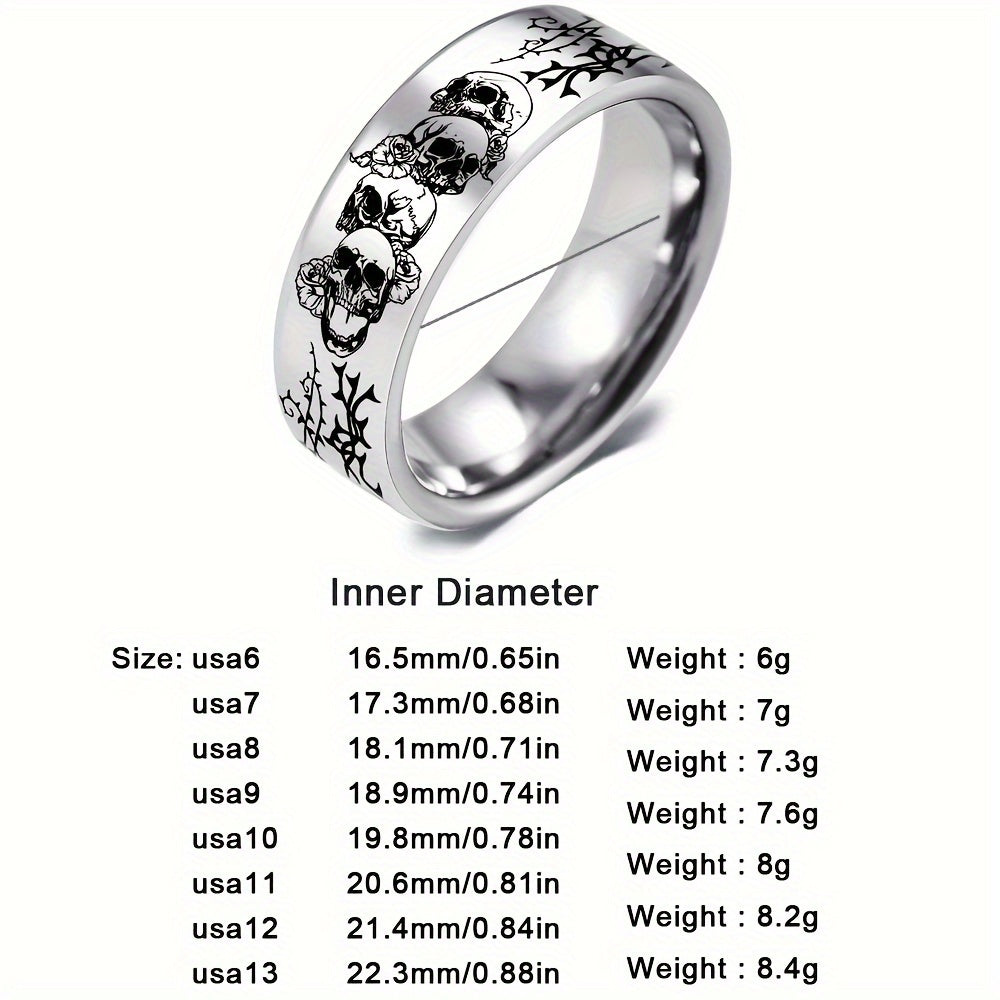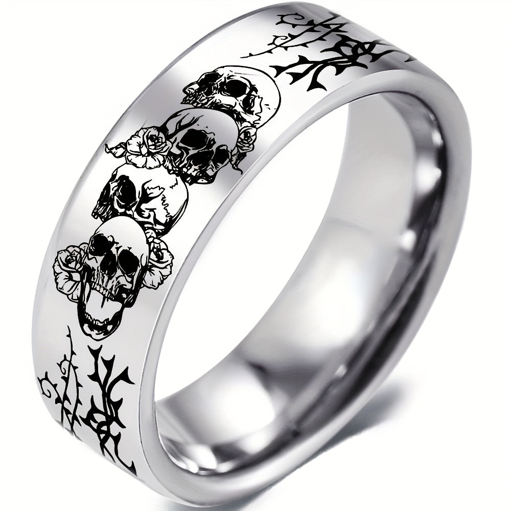 This 8mm silvery ring features a stylish skull and rose design, making it a perfect gift for men and women. Crafted from durable 316L stainless steel, it is ideal for everyday wear. A great choice for an anniversary or as a Father's Day gift.