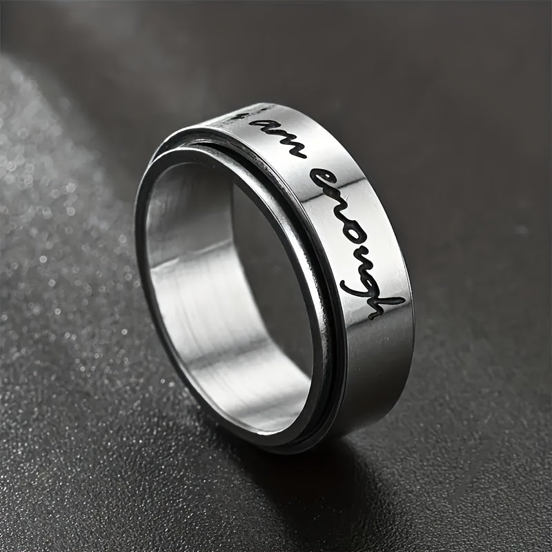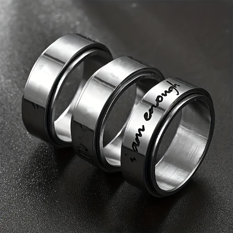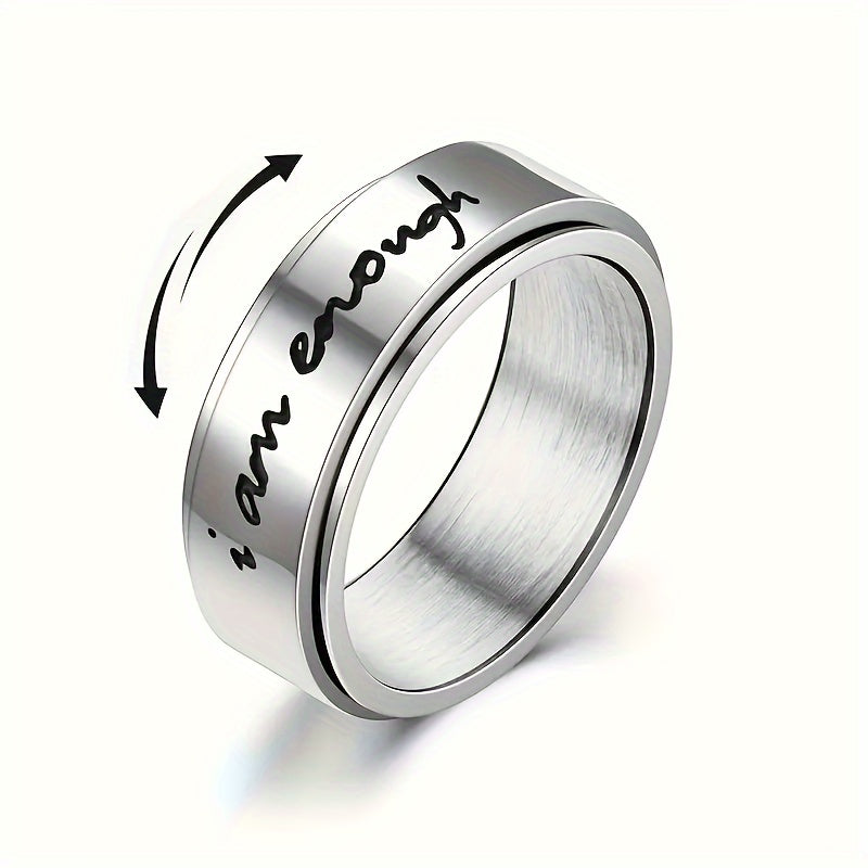 This stylish fidget ring is made of stainless steel with carved letters on the surface. It is suitable for men and women to match with daily outfits or party decor.