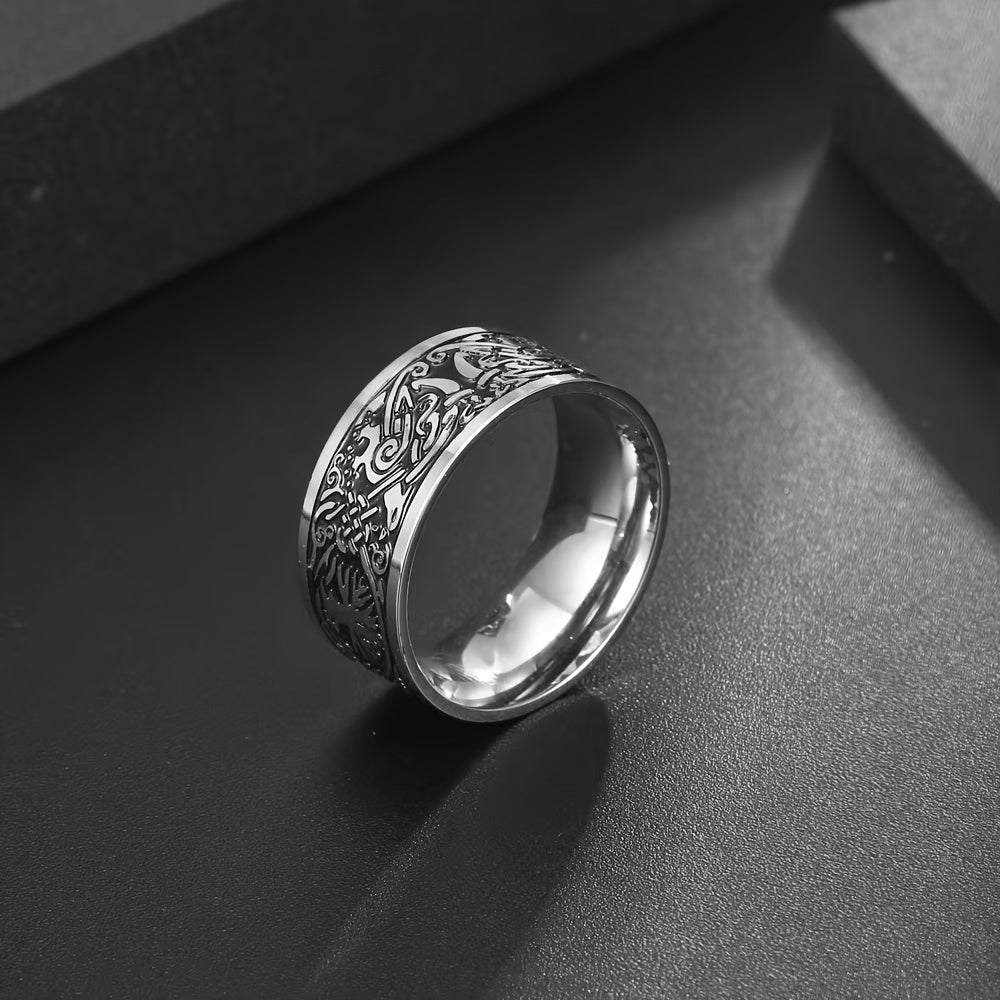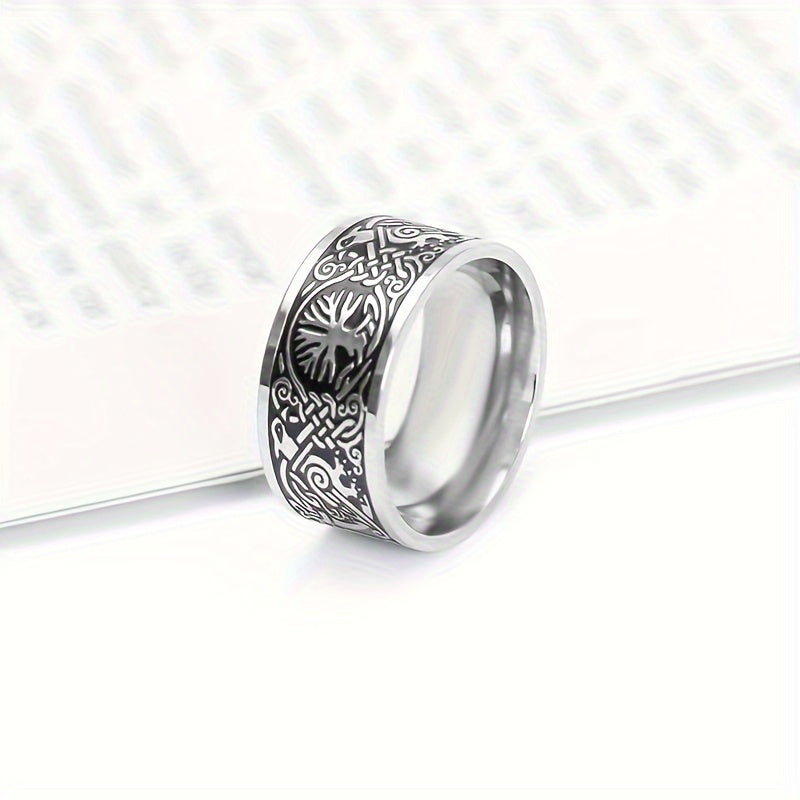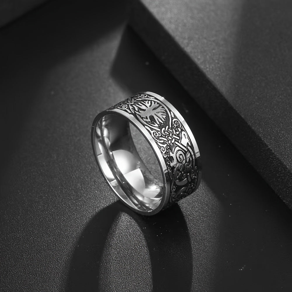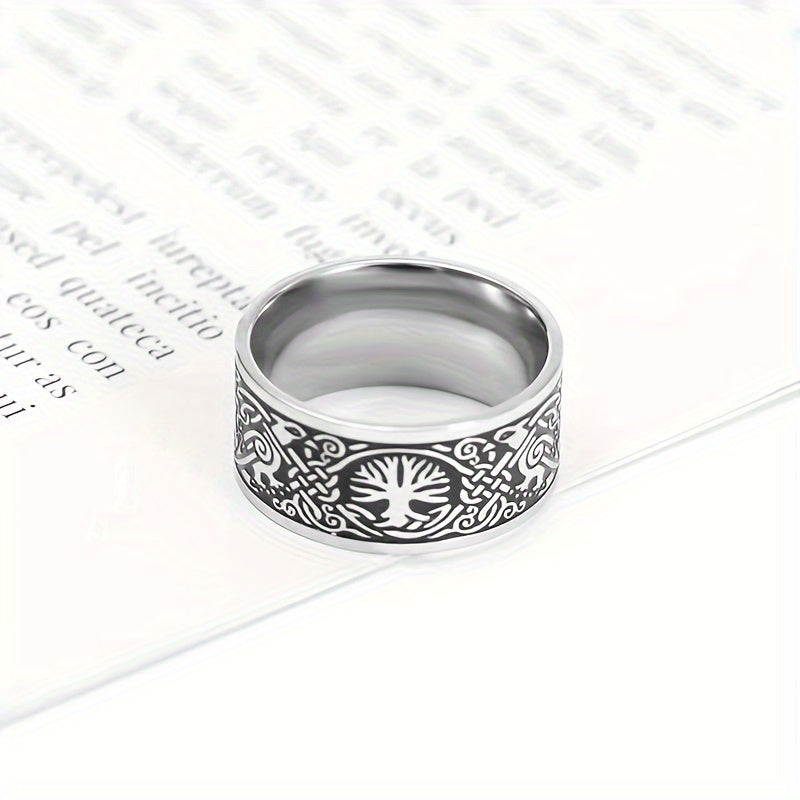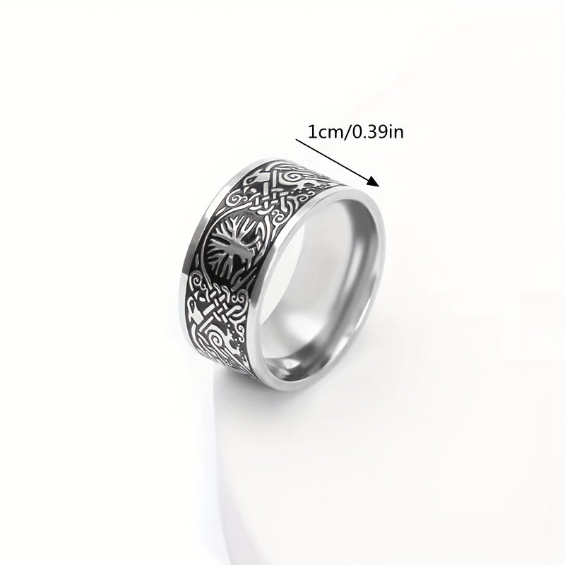This stainless steel men's ring features a Nordic Viking design with a lucky tree of life motif. Available in US sizes 7 to 13.