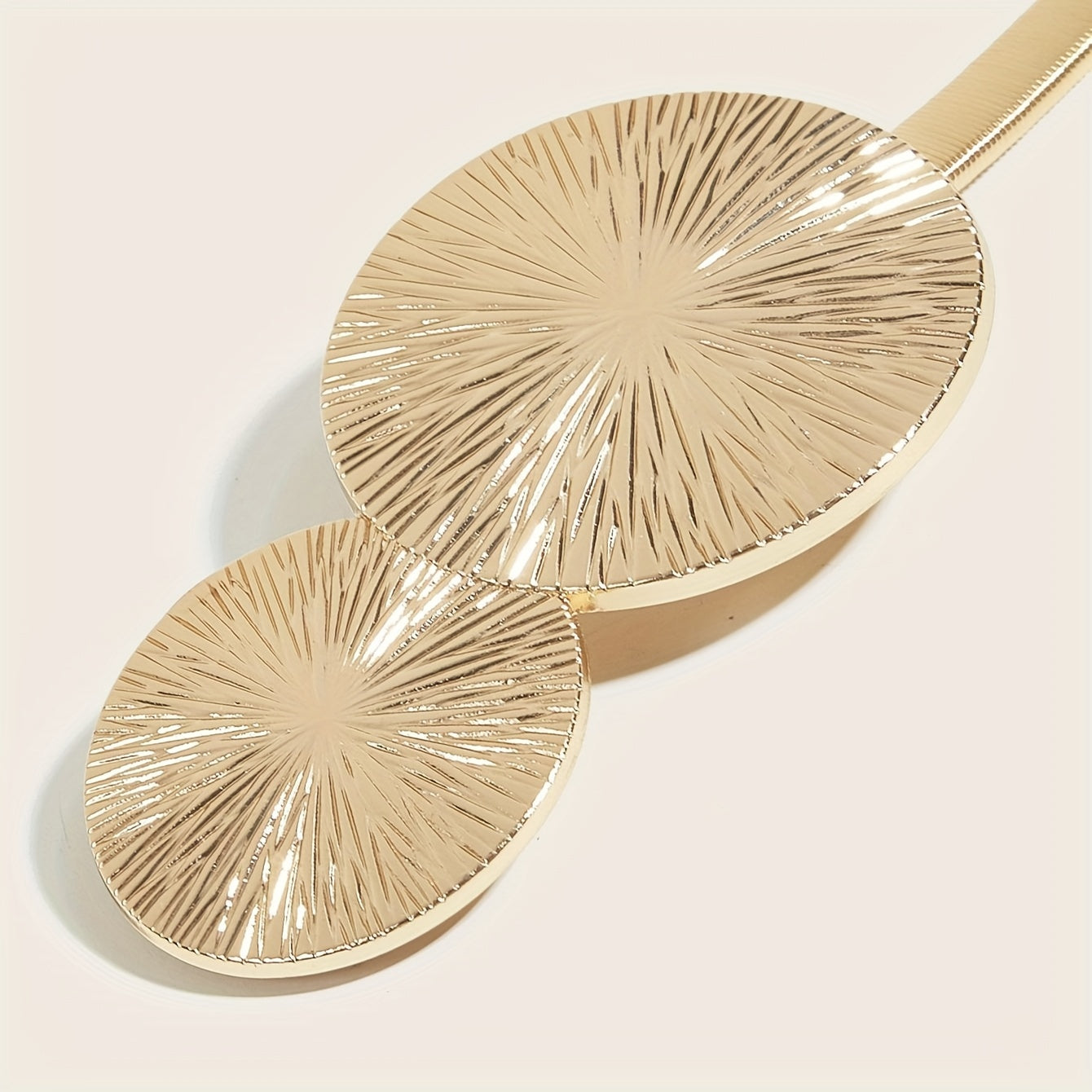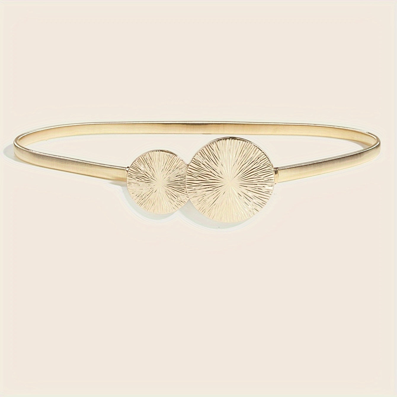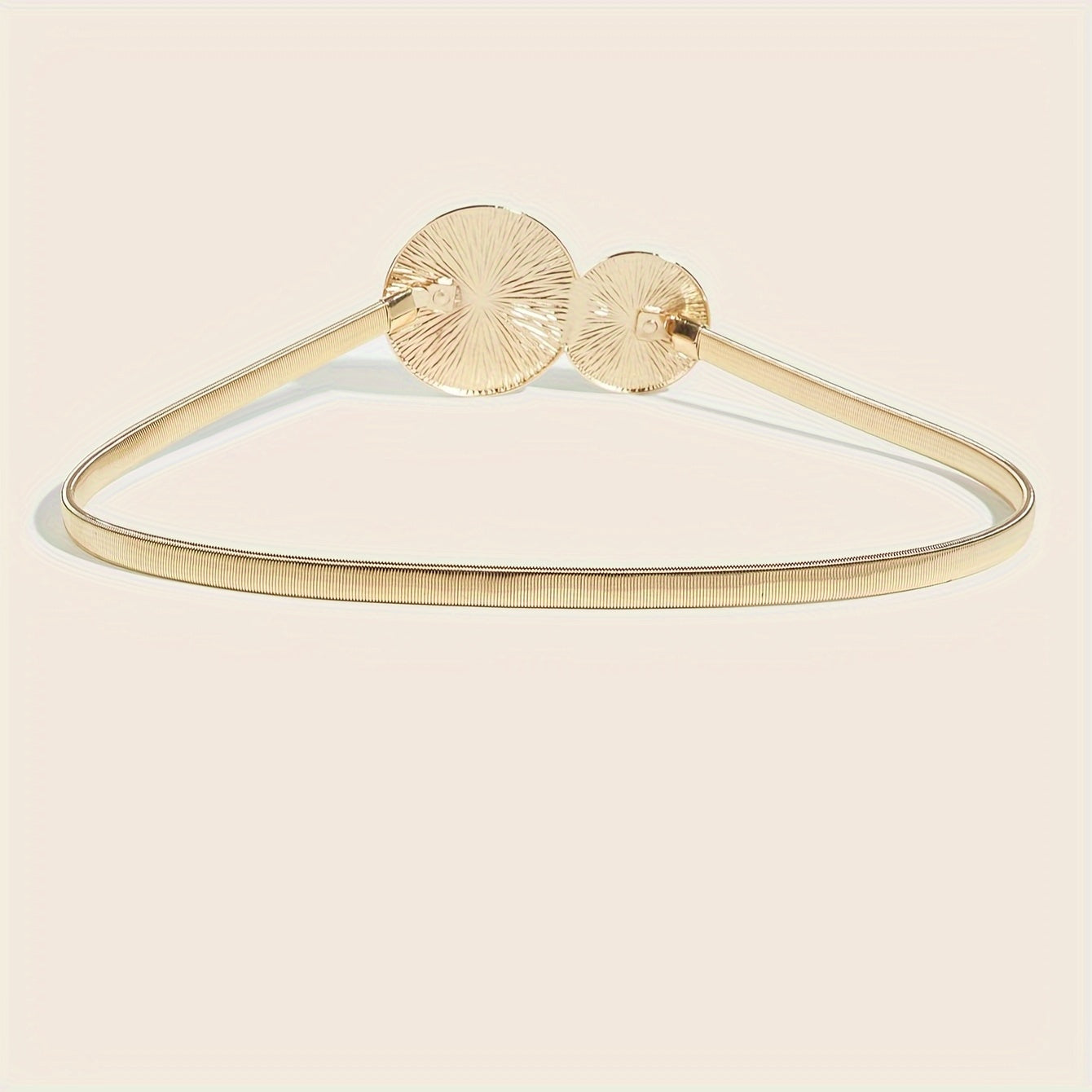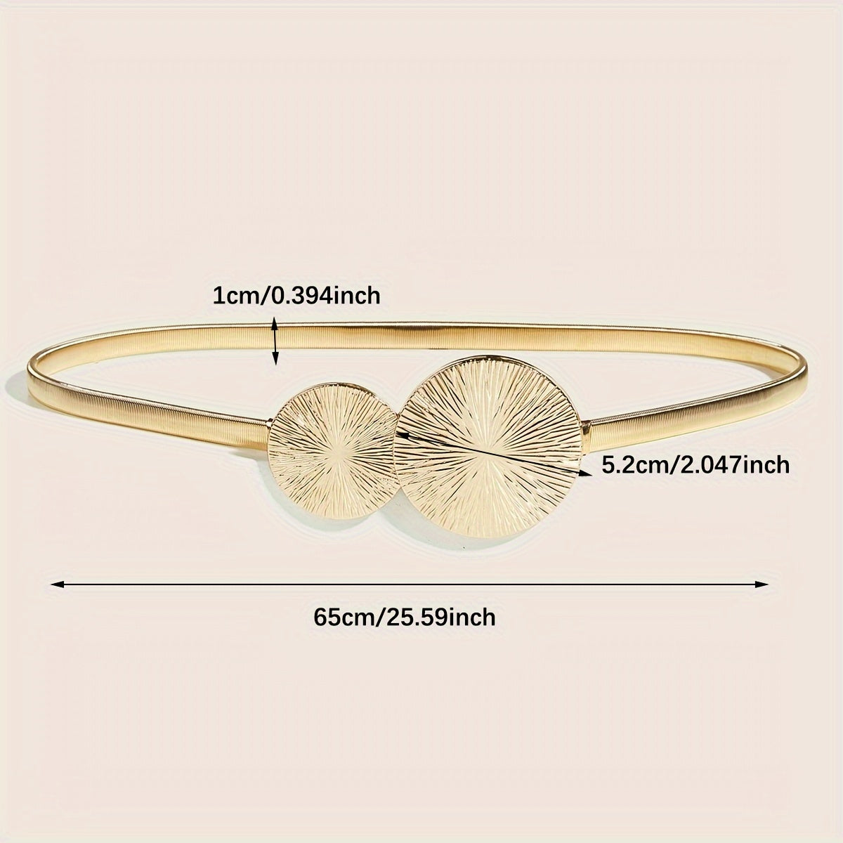 Add a touch of elegance to your outfit with this Golden Ring Metal Belt. Perfect for daily use or special occasions, this thin elastic belt is a versatile accessory that will enhance your style.