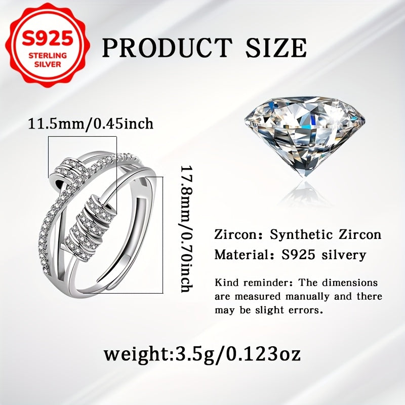This open ring features a rotating synthetic zirconia inlay, perfect for daily wear. Weighing just 3.5 grams, it's a stylish accessory that can help relieve anxiety.