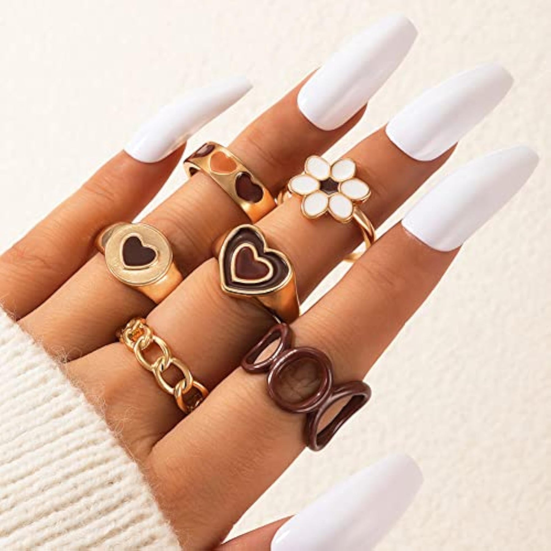 Elevate your style with this set of 6 trendy finger rings, perfect for adding a touch of glamour to your outfit. The rings are made of silver and feature various chic designs.