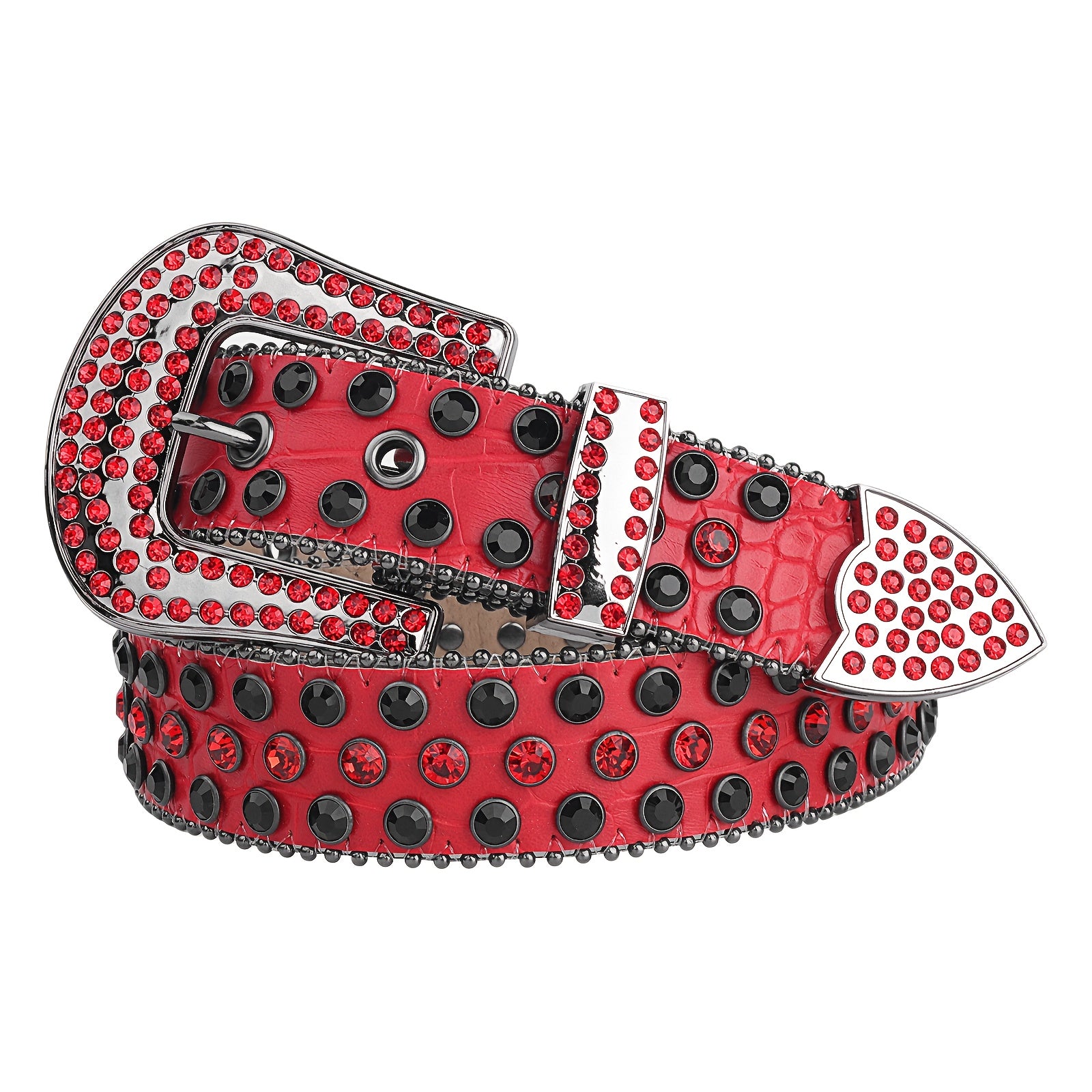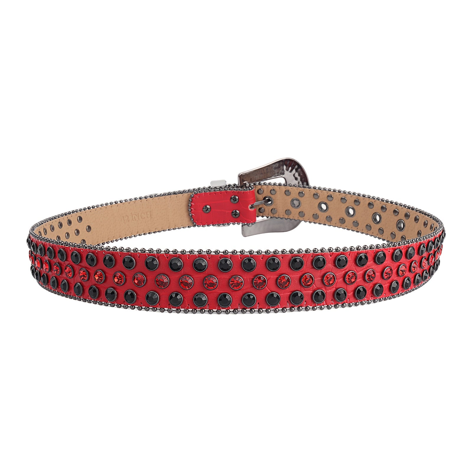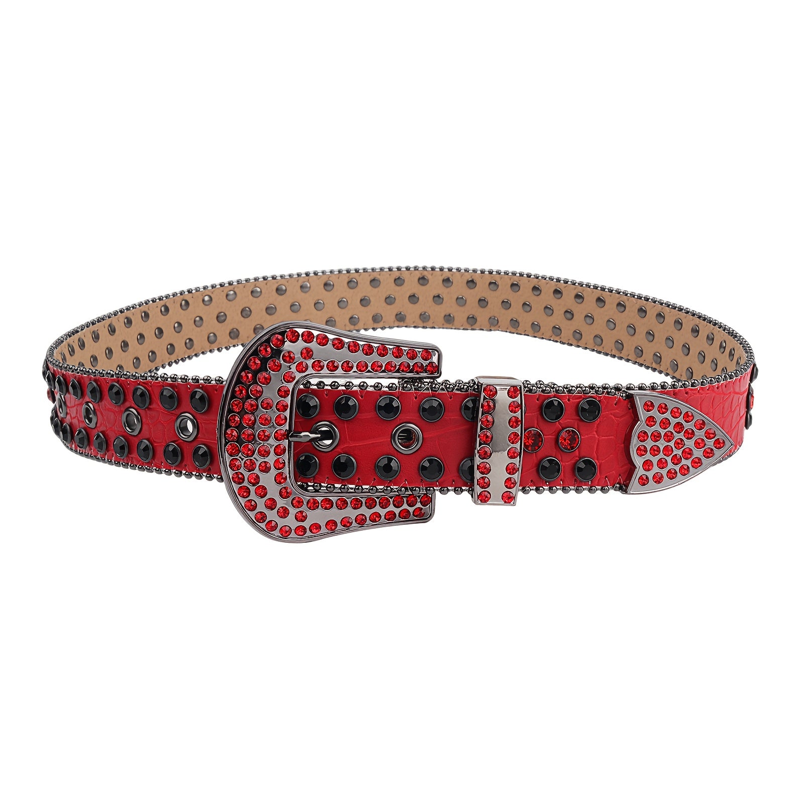 Add some sparkle to your outfit with this punk-inspired rhinestone belt. Made of red faux leather, it features a Western-style buckle, perfect for jeans or a festive look.