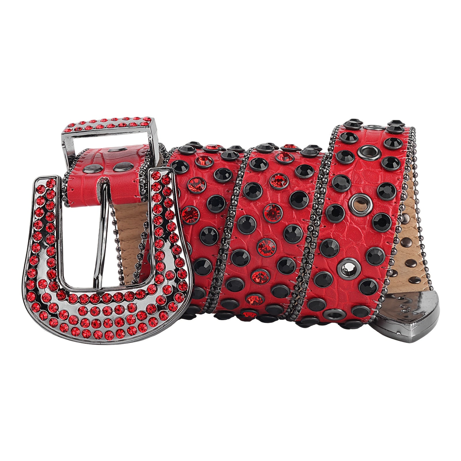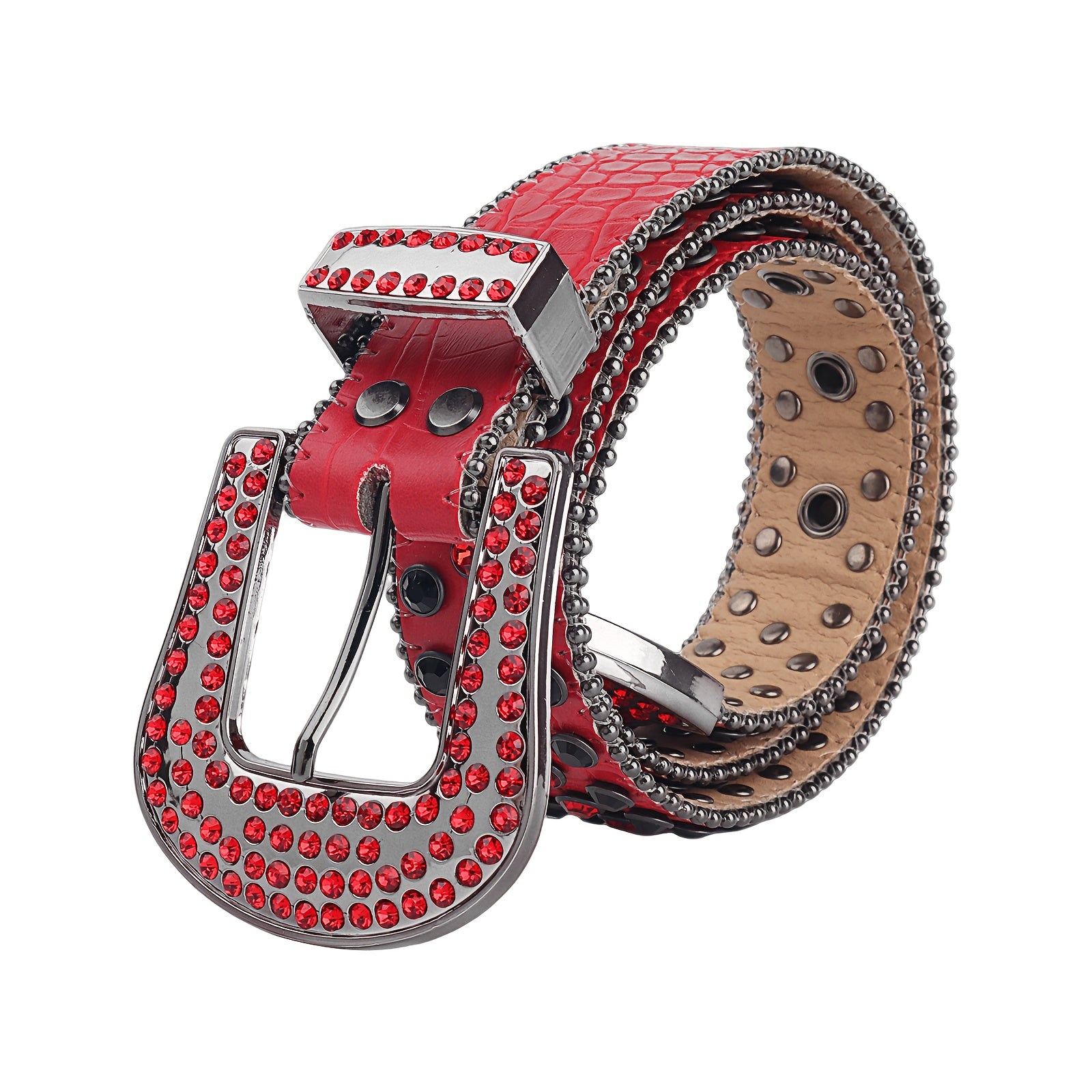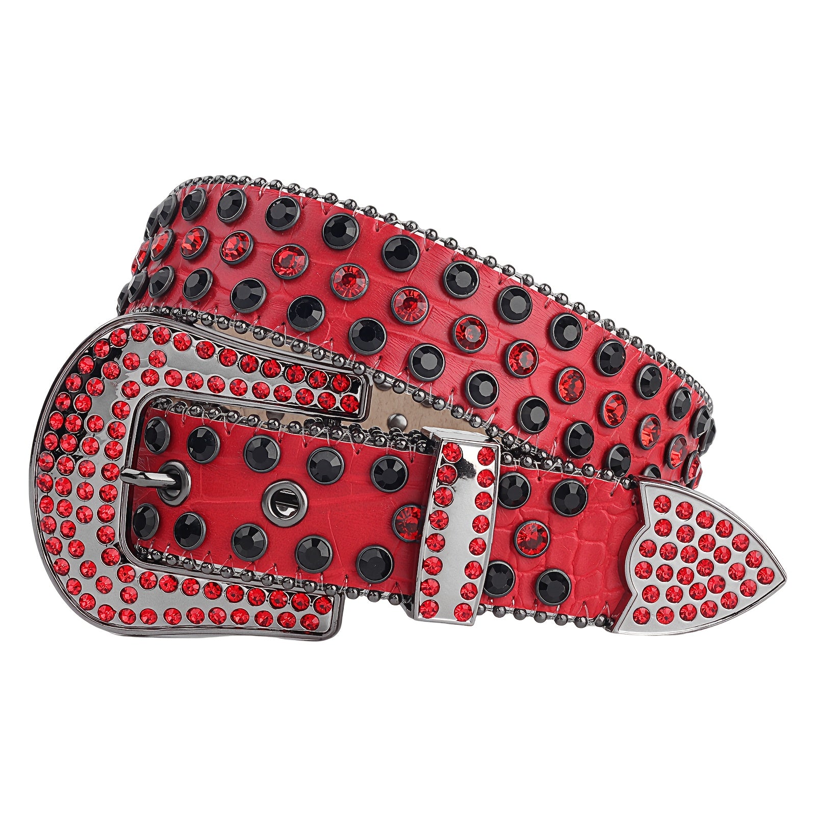 Add some sparkle to your outfit with this punk-inspired rhinestone belt. Made of red faux leather, it features a Western-style buckle, perfect for jeans or a festive look.