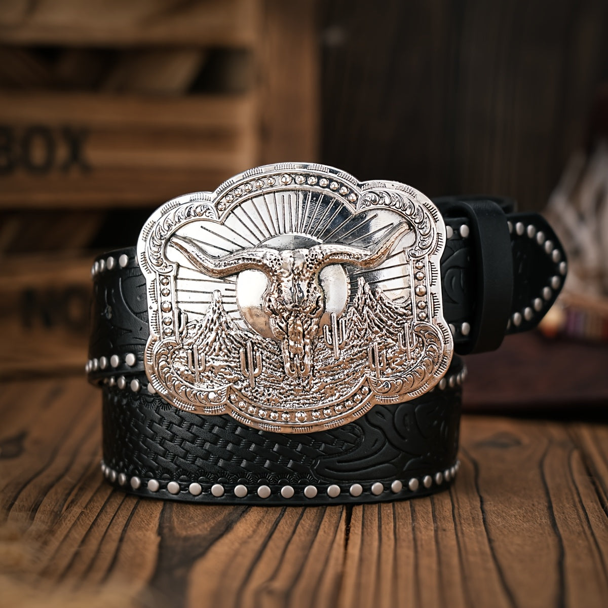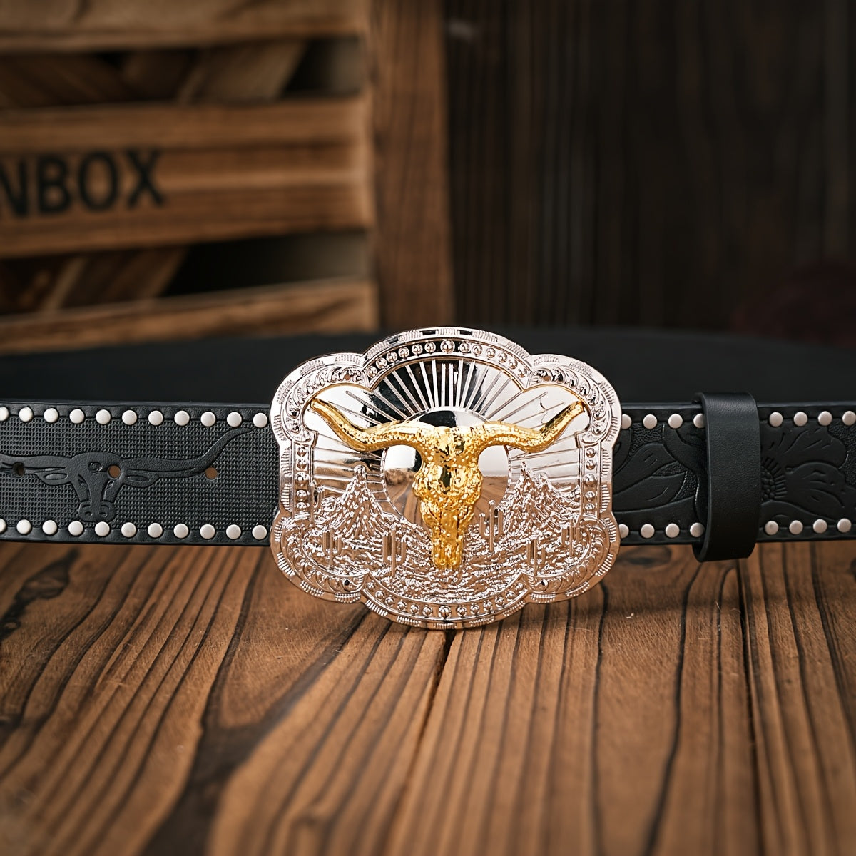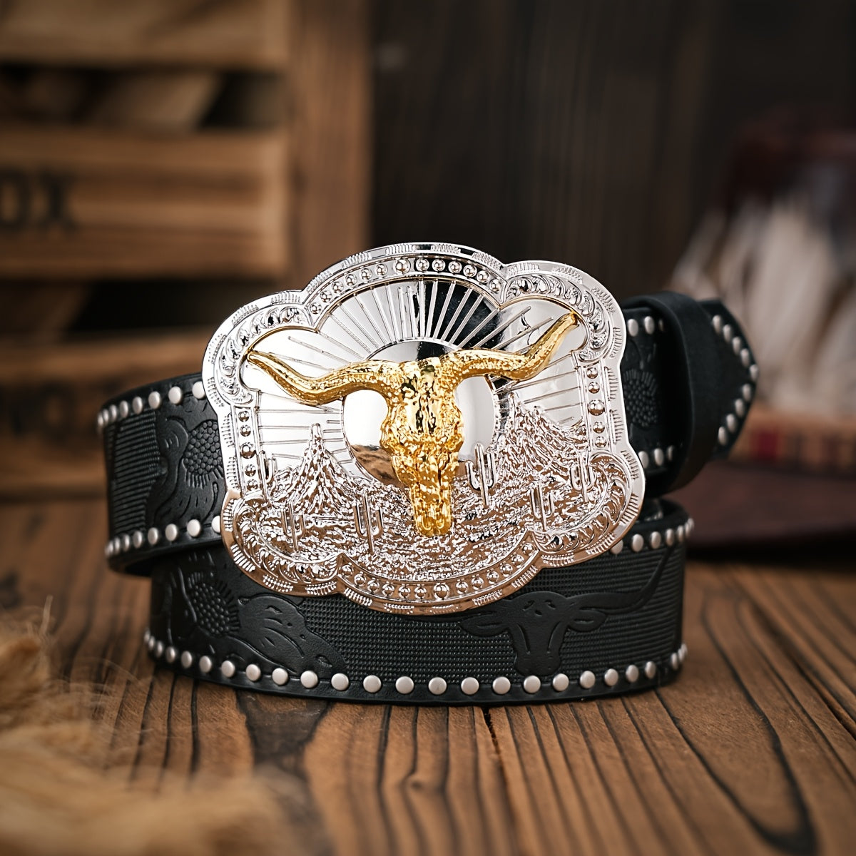 Embrace the western vibe with this casual unisex belt featuring a golden bull head buckle and animal embossed design. Made with high-quality PU material.