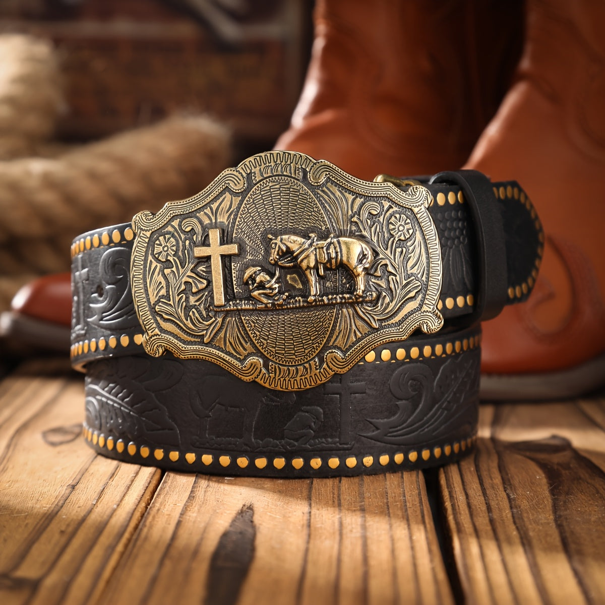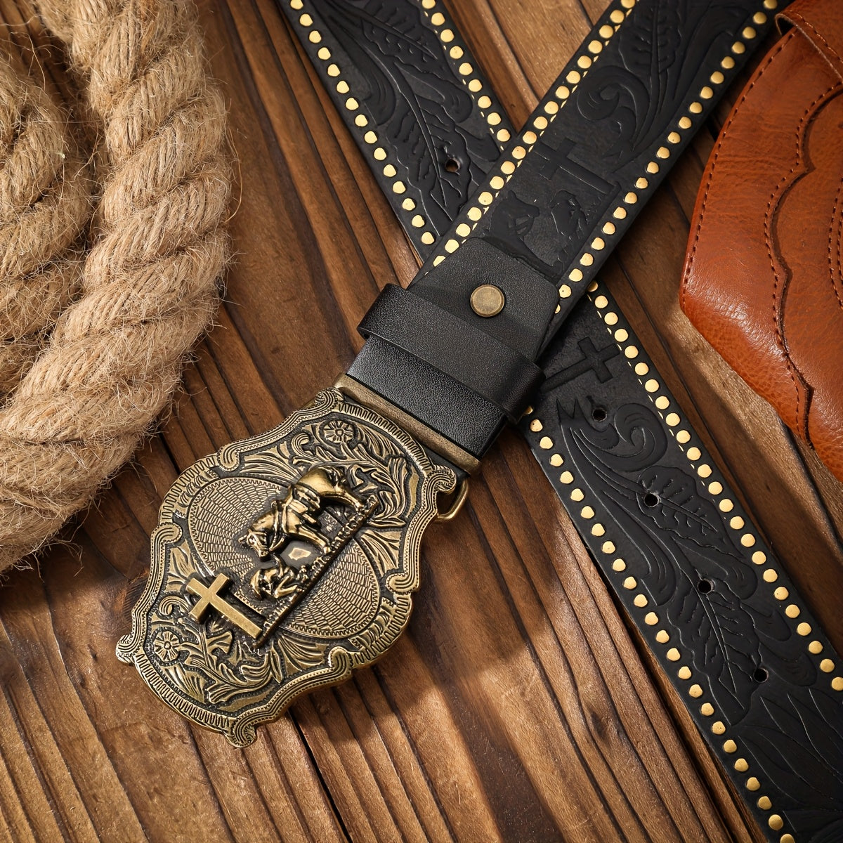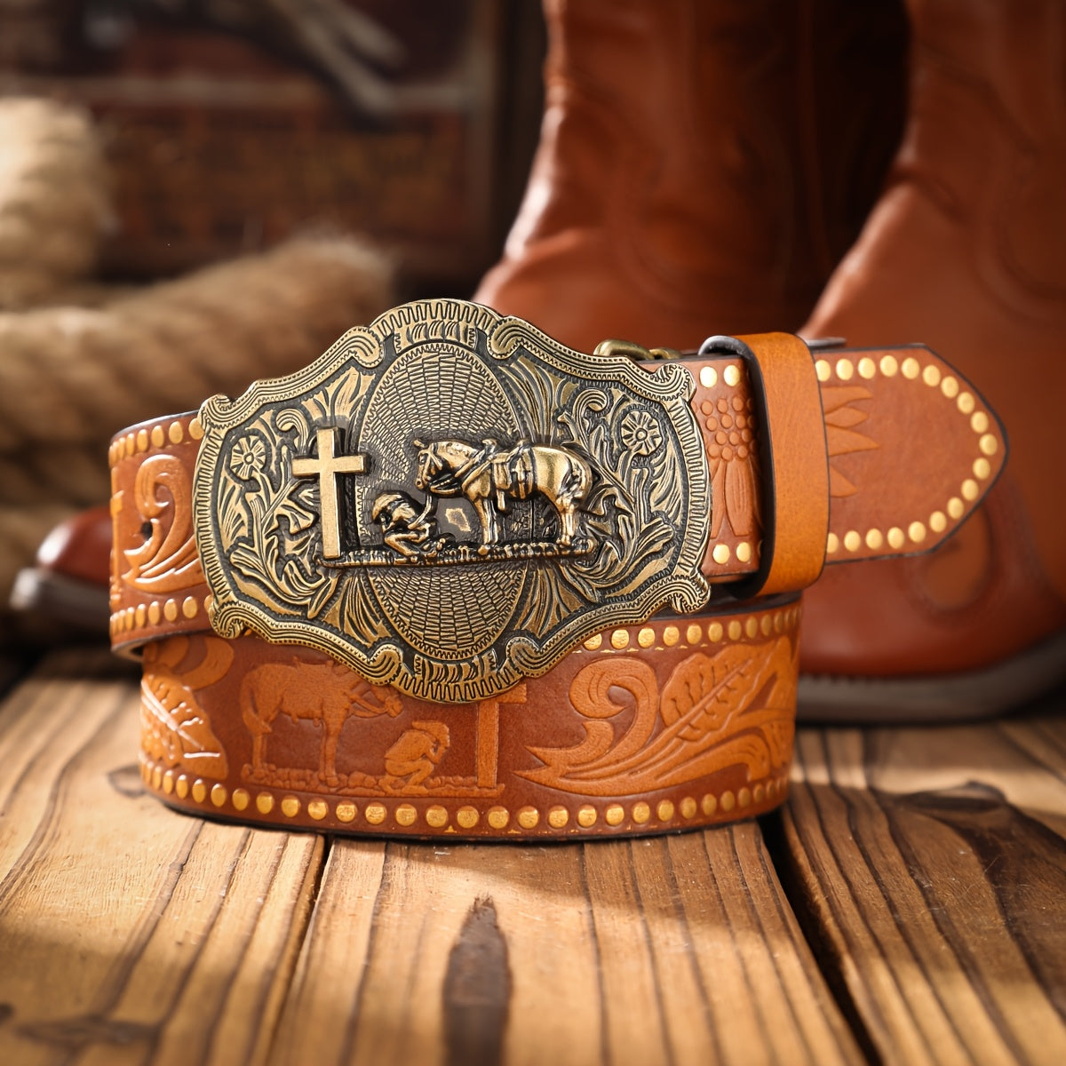 This Western Cowboy Belt features faux leather with embossed detailing, a bull rider emblem, and an alloy metal buckle. It is designed for men, women, and teens for casual Western wear.