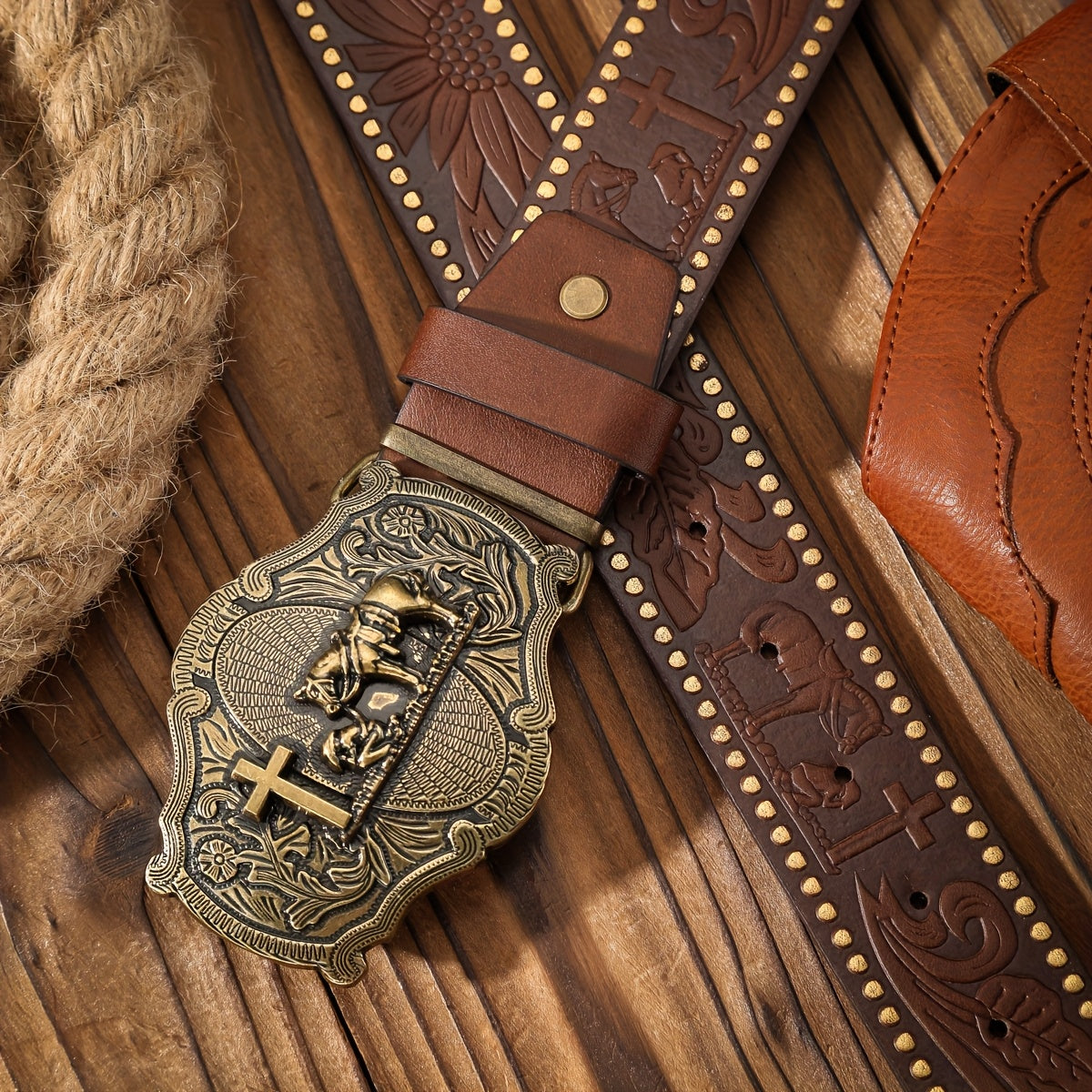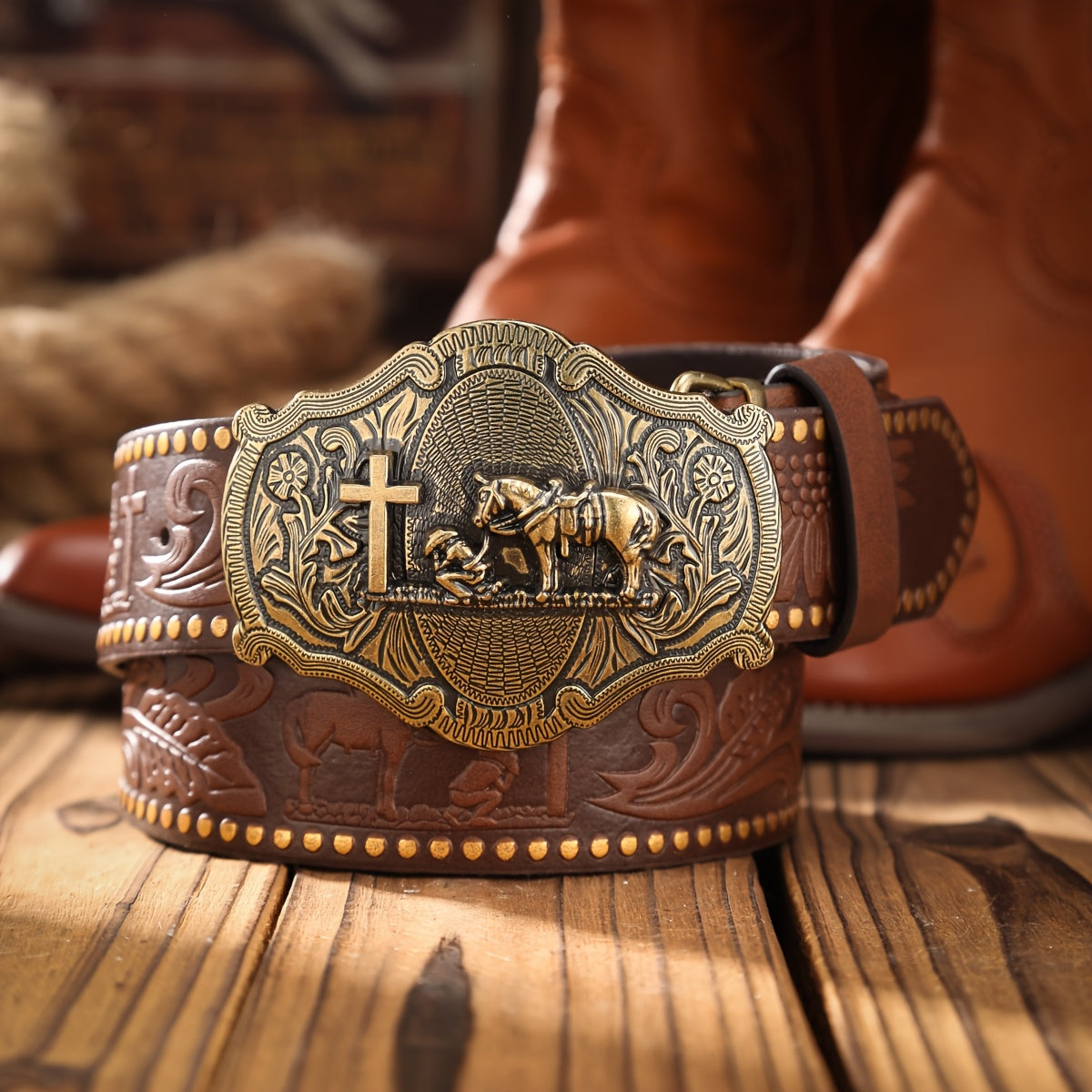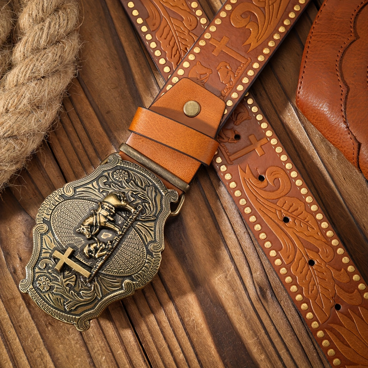 This Western Cowboy Belt features faux leather with embossed detailing, a bull rider emblem, and an alloy metal buckle. It is designed for men, women, and teens for casual Western wear.