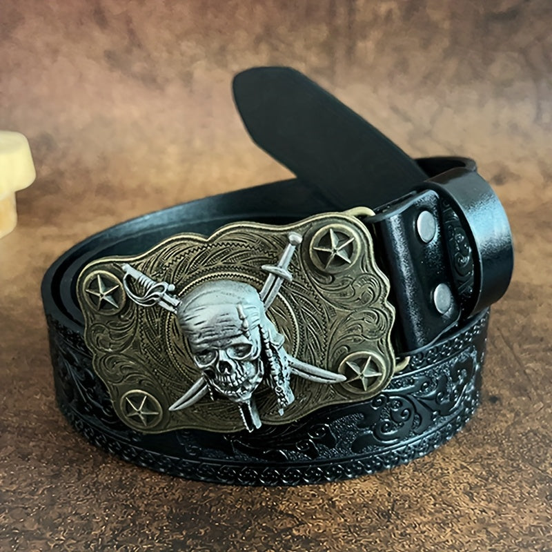 Vintage silvery buckle featuring pirate skull and floral engraving, perfect for jeans.