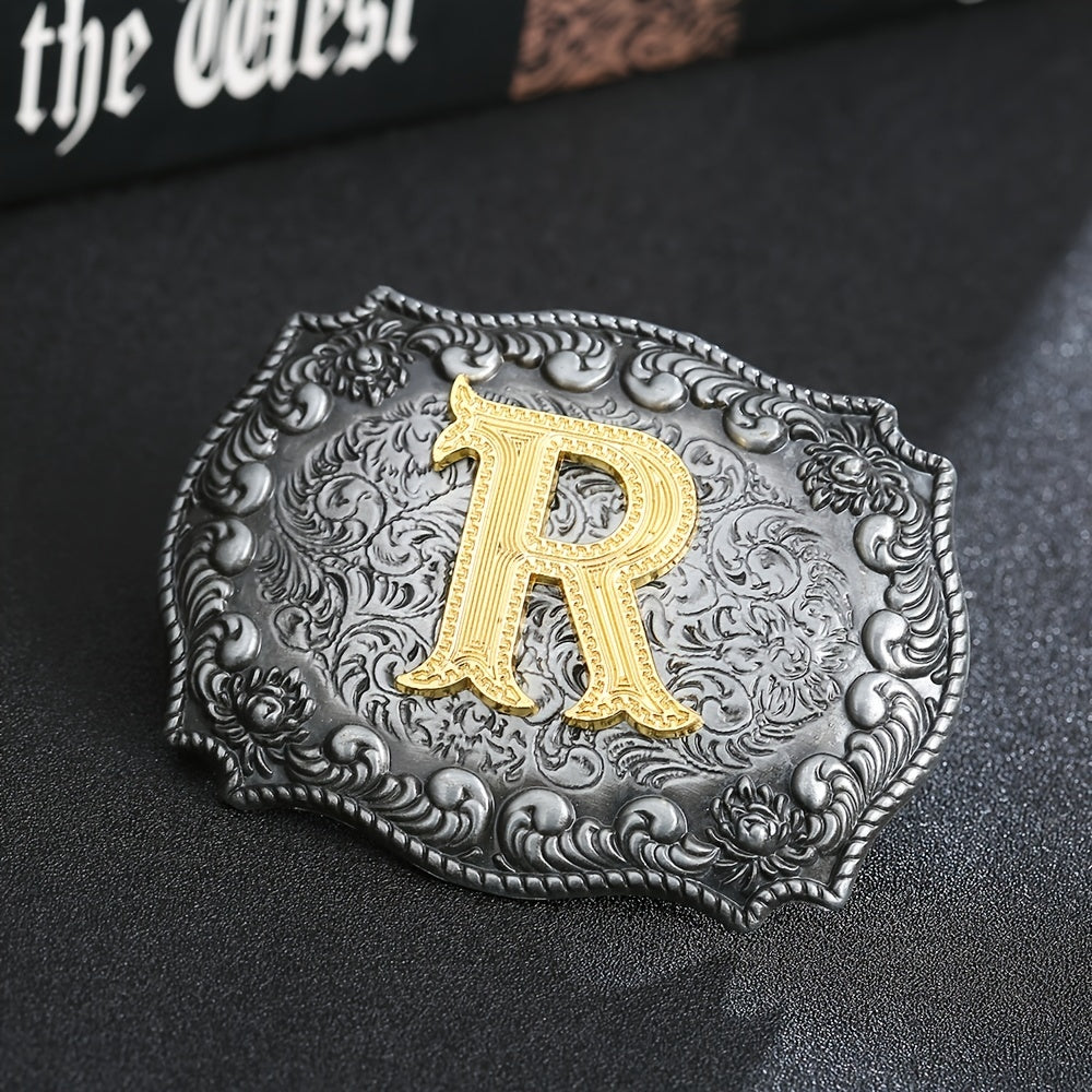 Add a touch of Western style with this unique denim belt buckle featuring the letter R. Perfect for enhancing your outfit.