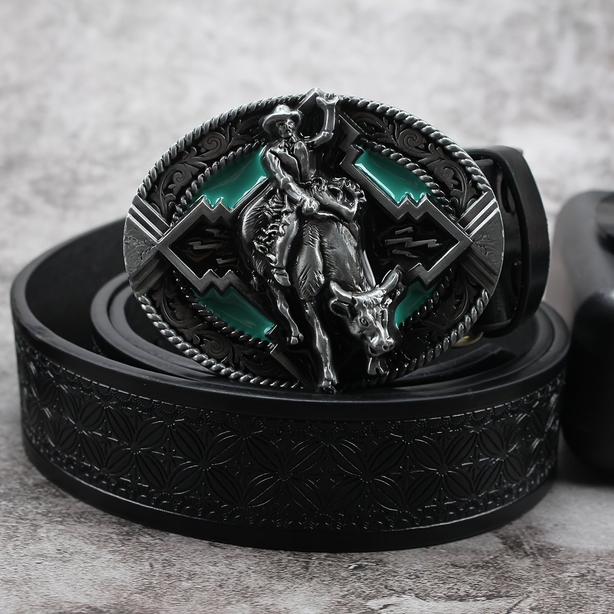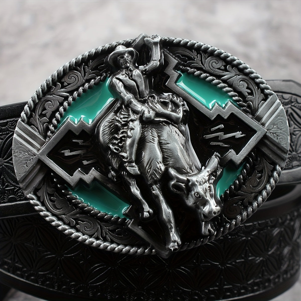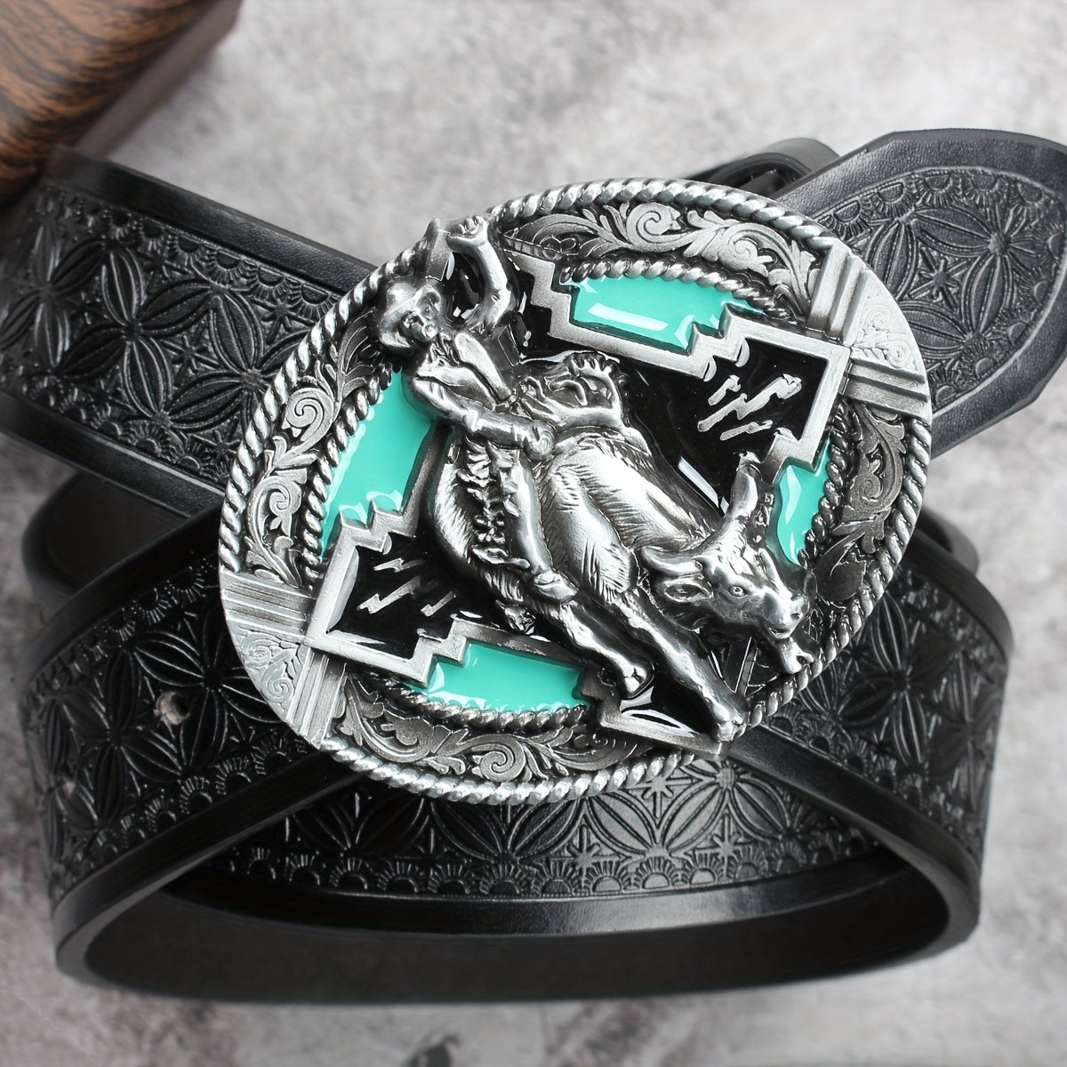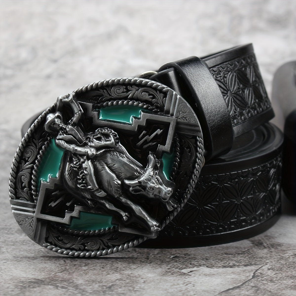 Add a touch of retro charm to your outfit with this faux leather waist belt featuring an alloy buckle adorned with a rodeo rider design.
