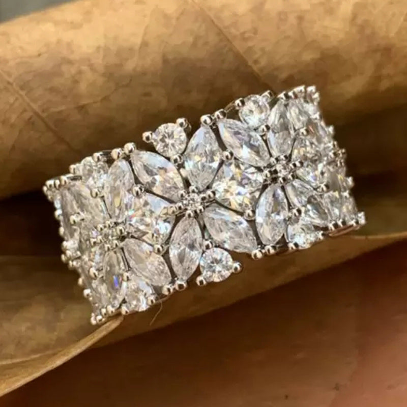 Elevate your casual attire with this wide band ring featuring a delicate synthetic zirconia flower. Perfect for parties or as an anniversary gift.