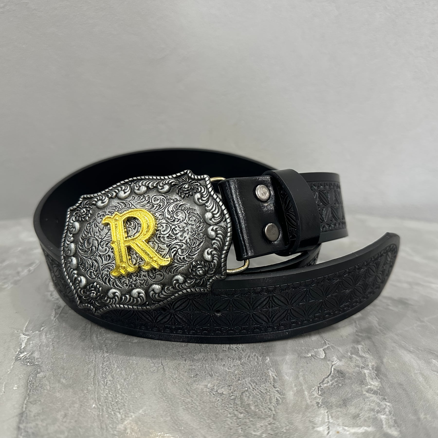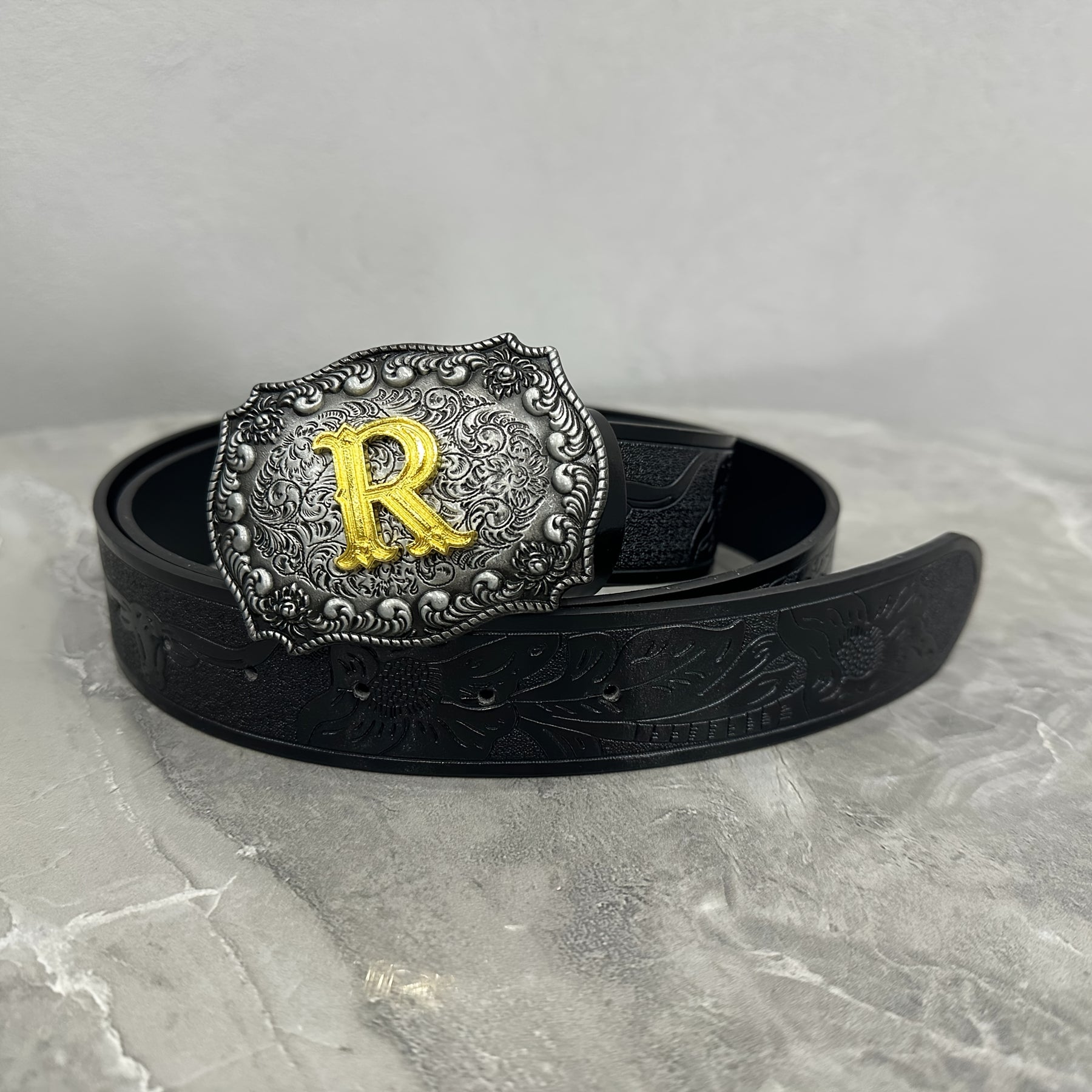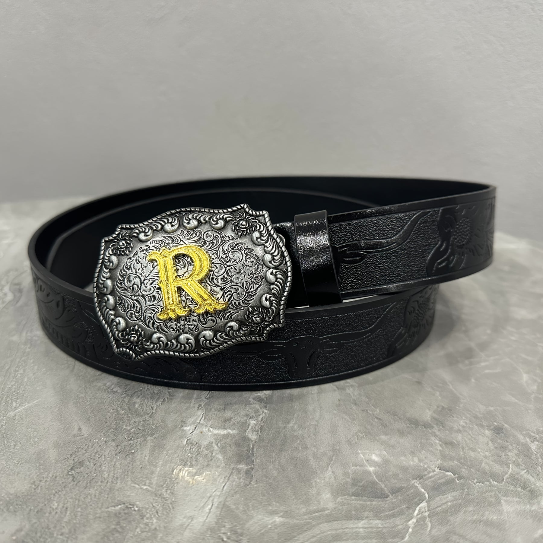 This stylish waist belt features a durable alloy buckle with a golden R emblem. It is a fashionable accessory suitable for both men and women.
