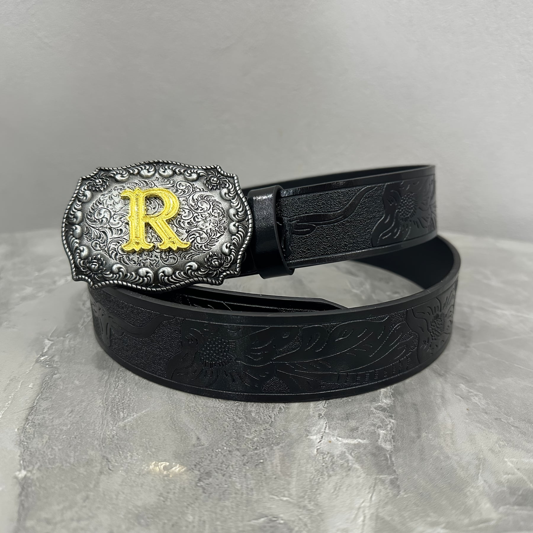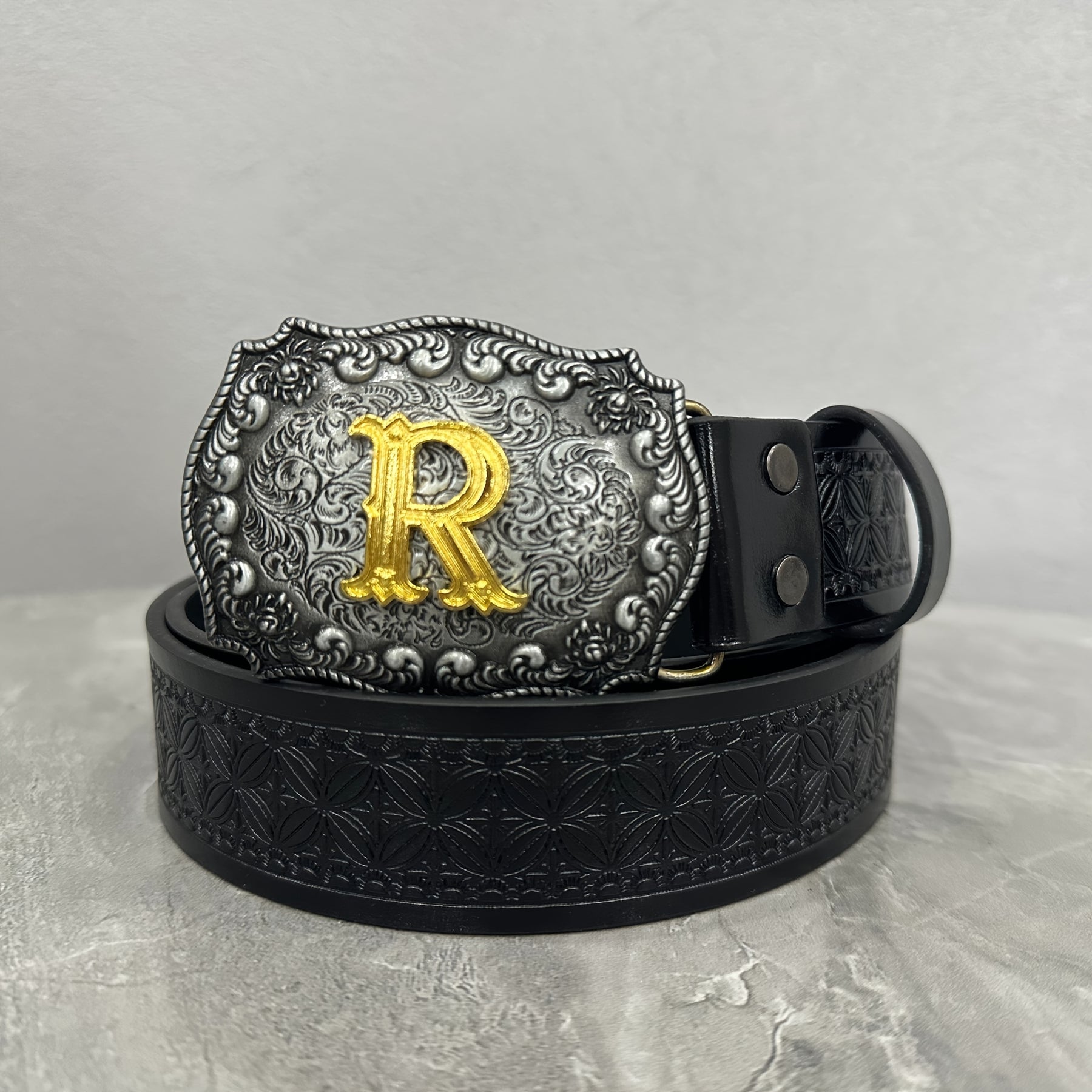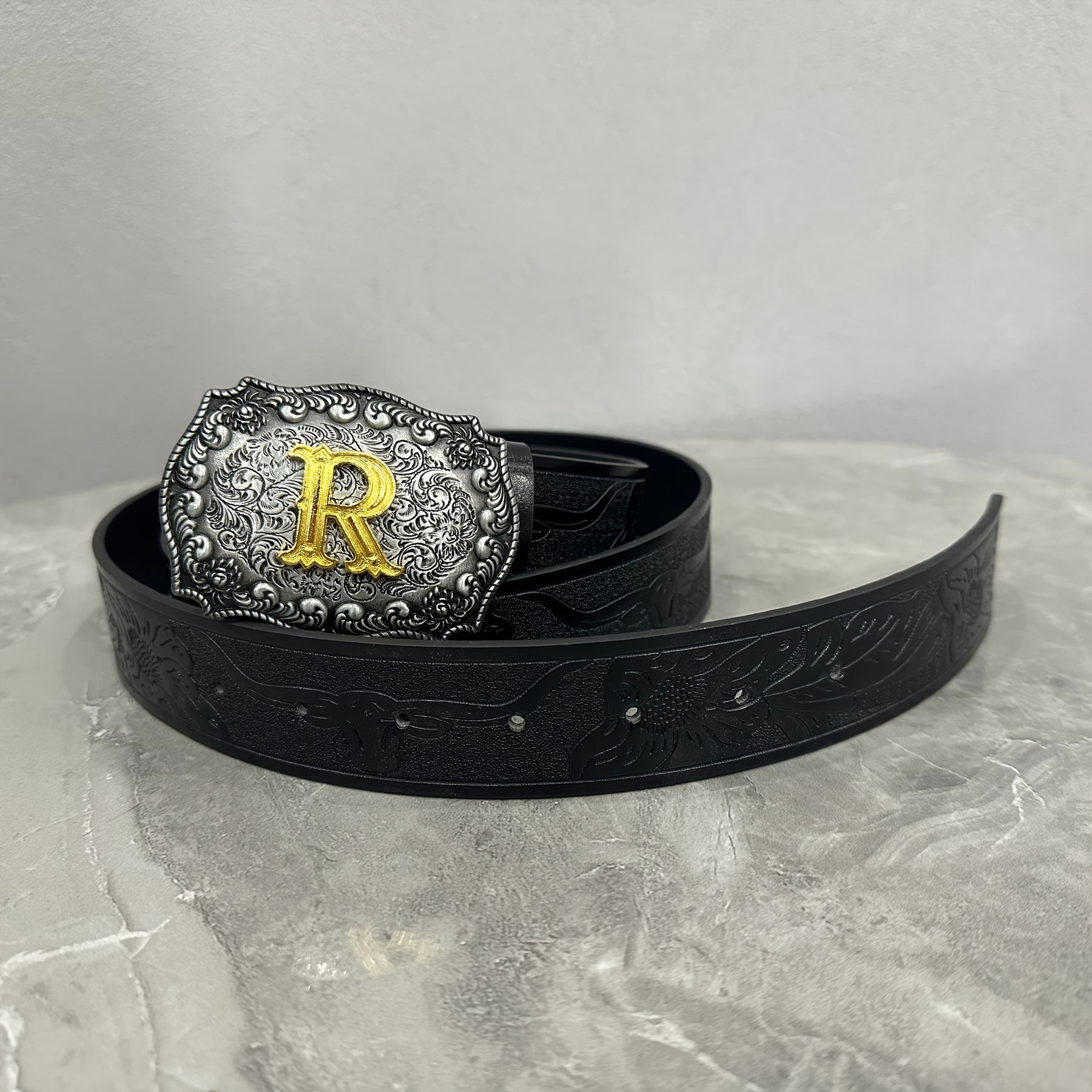 This stylish waist belt features a durable alloy buckle with a golden R emblem. It is a fashionable accessory suitable for both men and women.
