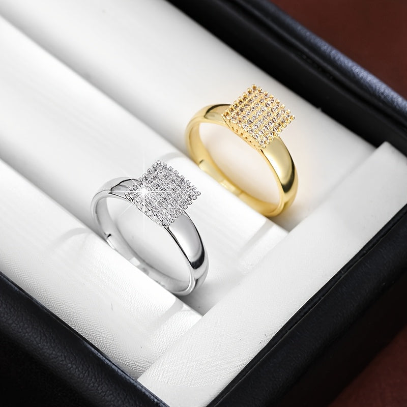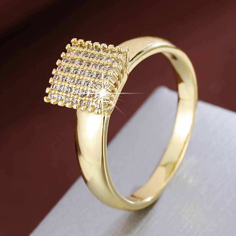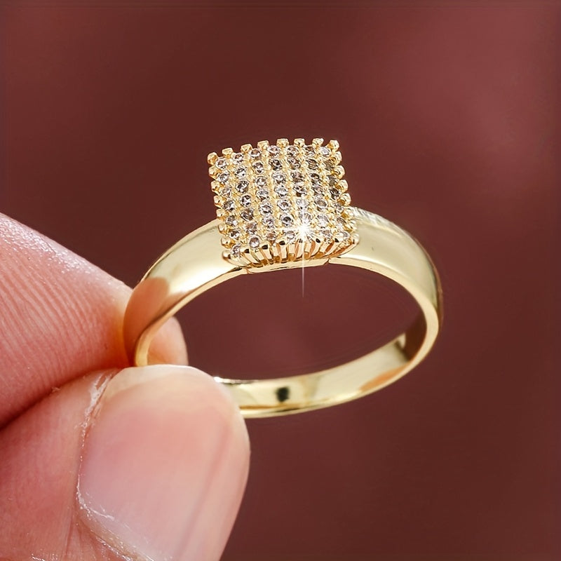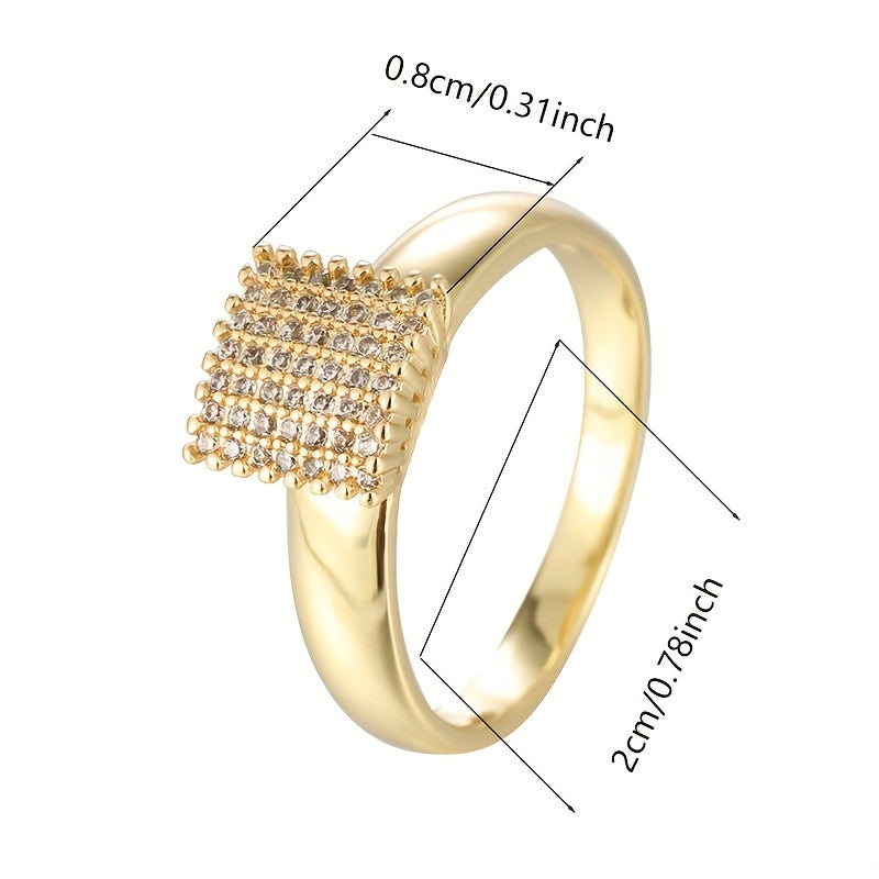 This elegant geometric square engagement ring features synthetic zircon stones and is made of copper plated with K. It is a versatile accessory suitable for all seasons.