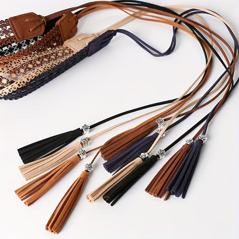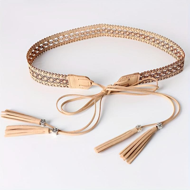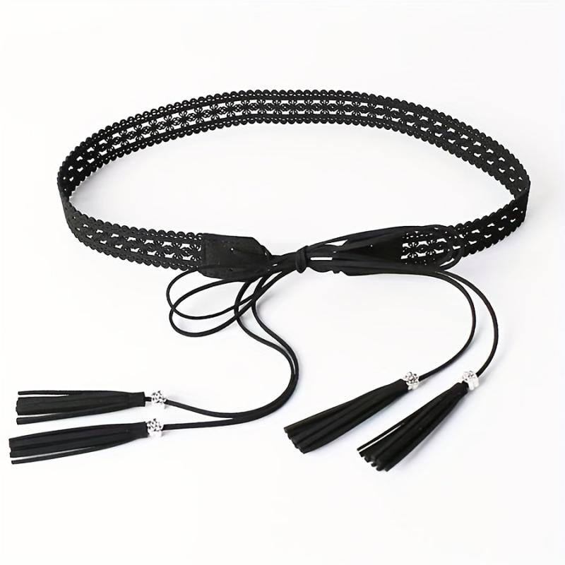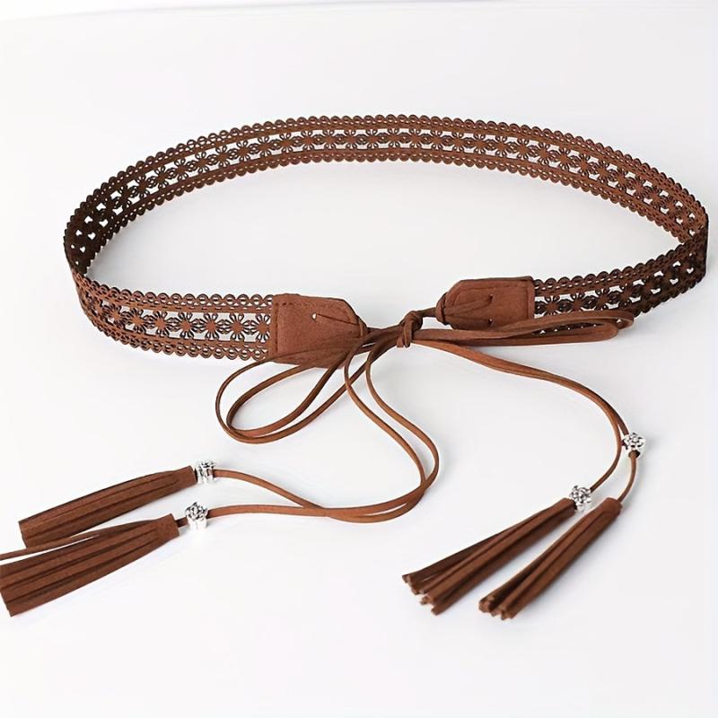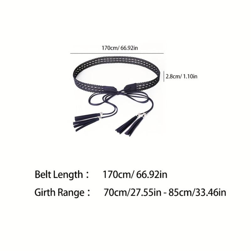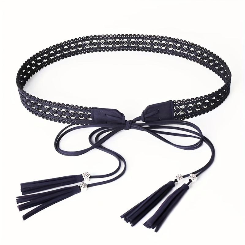 Add a touch of ethnic-inspired style to your outfits with this adjustable waist belt. Perfect for both casual and formal occasions, this belt features a unique design with lace and tassel detailing.