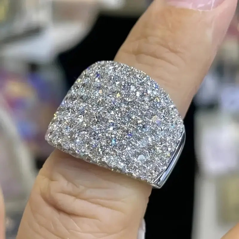 Dazzle in this sparkling wide band wedding ring featuring synthetic zirconia stones. This blingbling ring is perfect for weddings, parties, and daily wear. Made with golden plating, it's a stunning choice for any occasion.