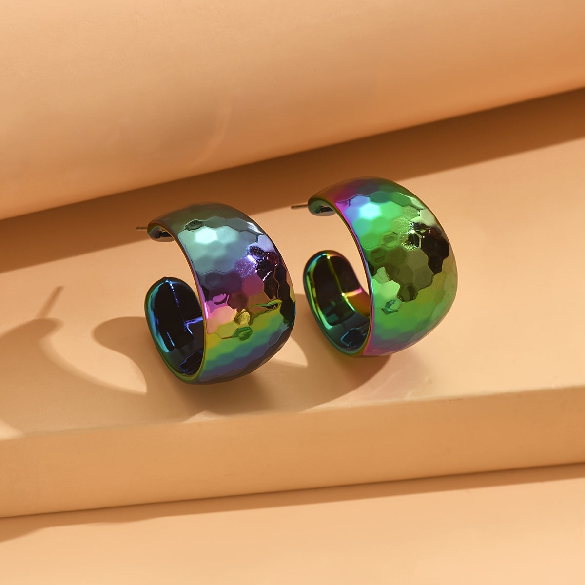 Add a pop of vibrant color to your outfit with these yellow acrylic hoop earrings. Their glossy marbled texture and lightweight design make them perfect for parties and gifting. Bring a touch of retro flair to any look with these playful iridescent earrings.