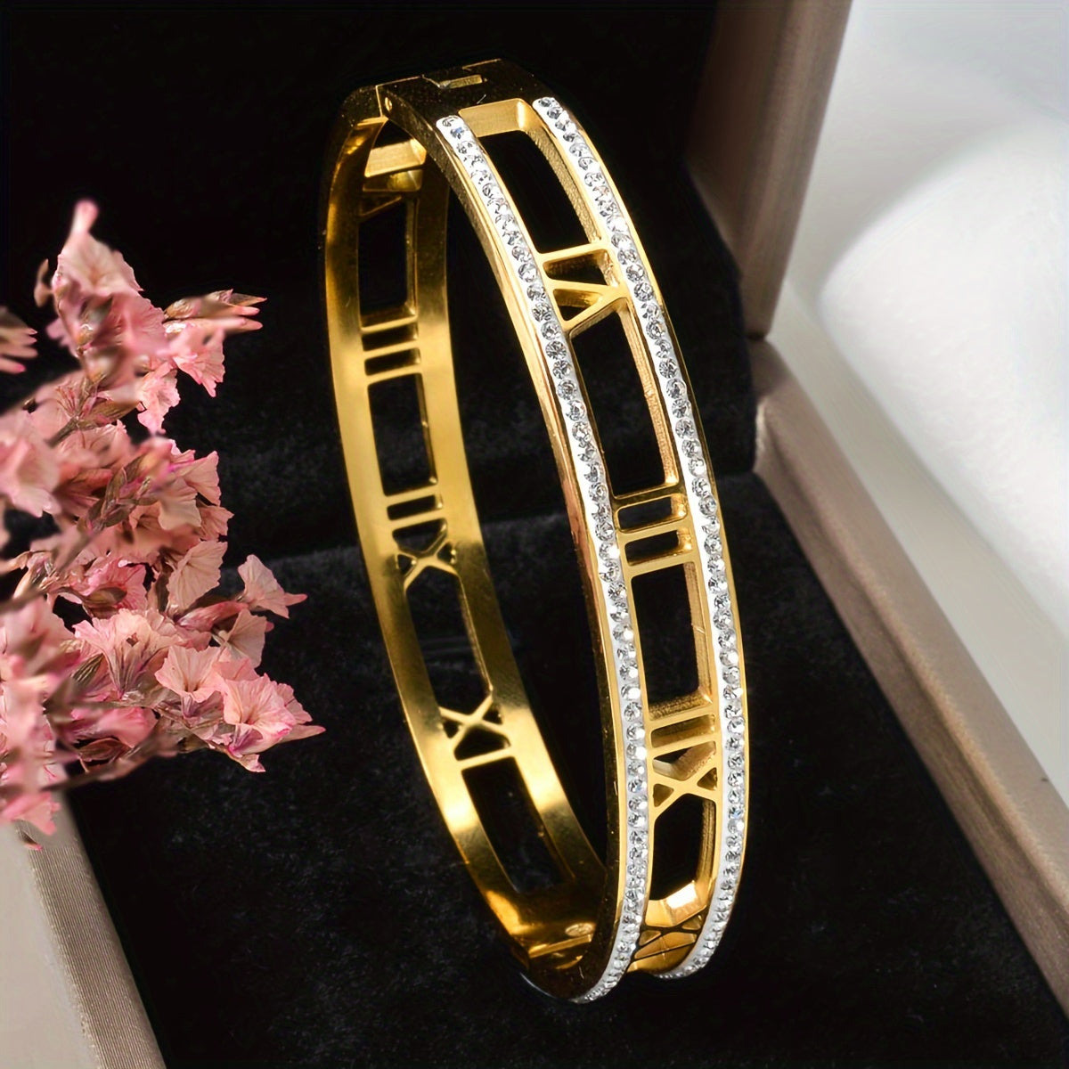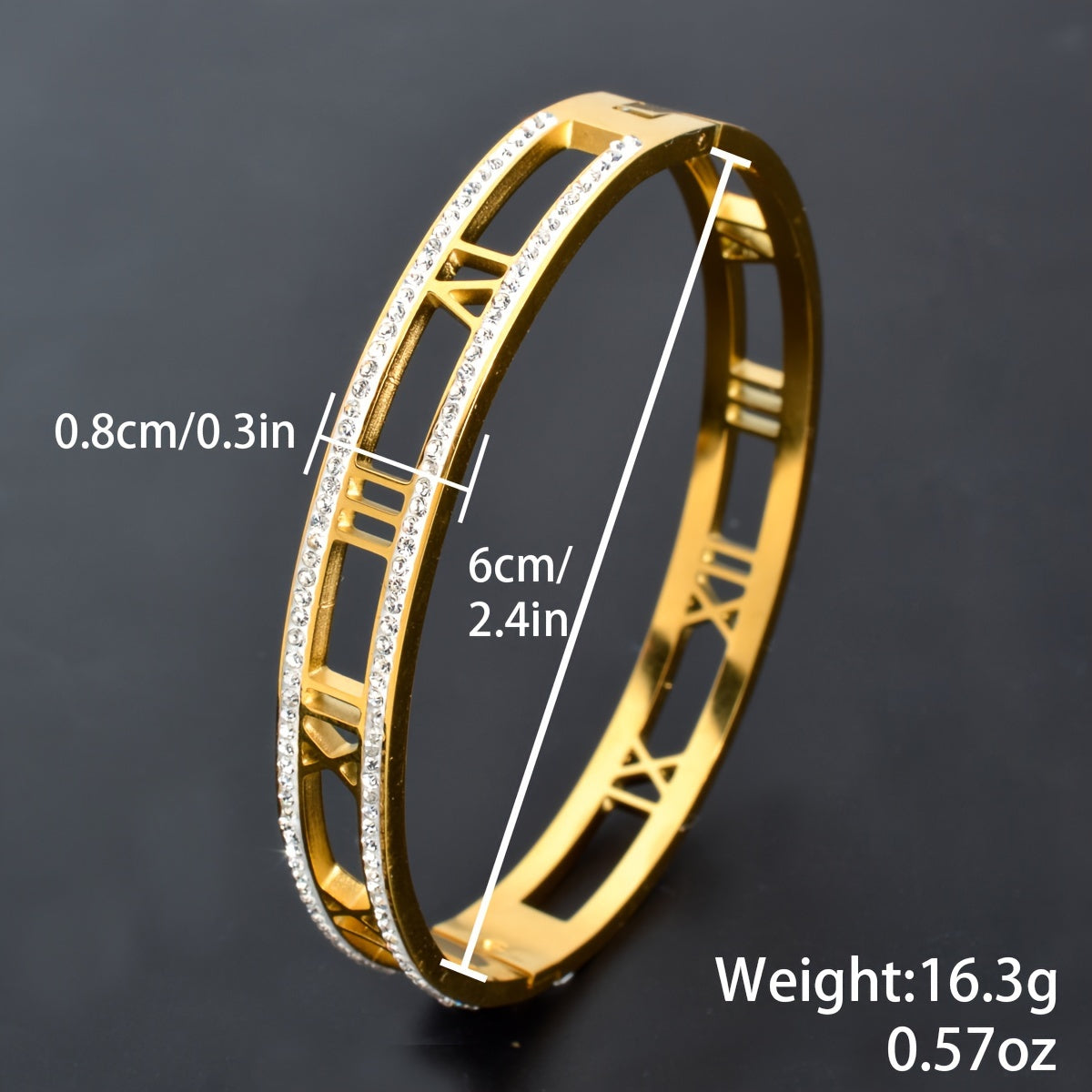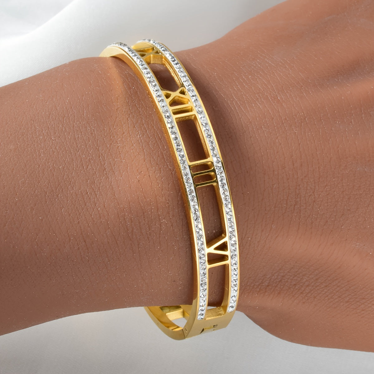 Stylish Roman numeral cuff bracelet crafted from stainless steel with sparkling stones. Perfect for men and women, this punk-style piece makes a great gift for birthdays.