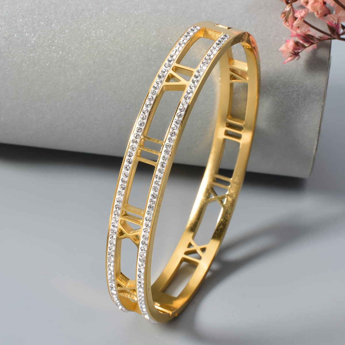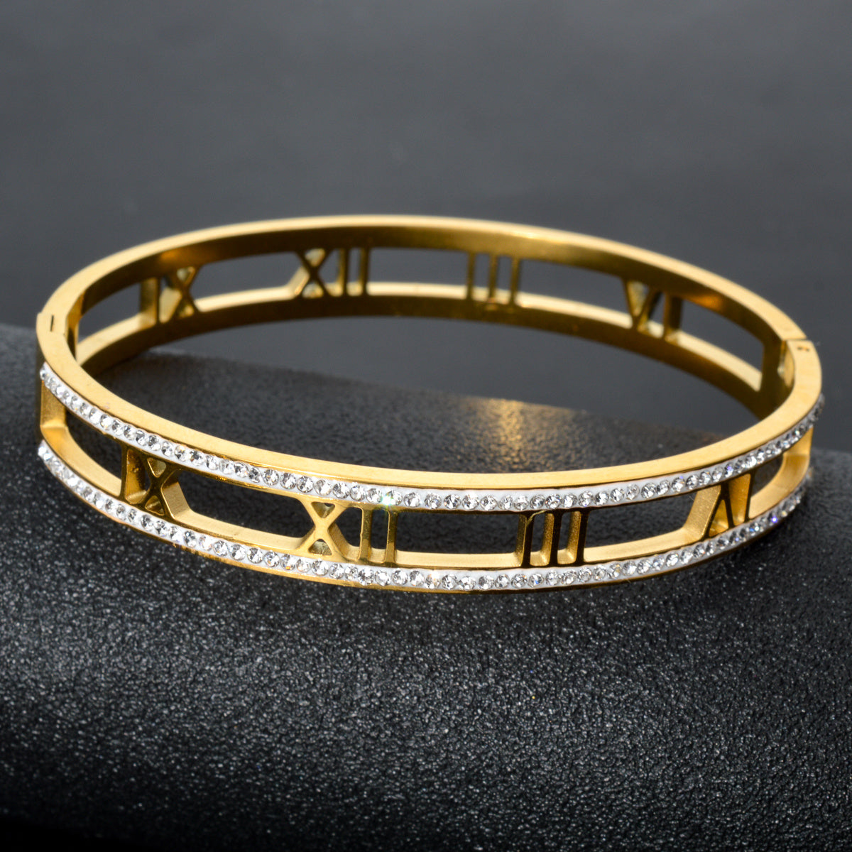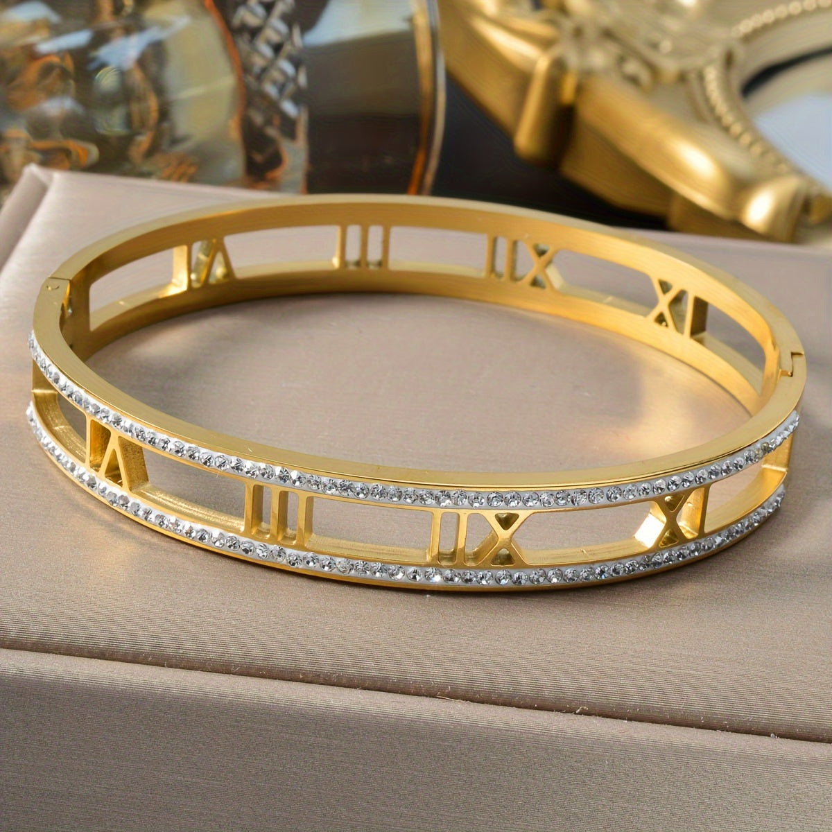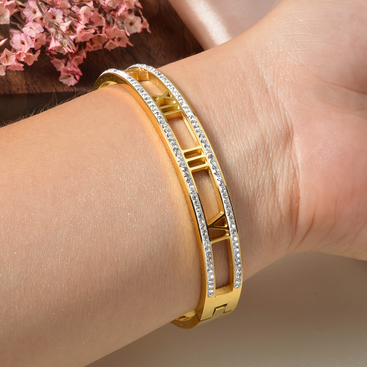 Stylish Roman numeral cuff bracelet crafted from stainless steel with sparkling stones. Perfect for men and women, this punk-style piece makes a great gift for birthdays.