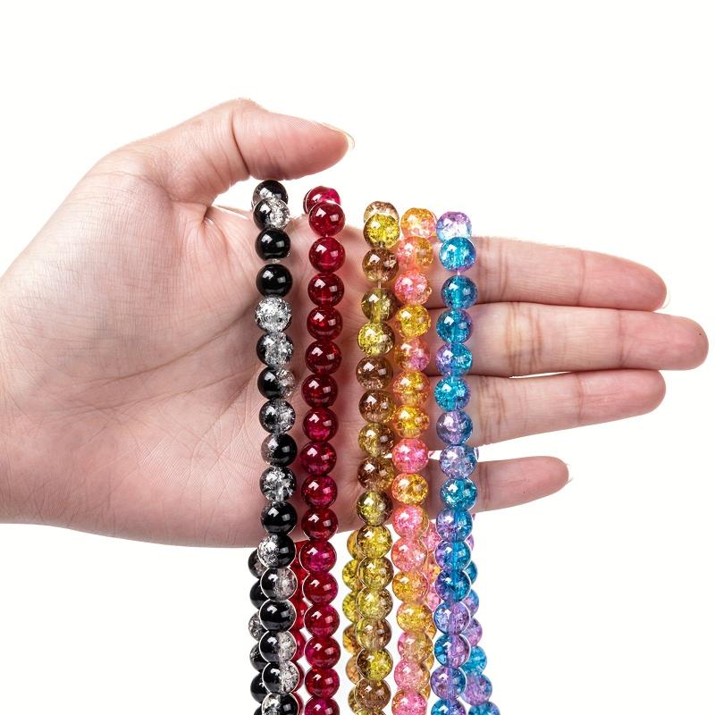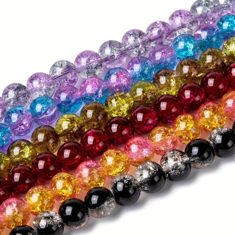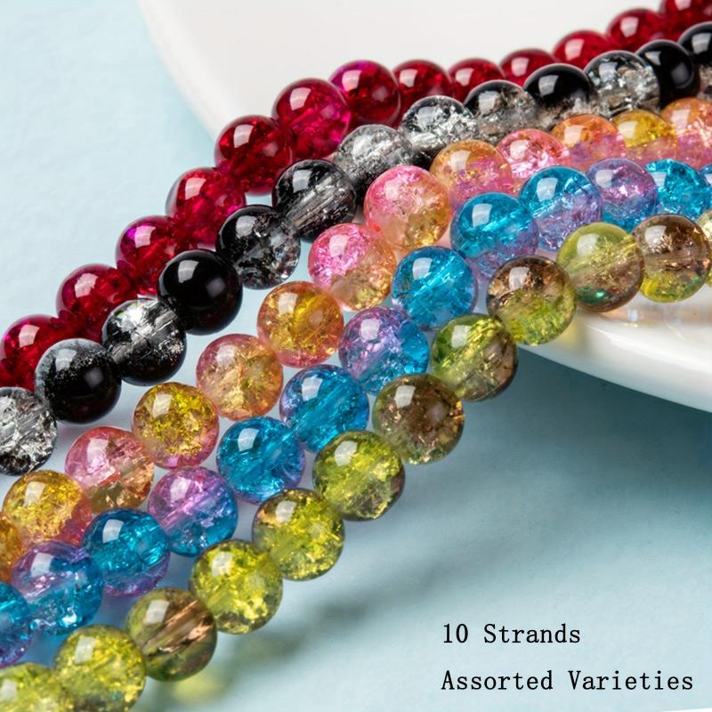 Get creative with this DIY jewelry making kit featuring 10 strands of 8mm assorted varieties two tone crackle glass beads. Perfect for making bracelets, earrings, and necklaces.