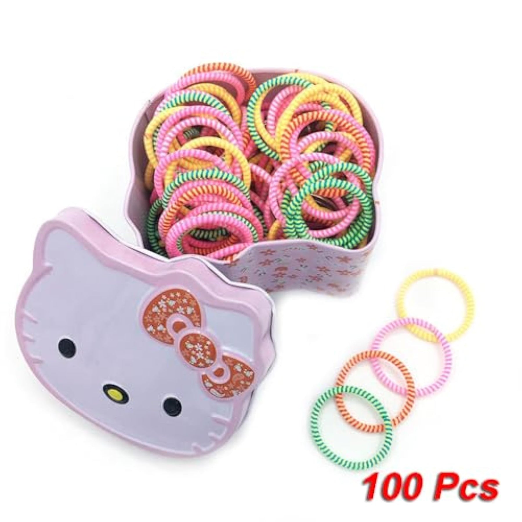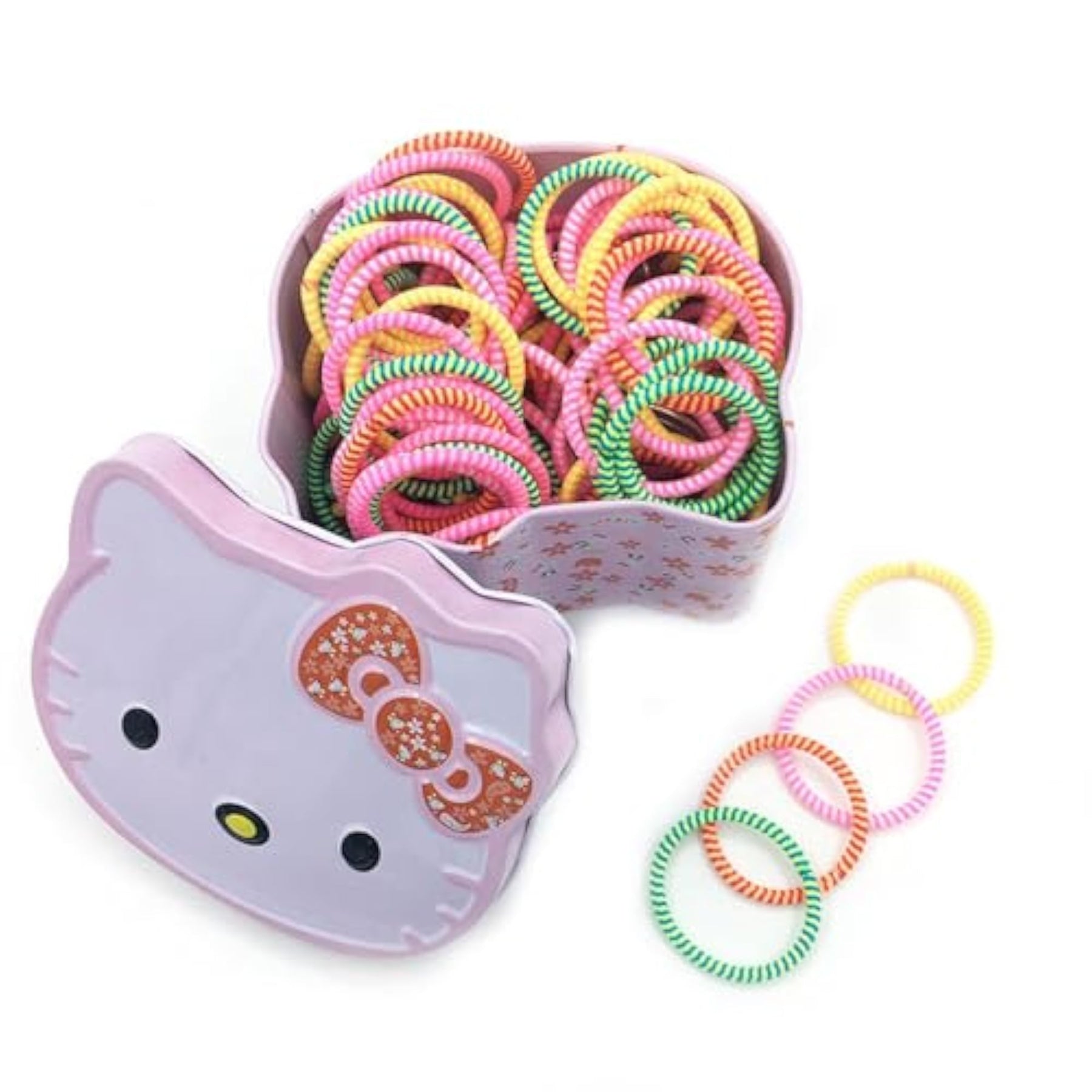 100 pcs Elastic Hair Bands Ties with Tin Kitty Box