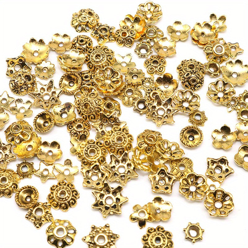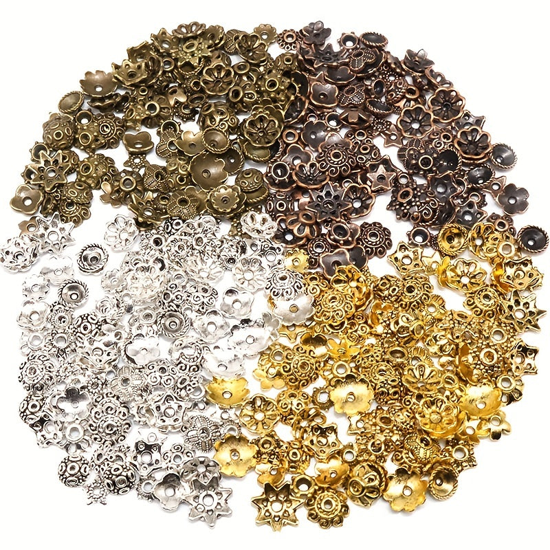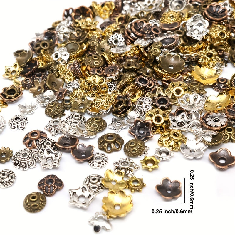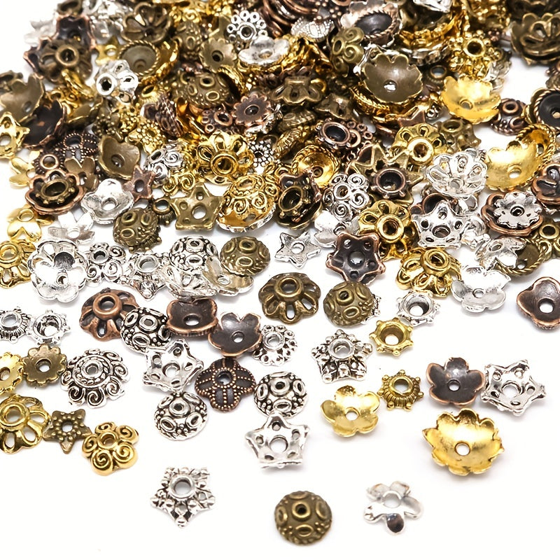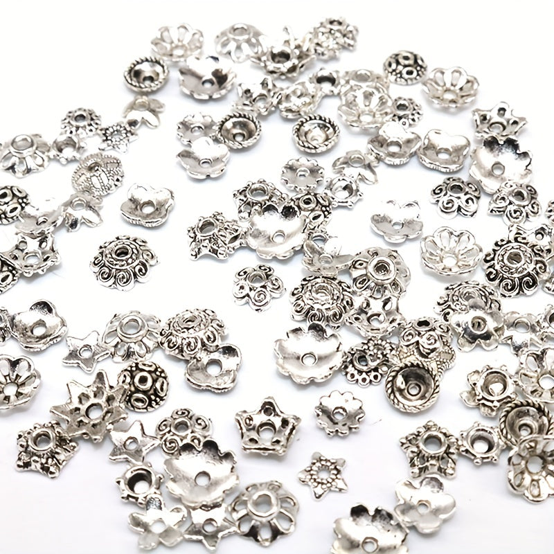 Add a touch of vintage elegance to your DIY projects with this set of 100 antique silver bead hats featuring flower bead accents. Perfect for creating unique jewelry pieces or embellishing clothing and accessories.