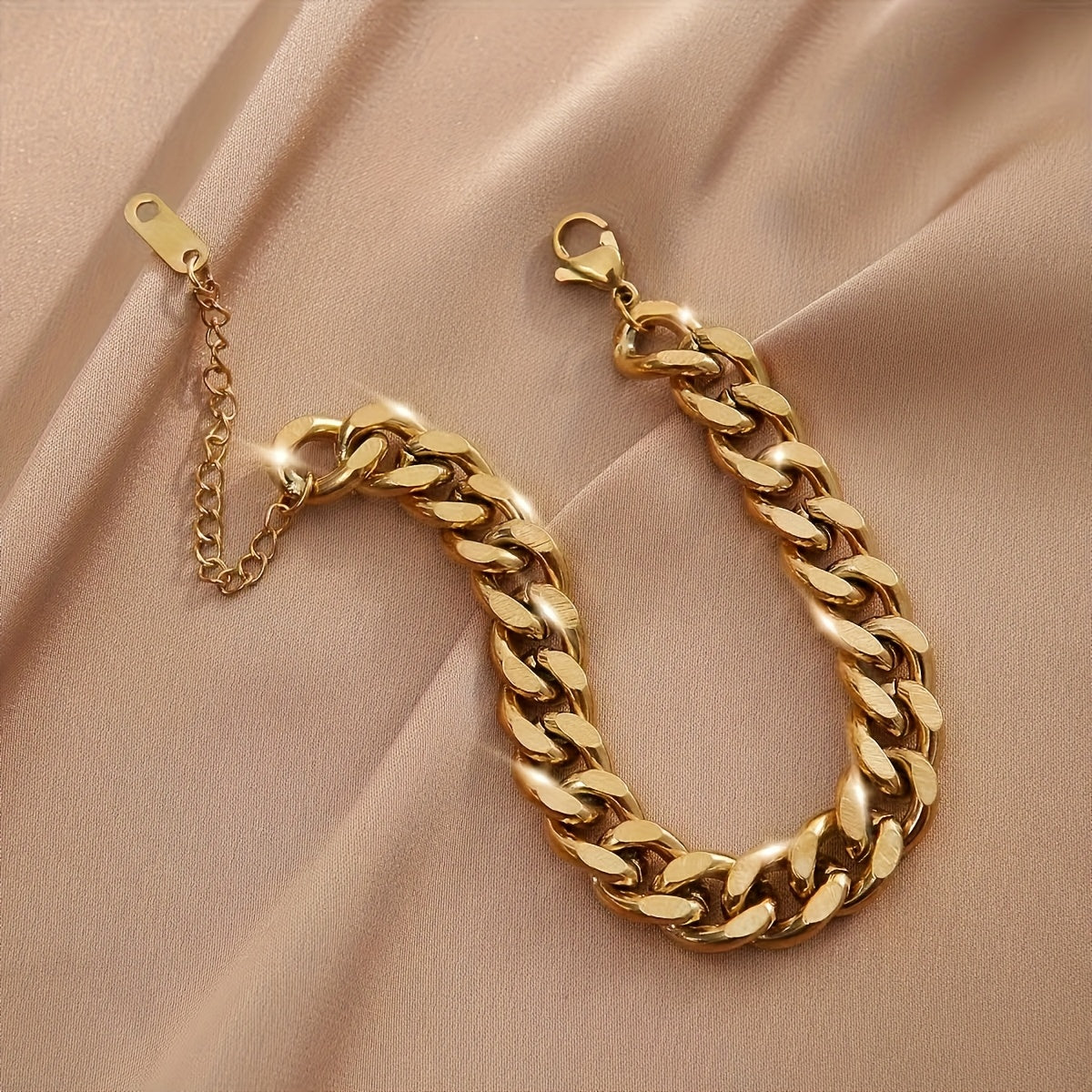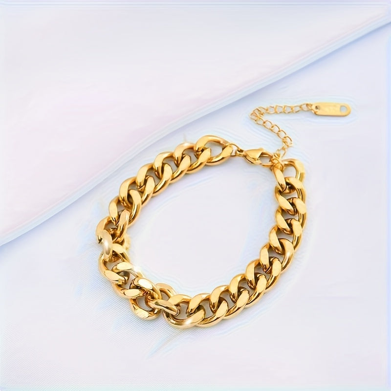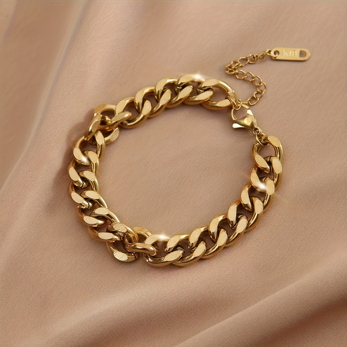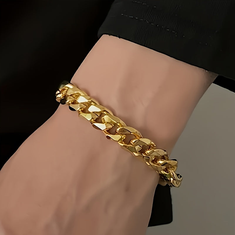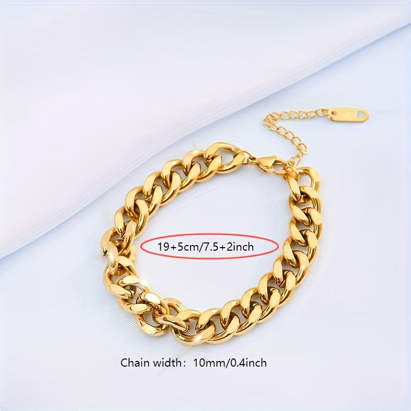 This unisex bracelet features a 10mm wide Cuban link chain design in a hip hop style with a golden tone, made of durable and tarnish-resistant titanium. It is suitable for men and women to wear with casual attire or at parties.
