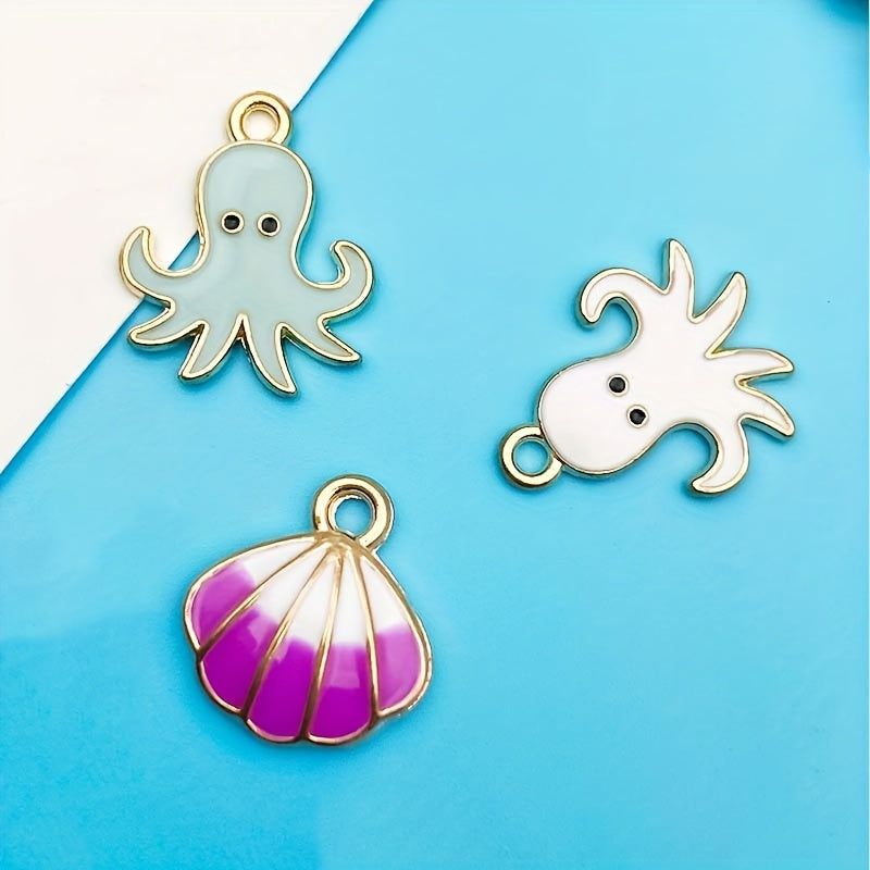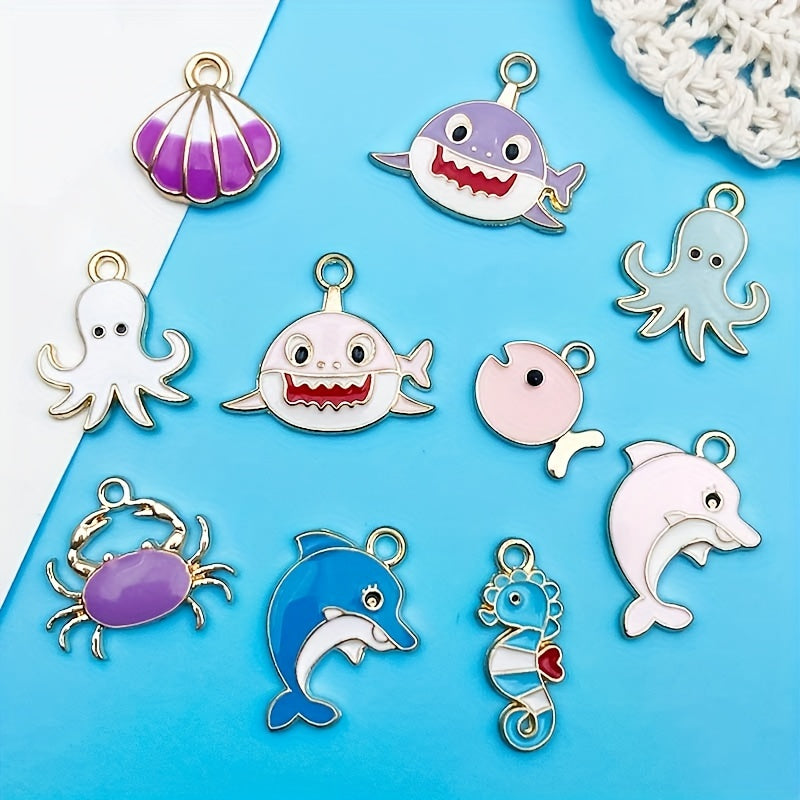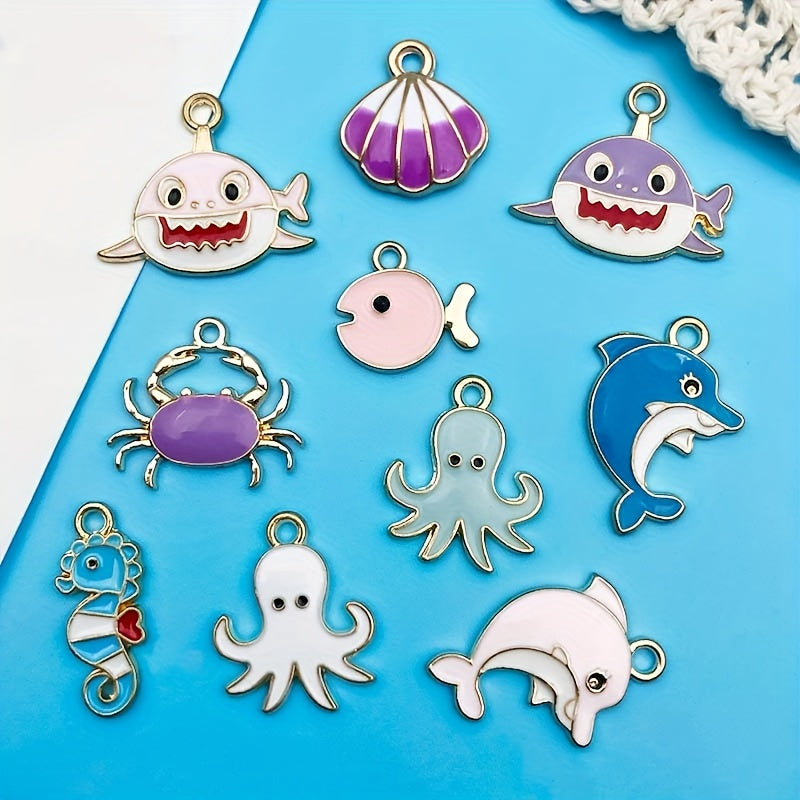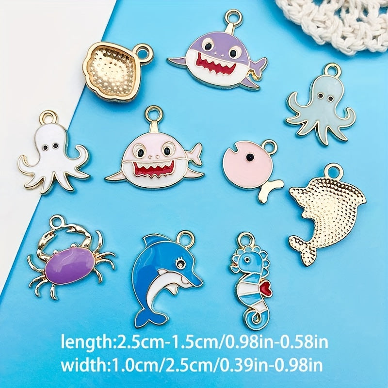 Get creative with these 10pcs alloy enamel marine life pendant charms featuring designs like crab, whale, shark, octopus, and shell. Perfect for necklaces, bracelets, earrings, and various craft projects.