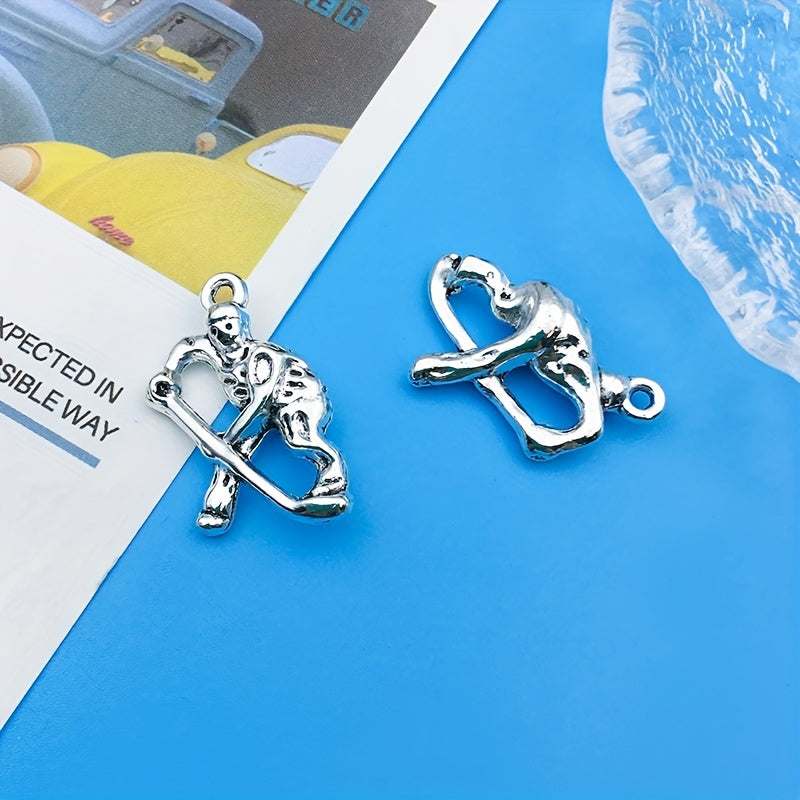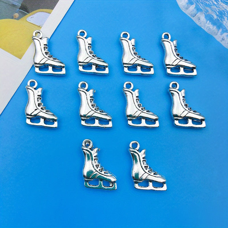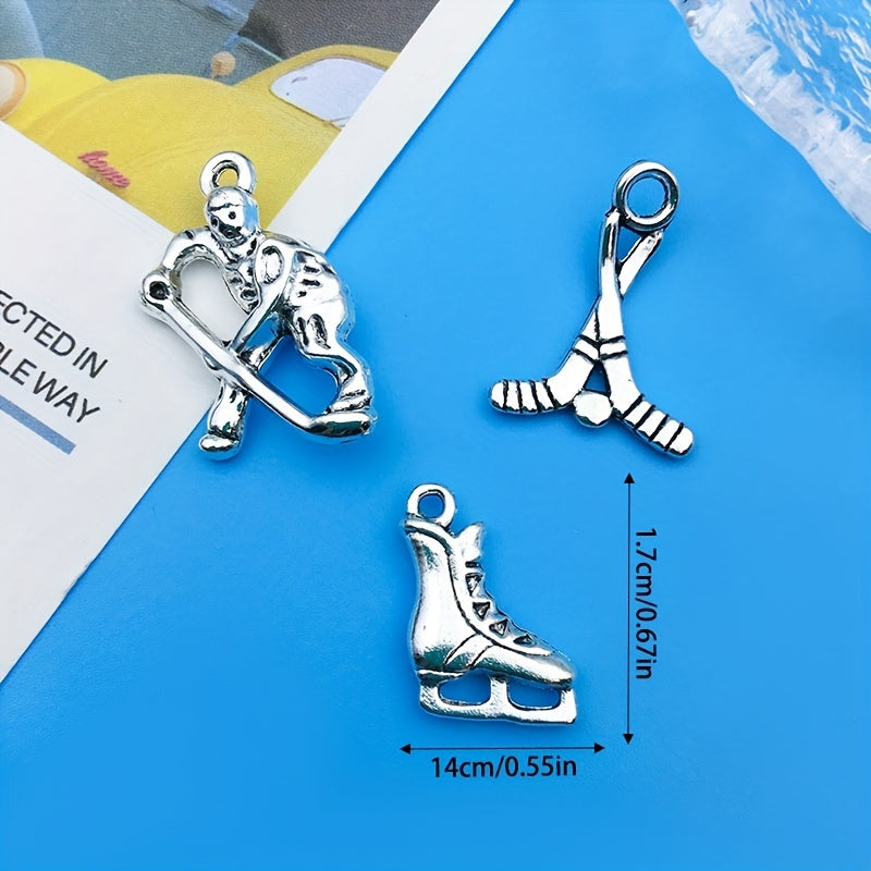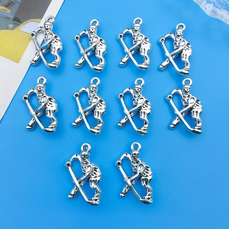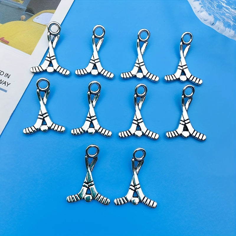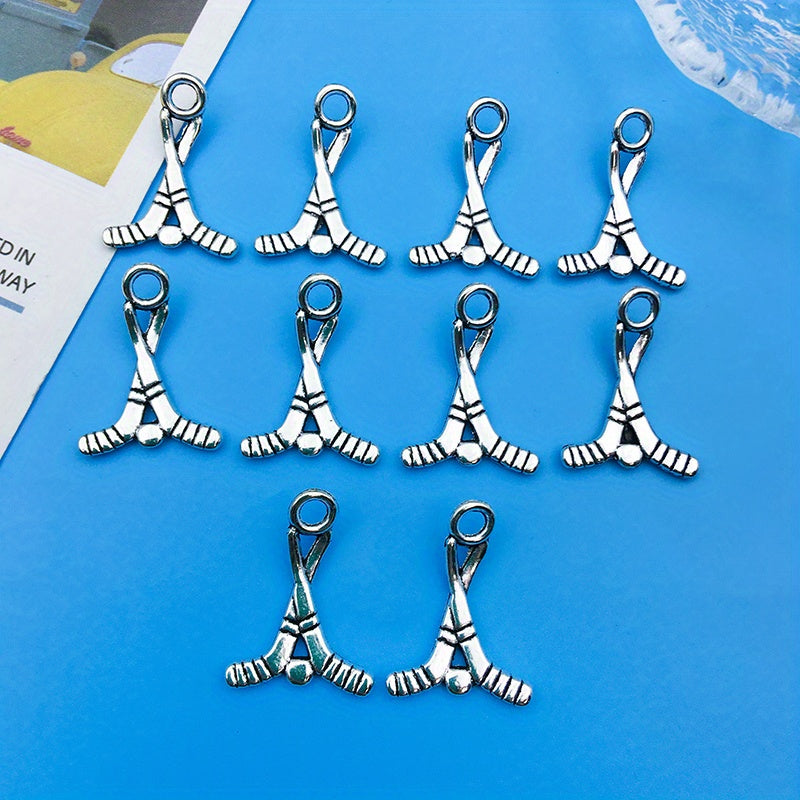 This set includes 10 zinc alloy antique silvery hockey pendants ideal for creating unique necklaces, bracelets, and earrings. Perfect for sports enthusiasts and crafters.