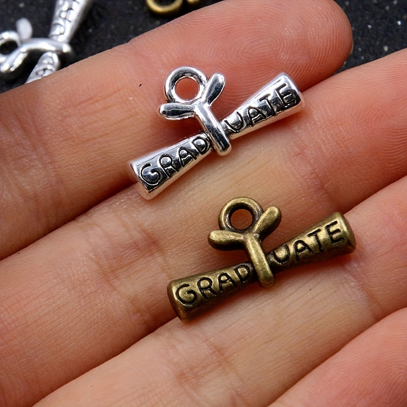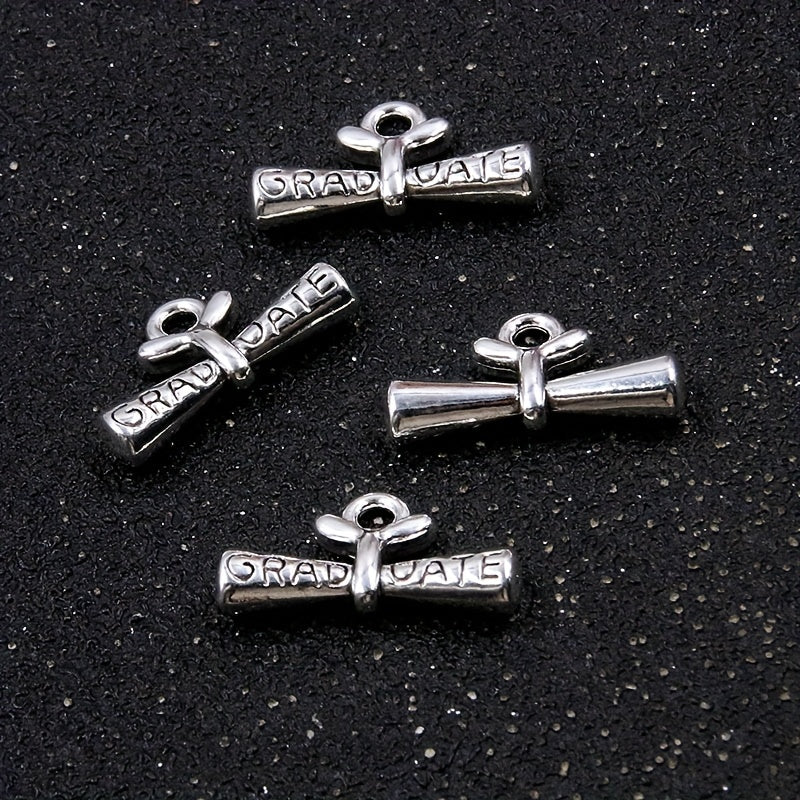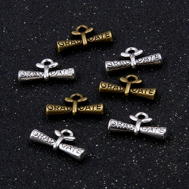 Get this set of 10 vintage-inspired alloy graduation scroll pendants to create stunning necklaces, earrings, or keychains. Perfect for DIY jewelry making.