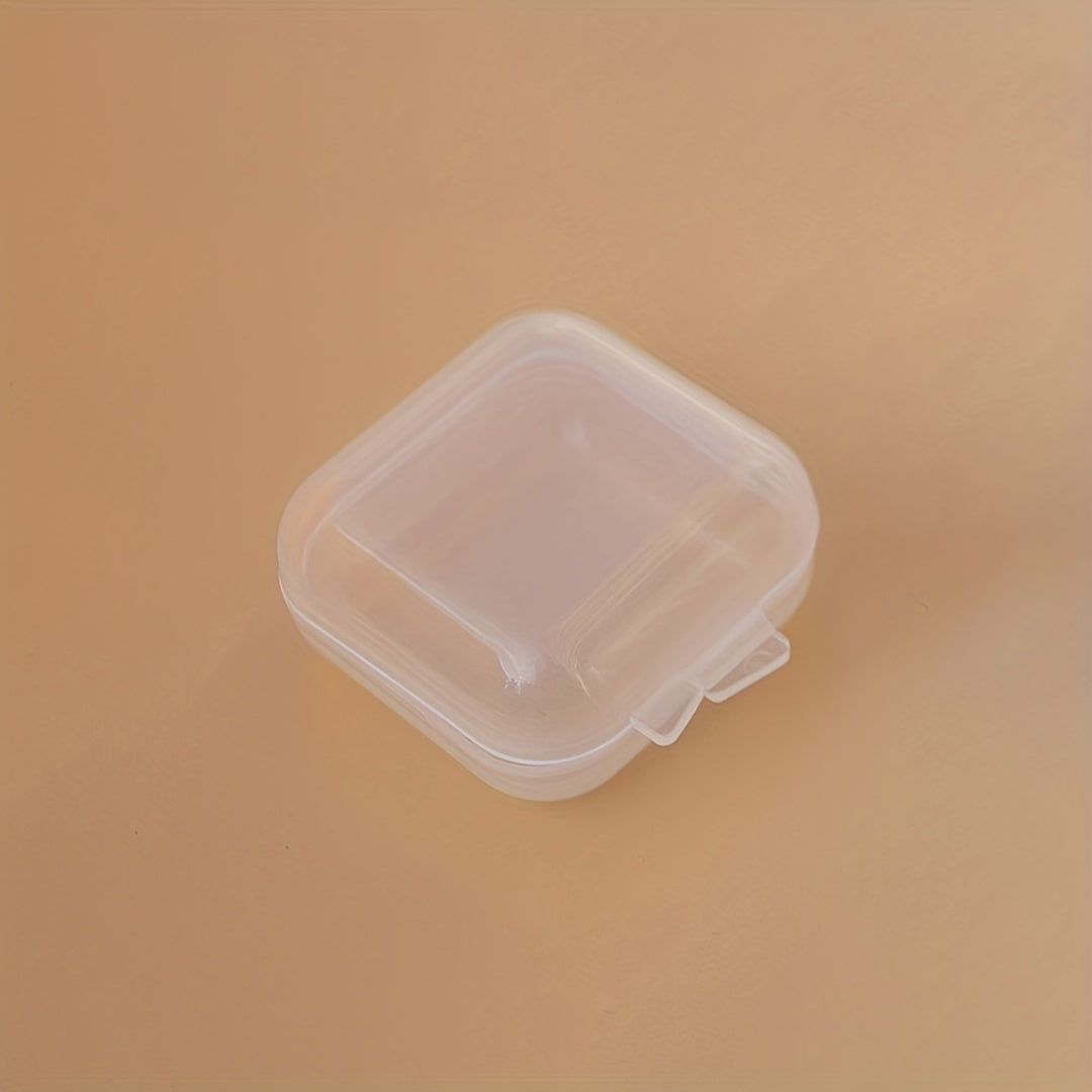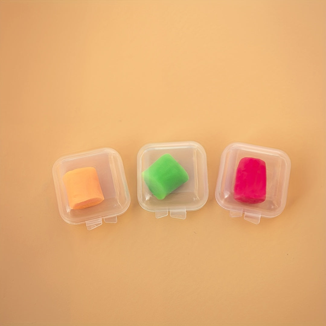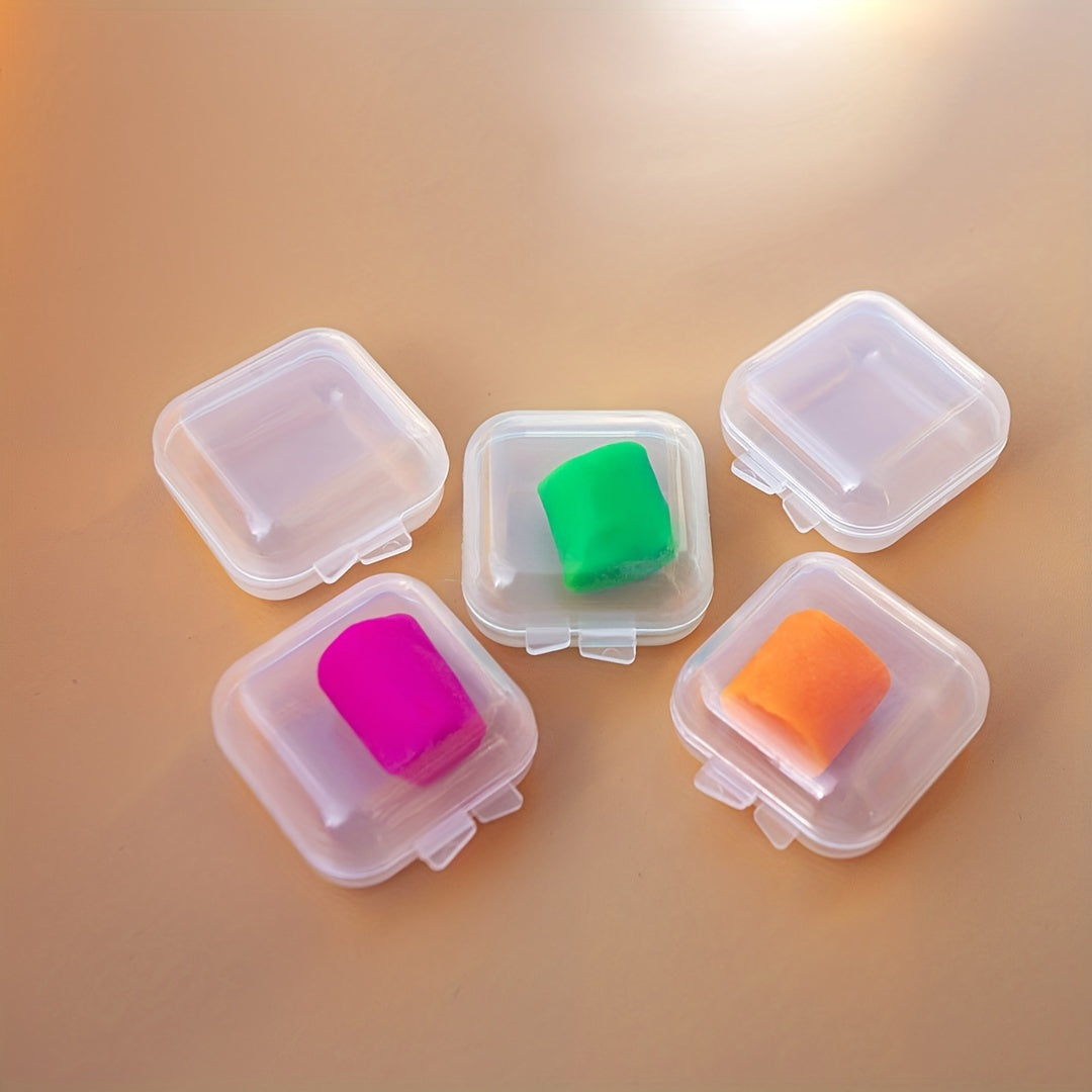 Keep your ear plugs organized with these transparent plastic storage boxes. Each box is small and square, perfect for storing ear plugs securely.